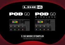 ® ® 2.50 MODE D’EMPLOI 40-00-0568 Rev G (pour le système V2.50 du POD Go) © 2025 Yamaha Guitar Group, Inc. Tous droits réservés. 40-00-0408 Rev A (For use with POD Go Firmware 2.65) ©2018 Yamaha Guitar Group, Inc. Sommaire Bienvenue dans l’univers POD Go 4 Terminologie commune 4 Mise à jour avec la dernière version du firmware POD Go 5 Marketplace5 Façade6 Panneau arrière 8 Démarrage rapide 9 Connexions9 Configuration sans fil 10 Ecran Play 12 Ecran Edit 13 Sélection de blocs/réglage de paramètres 13 Choix du modèle d’un bloc 14 Déplacer des blocs 14 Copier et coller un bloc 14 Réglages ‘User Default’ 15 ‘Preset List’ 15 Sauvegarder et nommer un preset 16 TAP Tempo 16 Accordeur17 Les blocs 18 Entrée et sortie 18 Amp/Preamp18 Cab/IR21 Modèles Legacy Cab 23 Effets25 Looper31 Preset EQ 32 Wah/Volume33 FX Loop 33 Marques déposées aux Etats-Unis 34 Snapshots35 Utiliser des snapshots Personnaliser le label et la couleur LED d’un commutateur snapshot Sauvegarder des snapshots Astuces pour une utilisation créative des snapshots 35 36 37 37 Bypass/Control38 Assignation rapide de bypass Assignation rapide de contrôleur Assignation manuelle de bypass/contrôleur Supprimer les assignations d’un bloc Supprimer toutes les assignations Echanger des commutateurs en mode Stomp Personnaliser le label et la couleur LED d’un commutateur d’effet 38 38 39 39 40 40 40 Egaliseur global 41 Initialiser Global EQ 41 Réglages globaux 42 Initialiser tous les réglages globaux Global Settings > Ins/Outs Global Settings > Wireless Global Settings > Preferences Global Settings > Switches/Pedals Global Settings > MIDI/Tempo 42 43 43 43 44 45 USB Audio/MIDI 46 Ecoute via le matériel ou via le logiciel DAW Enregistrement DI et re-amping Régler le pilote Core Audio (macOS uniquement) Régler le pilote ASIO (Windows uniquement) Sélection de groupe et de presets via MIDI Chargement de snapshot via MIDI Messages de contrôle MIDI (CC) 46 46 48 48 49 49 50 Ressources supplémentaires 51 FCC ID: UOB-G10TII IC: 6768A-G10TII © 2025 Yamaha Guitar Group, Inc. Tous droits réservés. A noter: Yamaha Guitar Group, Line 6, le logo Line 6, Ampeg, SVT, Portaflex, POD Go, Powercab, Relay, DL4, DM4, MM4, FM4, M13, M9, M5, Helix et HX sont des marques commerciales ou déposées de Yamaha Guitar Group, Inc. aux Etats-Unis et/ou dans d’autres pays. Apple, Mac, macOS, iPad, iPhone et iTunes sont des marques commerciales d’Apple, Inc. enregistrées aux Etats-Unis et dans d’autres pays. Apple décline toute responsabilité concernant le fonctionnement de ce dispositif voire sa conformité à des normes de sécurité et techniques. Windows est une marque déposée de Microsoft Corporation aux Etats-Unis et/ou dans d’autres pays. YouTube est une marque commerciale de Google, Inc. Les numéros de modèle et de série figurent sur l’étiquette du produit. Veuillez noter ces numéros ci-dessous et conserver ce document dans vos dossiers. Numéro de modèle: ________________________________ Numéro de série: ________________________________ Bienvenue dans l’univers POD Go Terminologie commune En lisant ce manuel, vous rencontrerez peut-être des termes que vous ne connaissez pas or il est important de bien les comprendre. Bloc Les blocs sont des objets représentant divers aspects d’un son: ampli, enceintes, effets, Looper, entrées, sorties et réponses impulsionnelles (IR). Le POD Go permet d’utiliser simultanément un bloc d’ampli/ préampli, un bloc d’enceinte/IR, un bloc wah, un bloc de pédale de volume, un bloc d’égalisation de preset, un bloc de boucle d’effet et jusqu’à 4 blocs d’effets. Un manuel? Rien à faire d’un manuel! Peut-être mais vous pourriez rater des astuces et des raccourcis pratiques qui vous aident à créer de meilleurs sons et à accélérer le processus. Heureusement, nous avons fait une série de vidéos pour ceux qui n’aiment vraiment pas lire. Rendez-vous ici: line6.com/meet-pod-go. Modèle Chaque bloc peut se voir assigner un modèle. Le POD Go contient des centaines de modèles d’amplificateurs pour guitare et basse, d’enceintes et d’effets Vous trouverez les listes complètes des modèles et du matériel dont ils s’inspirent à la page 18. Preset Un preset est un son. Il est constitué de tous les blocs, réglages de paramètres, snapshots, assignations aux commutateurs au pied et aux contrôleurs. Envoi/ Les prises stéréo TRS d’envoi (Send) et de retour (Return) permettent Retour d’insérer vos pédales favorites n’importe où dans le flux du signal ou de brancher votre ampli de guitare avec la méthode 4 câbles. Voyez “Paramètres ‘FX Loop’” à la p. 33. IR Les réponses impulsionnelles (IR) sont des fonctions mathématiques représentant les mesures sonores de systèmes audio et servent en général à restituer le son d’enceintes. Le POD Go peut sauvegarder jusqu’à 128 IR personnelles ou de tierces parties.* Voyez “Cab/IR” à la p. 21. POD Go, POD Go Wireless… Quelle est la différence? REMARQUE: Pour importer des IR dans votre POD Go, il faut télécharger et installer la dernière version de l’application Line 6 POD Go Edit. POD Go Edit permet d’utiliser un ordinateur Mac ou Windows® pour créer et gérer des bibliothèques de presets et de réponses impulsionnelles (IR), éditer et sauvegarder vos presets, sauvegarder et récupérer des copies de secours de tout l’appareil ainsi que mettre votre dispositif à jour – le tout gratuitement Rendez-vous sur line6.com/software pour la télécharger. Le POD® Go Wireless est équipé d’un récepteur sans fil Line 6® Relay® et est fourni avec un émetteur sans fil Line 6 Relay G10TII. Il peut charger l’émetteur via sa prise GUITAR IN et comprend un orifice de stockage pratique en face arrière pour ranger l’émetteur durant le transport. A part cela, les deux appareils sont pratiquement identiques. Quand nous parlons de “POD Go