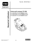Form No. 3474-315 Rev A Porte-outil compact TX 550 N° de modèle 22374—N° de série 400000000 et suivants N° de modèle 22374G—N° de série 400000000 et suivants N° de modèle 22374HD—N° de série 400000000 et suivants N° de modèle 22377—N° de série 400000000 et suivants Enregistrez votre produit à www.Toro.com. Traduction du texte d'origine (FR) *3474-315* Ce produit est conforme à toutes les directives européennes pertinentes. Pour plus de renseignements, reportez-vous à la Déclaration de conformité spécifique du produit fournie séparément. Cette machine est un porte-outil compact prévu pour transporter la terre et autres matériaux utilisés dans les travaux de paysagement et de construction. Elle est conçue pour fonctionner avec un large choix d'outils spécialisés. L'utilisation de ce produit à d'autres fins que celle prévue peut être dangereuse pour vous-même et pour les personnes à proximité. Ne modifiez pas la machine ou ses outils. Vous commettez une infraction à la section 4442 ou 4443 du Code des ressources publiques de Californie si vous utilisez cette machine dans une zone boisée, broussailleuse ou recouverte d'herbe à moins d'équiper le moteur d'un pare-étincelles, tel que défini à la section 4442, maintenu en bon état de marche, ou à moins de construire, équiper et entretenir le moteur de manière à prévenir les incendies. Cette machine doit être utilisée, révisée et réparée uniquement par des professionnels connaissant bien ses caractéristiques ainsi que les procédures de sécurité pertinentes. Le manuel du propriétaire du moteur ci-joint est fourni à titre informatif concernant la réglementation de l'Agence américaine pour la protection de l'environnement (EPA) et la réglementation antipollution de l'état de Californie relative aux systèmes antipollution, à leur entretien et à leur garantie. Vous pouvez vous en procurer un nouvel exemplaire en vous adressant au constructeur du moteur. Utilisez cette machine à des températures ambiantes comprises entre -18 et 38 °C. Contactez votre concessionnaire-réparateur agréé pour connaître les dispositions nécessaires pour utiliser cette machine dans des températures extrêmes. Lisez attentivement cette notice pour apprendre comment utiliser et entretenir correctement votre produit, et éviter ainsi de l'endommager ou de vous blesser. Vous êtes responsable de l'utilisation sûre et correcte du produit. ATTENTION Rendez-vous sur www.Toro.com pour tout document de formation à la sécurité et à l'utilisation des produits, pour tout renseignement concernant un produit ou un accessoire, pour obtenir l'adresse des concessionnaires ou pour enregistrer votre produit. CALIFORNIE Proposition 65 - Avertissement L'état de Californie considère les gaz d'échappement des moteurs diesel et certains de leurs composants comme susceptibles de provoquer des cancers, des malformations congénitales et autres troubles de la reproduction. Les bornes de la batterie et accessoires connexes contiennent du plomb et des composés de plomb. L'état de Californie considère ces substances chimiques comme susceptibles de provoquer des cancers et des troubles de la reproduction. Lavez-vous les mains après avoir manipulé la batterie. L'utilisation de ce produit peut entraîner une exposition à des substances chimiques considérées pas l'état de Californie comme capables de provoquer des cancers, des anomalies congénitales ou d'autres troubles de la reproduction. Pour obtenir des prestations de service, des pièces d'origine Toro ou des renseignements complémentaires, munissez-vous des numéros de modèle et de série du produit et contactez un concessionnaire-réparateur agréé ou le service client Toro. La Figure 1 indique l'emplacement des numéros de modèle et de série sur le produit. Inscrivez les numéros dans l'espace réservé à cet effet. Important: Avec votre appareil mobile, vous pouvez scanner le QR code sur l'autocollant du numéro de série (le cas échéant) pour accéder aux renseignements sur la garantie, les pièces détachées et autres informations concernant le produit. Introduction © 2025—The Toro® Company 8111 Lyndale Avenue South Bloomington, MN 55420 2 Contactez-nous sur www.Toro.com. Imprimé aux États-Unis Tous droits réservés Ce manuel utilise également deux autres termes pour faire passer des informations essentielles : Important pour attirer l'attention sur des informations d'ordre mécanique spécifiques, et Remarque pour souligner des informations d'ordre général méritant une attention particulière. Table des matières Sécurité .................................................................... 4 Consignes de sécurité générales........................ 4 Autocollants de sécurité et d'instruction .............. 5 Vue d'ensemble du produit .......................................11 Commandes .................................................... 12 Caractéristiques techniques ............................ 16 Outils et accessoires......................................... 16 Avant l'utilisation .................................................. 16 Contrôles de sécurité avant l'utilisation ............. 16 Ajout de carburant ............................................ 17 Procédures d'entretien quotidien ...................... 19 Pendant l'utilisation ............................................. 19 Consignes de sécurité pendant l'utilisation ..................................................... 19 Démarrage du moteur....................................... 21 Conduire la machine......................................... 21 Arrêt du moteur................................................. 21 Utilisation des outils .......................................... 22 Après l'utilisation ................................................. 23 Consignes de sécurité après l'utilisation............ 23 Récupérer une machine enlisée ...