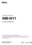 Poignée-alimentation Guide de référence • Lisez ce document attentivement avant d’utiliser le produit. • Pour utiliser correctement le produit, veuillez lire la section « Pour votre sécurité » (page 5). • Après avoir lu ce document, rangez-le dans un endroit facilement accessible pour pouvoir vous y référer ultérieurement. SB5D01(13) © 2025 Nikon Corporation 6MFC4113-01 Fr Table des matières Introduction. . . . . . . . . . . . . . . . . . . . . . . . . . . . . . . . . . . . . . . . . . . . . . . . . . . . . . . . . . . . . . . . . . . . . . 3 Avant de commencer. . . . . . . . . . . . . . . . . . . . . . . . . . . . . . . . . . . . . . . . . . . . . . . . . . . . . . . . . . . . . . . . . . . . . 3 Appareils photo compatibles. . . . . . . . . . . . . . . . . . . . . . . . . . . . . . . . . . . . . . . . . . . . . . . . . . . . . . . . . . . . . . 4 Pour votre sécurité. . . . . . . . . . . . . . . . . . . . . . . . . . . . . . . . . . . . . . . . . . . . . . . . . . . . . . . . . . . . . . . . . . . . . . . 5 Utilisation de la MB-N11. . . . . . . . . . . . . . . . . . . . . . . . . . . . . . . . . . . . . . . . . . . . . . . . . . . . . . . . . . . . 9 Nomenclature de la MB-N11 : noms et fonctions. . . . . . . . . . . . . . . . . . . . . . . . . . . . . . . . . . . . . . . . . . . . 9 Fixation de la MB-N11. . . . . . . . . . . . . . . . . . . . . . . . . . . . . . . . . . . . . . . . . . . . . . . . . . . . . . . . . . . . . . . . . . . 14 Insertion des accumulateurs dans la MB-N11. . . . . . . . . . . . . . . . . . . . . . . . . . . . . . . . . . . . . . . . . . . . . . 16 Utilisation d’un adaptateur secteur pour recharger l’accumulateur. . . . . . . . . . . . . . . . . . . . . . . . . . . . 20 Utilisation d’un adaptateur secteur pour alimenter l’appareil photo. . . . . . . . . . . . . . . . . . . . . . . . . . . 24 Vérification du niveau de charge des accumulateurs de la MB-N11. . . . . . . . . . . . . . . . . . . . . . . . . . . . 26 Précautions d’utilisation. . . . . . . . . . . . . . . . . . . . . . . . . . . . . . . . . . . . . . . . . . . . . . . . . . . . . . . . . . . . . . . . . 27 Remarques techniques. . . . . . . . . . . . . . . . . . . . . . . . . . . . . . . . . . . . . . . . . . . . . . . . . . . . . . . . . . . . 28 Si le volet du logement pour porte-accumulateurs se détache. . . . . . . . . . . . . . . . . . . . . . . . . . . . . . . . 28 Caractéristiques techniques. . . . . . . . . . . . . . . . . . . . . . . . . . . . . . . . . . . . . . . . . . . . . . . . . . . . . . . . . . . . . . 29 Mentions légales. . . . . . . . . . . . . . . . . . . . . . . . . . . . . . . . . . . . . . . . . . . . . . . . . . . . . . . . . . . . . . . . . . . . . . . 31 2 Table des matières Introduction Avant de commencer Avant d’utiliser ce produit, veuillez lire ces instructions attentivement. Consultez également la documentation fournie avec l’appareil photo pour plus de détails. Il est possible d’insérer jusqu’à deux accumulateurs EN-EL15c dans la MB-N11 pour alimenter l’appareil photo, lorsque la poignée-alimentation est fixée à un appareil photo compatible. Pour obtenir des informations sur les appareils photo compatibles, reportez-vous à « Appareils photo compatibles » ( 0 4). Veillez à mettre à jour le firmware de l’appareil photo. Avec les versions antérieures de firmware, certaines fonctions peuvent ne pas être disponibles ou l’appareil photo risque de ne pas parvenir à détecter correctement le produit. Les derniers firmwares sont accessibles via le Centre de téléchargement Nikon. https://downloadcenter.nikonimglib.com/ 3 Avant de commencer Appareils photo compatibles La MB-N11 peut être utilisée avec les appareils photo suivants. Utilisez la MB-N11 uniquement avec les appareils photo compatibles. Z7II Z6II Z5II 4 Appareils photo compatibles Pour votre sécurité Afin d’éviter de provoquer des dommages matériels ou de vous blesser ou de blesser un tiers, lisez intégralement « Pour votre sécurité » avant d’utiliser ce produit. Après avoir lu ces consignes de sécurité, rangez-les dans un endroit facilement accessible pour pouvoir vous y référer ultérieurement. DANGER : le non-respect des consignes indiquées par cette icône expose à un danger de mort ou à de graves blessures. AVERTISSEMENT : le non-respect des consignes indiquées par cette icône peut vous exposer à un danger de mort ou à de graves blessures. ATTENTION : le non-respect des consignes indiquées par cette icône peut vous exposer à des blessures ou provoquer des dommages matériels. AVERTISSEMENT Ne démontez pas ou ne modifiez pas ce produit. Ne touchez pas les composants internes qui sont exposés suite à une chute ou à un autre accident. Le non-respect de ces consignes peut provoquer un choc électrique ou d'autres blessures. Si vous observez des anomalies provenant du produit comme de la fumée, de la chaleur ou des odeurs inhabituelles, retirez immédiatement l'accumulateur ou débranchez immédiatement la source d'alimentation. Continuer d’utiliser le matériel risque de provoquer un incendie, des brûlures ou d'autres blessures. Gardez votre matériel au sec. Ne le manipulez pas avec les mains mouillées. Ne manipulez pas la prise avec les mains mouillées. Le non-respect de ces consignes peut provoquer un incendie ou un choc électrique. Ne laissez pas votre peau en contact prolongé avec ce produit lorsqu'il est sous tension ou lorsqu'il est branché. Le non-respect de cette consigne peut provoquer des brûlures superficielles. 5 Pour votre sécurité AVERTISSEMENT Ne court-circuitez pas les contacts de la poignée-alimentation ou du porte-accumulateurs. Le non-respect de cette consigne peut provoquer la fuite, la surchauffe, la casse ou l’inflammation des accumulateurs. N'utilisez pas ce produit en présence de poussières ou de gaz inflammables comme du propane, de l'essence ou des aérosols. Le non-respect de 
