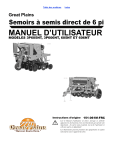 Table des matières Index Great Plains Semoirs à semis direct de 6 pi MANUEL D’UTILISATEUR MODÈLES 3P605NT, 3P606NT, 605NT ET 606NT 25106 25105 Instructions d'origine ! 151-061M-FRC Lire le Manuel d’utilisateur en entier. Lorsque ce symbole apparaît, les instructions et les avertissements qui suivent sont importants – les suivre sans exception. La vie de l’opérateur et celle des autres en dépendent! Les illustrations peuvent présenter des équipements en option non fournis avec l’appareil de série. Identification de l’outil Enregistrer les détails de l’outil dans le registre ci-dessous. Si ce manuel est remplacé, s’assurer de transférer cette information au nouveau manuel. Si l’utilisateur ou le concessionnaire a ajouté des options qui n’étaient pas commandées initialement avec l’outil, ou qu’ils ont retiré des options qui avaient été commandées initialement, les poids et les mesures indiquées ne sont plus exacts pour l’outil. Mettre à jour le poids et les mesures de l’outil consignés au registre avec le poids et les mesures des options. Numéro de modèle Numéro de série Hauteur de l’outil Longueur de l’outil Largeur de l’outil Poids de l’outil Année de construction Date de livraison Première mise en marche Accessoires Coordonnées du concessionnaire Nom : Rue : Ville/province ou état : Numéro de téléphone : Courriel : No de client du concessionnaire : Proposition 65 de la Californie AVERTISSEMENT : La manipulation de pièces de véhicules passagers ou de véhicules hors route à moteur peut vous exposer à des produits chimiques comme les phtalates ou le plomb, qui peuvent causer le cancer ou des troubles de la reproduction. Afin de réduire le risque d’exposition, il est recommandé de procéder à l’entretien du véhicule dans un espace bien ventilé, de porter des gants et de se laver les mains. Se référer à www.P65Warnings.ca.gov/motor-vehicle-parts pour de plus amples informations. À notre client : Félicitations pour l’achat de votre produit Great Plains. Great Plains vous souhaite la bienvenue au sein de sa famille grandissante de nouveaux propriétaires de produits. Votre produit a été conçu avec soin et construit par des travailleurs compétents à partir de matériaux de qualité. Votre concessionnaire a effectué l’intervention préliminaire sur votre outil et vous expliquera quelles sont les bonnes pratiques d’entretien et d’utilisation à suivre pour l’exploiter de manière satisfaisante et prolonger sa durée de vie. N’hésitez pas à contacter votre concessionnaire si vous avez une question concernant votre outil. Votre outil a été conçu pour fonctionner efficacement dans la plupart des conditions opérationnelles possibles et son rendement dépendra de l’entretien qu’il reçoit. Si vous souhaitez recevoir un service à la clientèle ou commander des pièces de rechange, prenez contact avec votre concessionnaire, qui mettra à votre disposition des employés compétents, des pièces de rechange et un équipement spécialement conçu pour vos produits Great Plains. Lisez le présent manuel attentivement avant d’utiliser l’outil. Il vous permettra de comprendre les mesures de sécurité, le fonctionnement, les réglages et l’entretien à effectuer sur votre nouvel équipement. Le présent manuel doit toujours rester avec votre outil. Great Plains souhaite que vous soyez satisfait de votre produit. Si pour une quelconque raison certaines sections du présent manuel ne semblent pas claires ou pour signaler toute insatisfaction au sujet du produit, veuillez suivre la procédure suivante en premier : 1. Aborder la question avec le directeur de service du concessionnaire. Informez-le du problème rencontré pour qu’il puisse vous aider. 2. Si vous restez insatisfait, adressez-vous au propriétaire ou au directeur général de la concession. Si le concessionnaire n’est pas en mesure de régler le problème ou s’il concerne des pièces de rechange, merci de contacter : Great Plains Service Department 1525 E. North St. P.O. Box 5060 Salina, KS 67402-5060 É.-U. Imprimé le 27 mai 2025 | Français Great Plains se réserve le droit de réviser et d’améliorer la qualité de ses produits à tout moment. La présente publication décrit l’état de ce produit au moment de sa divulgation et peut ne pas refléter le produit à l’avenir. Le contenu de la présente publication peut être modifié sans préavis. © 2024 Great Plains | Imprimé aux États-Unis d’Amérique Tous droits réservés. Il est interdit de reproduire, distribuer ou transmettre sous quelque forme ou par quelque moyen que ce soit, y compris par photocopie, par enregistrement ou par toute autre méthode électronique ou mécanique, une partie quelconque de la présente publication sans la permission écrite préalable de l’éditeur, sauf s’il s’agit d’une brève citation faisant partie d’un avis critique ou à certaines autres fins non commerciales autorisées par la législation sur les droits d’auteur. Les marques de commerce de Great Plains Manufacturing, Inc. comprennent : AccuShot, DrillCommand, Max-Chisel, Row-Pro, Singulator Plus, Short Disk, Swath Command, Terra-Tine, Ultra-Chisel et X-Press. Les marques déposées de Great Plains Manufacturing, Inc. comprennent : Air-Pro, Clear-Shot, Discovator, Great Plains, Land Pride, MeterCone, Nutri-Pro, Seed-Lok, Solid Stand, Terra-Guard, Turbo-Chisel, Turbo-Chopper, Turbo-Max, Turbo-Trill, Ultra-Till, Whirlfilter et Yield-Pro. Les noms de marques et de produits qui apparaissent et qui sont la propriété d’autres entités sont des marques déposées des propriétaires respectifs. Veuillez écrire à l’adresse ci-dessous pour toute demande de permission à l’éditeur. Great Plains Mfg. 1525 E. North St. P.O. Box 5060 Salina, KS 67402 É.-U. Le catalogue complet comprenant ce manuel et d’autres manuels est disponible sur notre site Web à l
