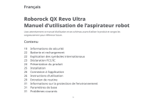 Français Roborock QX Revo Ultra Manuel d’utilisation de l’aspirateur robot Lisez attentivement ce manuel d’utilisation et ses schémas avant d’utiliser le produit et rangez-les soigneusement pour référence future. Contenu 19 22 22 23 24 25 26 26 29 31 31 31 Informations de sécurité Batterie et rechargement Explication des symboles internationaux Déclaration FCC/IC Présentation du produit Installation Connexion à l’application Instructions d’utilisation Entretien de routine Informations sur la protection de l’environnement Paramètres de base Problèmes courants 18 Informations de sécurité AVERTISSEMENT • Uniquement prévu pour une utilisation avec une station d’accueil Roborock EWFD40LRR. • Le produit doit être éteint et sa fiche doit être débranchée de la prise électrique lorsqu’il n’est pas utilisé, avant de le nettoyer ou de l’entretenir. • Doit être branché sur une prise de courant avec mise à la terre. Voir les instructions de mise à la terre. • La station d’accueil ne peut être utilisée que pour recharger l’aspirateur robot équipé d’une batterie lithium-ion 14,4 V/5 200 mAh (capacité typique). ATTENTION • Utilisez uniquement le produit conformément au manuel d’utilisation. L’utilisateur sera tenu pour responsable de toute perte ou de tout dommage résultant d’une utilisation incorrecte. • Ne permettez pas l’utilisation de l’appareil comme un jouet. Il est nécessaire d’être particulièrement attentif lorsque l’appareil est utilisé par des enfants ou à proximité d’enfants. • Ne rincez pas le robot ni la station d’accueil. • N’utilisez pas le produit sur des objets durs ou tranchants (tels que des débris de décoration, du verre et des clous), afin d’éviter de le rayer, de rayer sa station d’accueil ou de rayer le sol. • Assurez-vous que le bac à poussière, le filtre lavable, le sac à poussière, la brosse latérale, les serpillières, les brosses principales et le cache des brosses principales sont en place avant de lancer un nettoyage. • Ne vous tenez pas assis ou debout sur le robot ou sa station d’accueil. • N’utilisez aucun désinfectant et n’utilisez que la solution de nettoyage recommandée par Roborock afin d’éviter toute corrosion ou tout dommage. • Ne placez pas d’objets bas (tels que des chaussures ou des tapis) à proximité des zones surélevées comme des escaliers. Sinon, le robot pourrait tomber à cause d’un dysfonctionnement des capteurs. • Afin d’éviter tout dommage lié à l’eau, veillez à ce qu’il n’y ait pas d’eau sur le sol sur lequel le robot fonctionne. • Ne faites pas fonctionner le produit dans une pièce où un nourrisson ou un enfant dort. • Avant d’utiliser le produit, retirez les divers objets présents au sol, tels que les câbles et les objets instables, fragiles, précieux ou dangereux, afin d’éviter qu’ils ne soient traînés par le robot et que cela n’entraîne des blessures ou des dégâts matériels. • Tenez les cheveux, les poils, les vêtements amples, les doigts et toutes les parties du corps des personnes et des animaux 19 à l’écart des jonctions, des ouvertures et des pièces mobiles du produit afin d’éviter tout risque de blessure. • Ne transportez pas le robot à l’aide de son pare-chocs vertical, de son capot supérieur magnétique, de sa brosse latérale ou de son pare-chocs. Ne déplacez pas la station d’accueil en la soulevant directement par sa base, les poignées des réservoirs d’eau ou le couvercle du conteneur à poussière. • Placez la station d’accueil sur un sol dur et plat. Gardez la station d’accueil, le robot et le câble d’alimentation à l’écart du feu et des sources de chaleur telles que des radiateurs. Évitez les espaces humides ou étroits ou les lieux où le robot risque d’être suspendu dans l’air. • Ce produit peut être utilisé par des enfants âgés de 8 ans ou plus et par des personnes dont les capacités physiques, sensorielles ou mentales sont réduites ou qui manquent d’expérience et de connaissances si elles sont surveillées ou ont reçu des instructions sur l’utilisation sécurisée du produit et comprennent les risques impliqués. Les enfants ne doivent pas jouer avec ce produit. Le nettoyage et l’entretien utilisateur ne doivent pas être effectués par des enfants sans surveillance. • Ne démontez pas, ne réparez pas ou ne modifiez pas la batterie ou la station de chargement. • Si la station d’accueil est placée dans une zone susceptible d’être sujette à des orages ou à une tension instable, prenez des mesures de protection. • N’utilisez pas le produit sur des moquettes ou tapis à poils longs. Il est en outre possible que l’efficacité du produit soit réduite sur les moquettes ou tapis sombres. • Ne placez aucun objet sur le robot ou sa station d’accueil ou près de l’entrée d’aspiration de la station d’accueil. Ne les recouvrez également d’aucun objet (housse anti-poussière comprise). • N’utilisez pas ce produit sur des surfaces en hauteur sans barrières, par exemple, sur le sol d’une mezzanine, une terrasse ouverte ou le dessus d’un meuble. • N’utilisez pas la station d’accueil pour recueillir des cailloux, des morceaux de papier ou d’autres objets qui pourraient obstruer le tuyau d’air. • Ne faites pas fonctionner le produit s’il a été endommagé de quelque manière que ce soit. Contactez le Service clientèle pour obtenir de l’aide. • Faites toujours fonctionner l’appareil dans des endroits bien aérés pour éviter toute surchauffe. • Roborock décline toute responsabilité en cas de dommages indirects, punitifs, accidentels ou consécutifs résultant de l’utilisation, de la mauvaise utilisation ou de l’incapacité à utiliser ce produit. La présente clause de non-responsabilité n’affecte aucun droit prévu par la loi qui ne pourrait