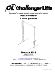 MANUEL D'INSTALLATION, D’UTILISATION ET D’ENTRETIEN Pont élévateur à deux poteaux MODÈLE E15 15000 LBS CAPACITÉ 1134KG/3750 IBS. PAR BRAS 2311 South Park Rd Louisville, Kentucky 40219 E-mail : [email protected] Téléphone : 800-648-5438 IMPORTANT : VEUILLEZ LIRE ENTIÈREMENT CE MANUEL AVANT D’INSTALLER OU D’UTILISER LE PONT ÉLÉVATEUR E15-IOM-A 2024-09-30_FR Modèle E15 Installation, utilisation et entretien SPÉCIFICATIONS GÉNÉRALES Voir la Figure 1 A Hauteur de levage (Position maximale des patins vis) B Hauteur Totale C Largeur totale D Passage E Du sol à l'interrupteur de barre transversale supérieure F Portée minimale bras G Portée maximale bras H Hauteur patin vis K Intérieur poteaux Portée bras (Min.-Max.) Capacité de levage * Hauteur de plafond requise Moteur Tension Vitesse de montée** Charge max par bras E15 77 3/4" (1975mm) 14’-6” (4420mm) ou 16’-6” (5030mm) 147 1/16" (3735mm) 109 3/8" (2778mm) 13’-10” (4216mm) ou 15’-10” (4827mm) 36 1/2" (927mm) 55" (1395 mm) 5 1/4"/ 6 3/4" (133mm/171mm) 122 1/4" (3105mm) 36.5”-55” 15000 lbs 175" (4445 mm) 199” (5055 mm) 2HP, Monophasé, 50/60Hz 208-230 75 secondes 3750 lbs (1360kg) * Les capacités de levage font référence à des charges équitablement distribuées sur les quatre bras. ** Les vitesses de montée et descente peuvent varier en fonction du poids du véhicule. Fig 1a - Caractéristiques générales 6’ TO NEAREST OBSTRUCTION OR 7’ TO NEAREST WALL 168 “ (14’ – 0’) MIN. TO NEAREST OBSTRUCTION 168 “ (14’ – 0’) MIN. TO NEAREST OBSTRUCTION DRIVE ON DIRECTION Page 2 Fig1b - Plan de l’espace de travail 6' VERS OBSTACLE LE PLUS PROCHE OU 7' VERS MUR LE PLUS PROCHE 168 “ (14’ – 0’) MIN. VERS OBSTACLE LE PLUS PROCHE 168 “ (14’ – 0’) MIN. VERS OBSTACLE LE PLUS PROCHE DIRECTION D'ENTRÉE E15-IOM-A 2024-09-30_FR Modèle E15 Installation, utilisation et entretien Des décalcomanies de sécurité, similaires à ESPACE VERTICAL celles illustrées ici doivent être apposées sur un Vérifier la hauteur du local où installer le pont pont élévateur correctement installé. Veiller à ce élévateur. Mesurer l'espace lorsque le pont est que toutes les décalcomanies de sécurité soient complètement soulevé. correctement placées sur les poteaux, de la Un espace insuffisant peut façon décrite dans ce manuel d’installation. être la cause d'une Vérifier que tous les opérateurs autorisés !"#A%A& performance insatisfaisante connaissent l'emplacement des décalcomanies du pont élévateur, de et comprennent leur sens. Remplacer les dommages aux biens ou de blessures. décalcomanies usées, estompées ou SOL endommagées dès que possible. Veiller à ce que l'état du béton soit adéquat et puisse Ne pas tenter de soulever supporter le pont chargé. Le sol en béton doit être en !"#A%A& un véhicule sur le pont bon état, sans grandes fissures, dégradations ou élévateur avant que celuieffritements. ci ait été correctement installé et ajusté de la Exigences minimales requises pour le béton : façon décrite dans ce manuel. épaisseur minimale 10,16 cm (4 pouces) avec renforts en acier, 3500 psi, durci pendant 28 jours à usage de local commercial. Le sol doit être horizontal dans une limite de 3/8 pouces sur la zone d'installation. Aucun ancrage ne doit être fixé à moins de 8 pouces d'une fissure, d'un bord ou d'un joint de dilatation. Si ces conditions ne peuvent être respectées, il est possible de réaliser un massif pour le pont élévateur. Vérifier avec les inspecteurs du bâtiment locaux et/ou le bureau des permis pour savoir si des instructions ou des autorisations spéciales sont requises pour l'installation. Contacter un professionnel qualifié pour obtenir les charges sismiques et toute autre exigence locale ou nationale. L'impossibilité du client de !"#A%A& fournir une surface de montage comme celle recommandée peut être la cause d'une performance insatisfaisante du pont élévateur, de dommages aux biens ou de blessures aux personnes. EMPLACEMENT Ce pont a été conçu pour être utilisé uniquement à l’intérieur à une température ambiante de 5° à 40°C (41– 104°F). EXIGENCES ÉLECTRIQUES Pour l’installation et l’utilisation du pont élévateur, un circuit dédié avec disjoncteur ou un fusible temporisé est nécessaire. Consulter le schéma de câblage pour le dimensionnement du circuit. CONSIGNES ET DÉCALCOMANIES DE SÉCURITÉ Pour votre sécurité et celle des autres, lire et comprendre toutes les consignes de sécurité et les décalcomanies incluses. LIRE INTÉGRALEMENT LE MANUEL AVANT D’ASSEMBLER, INSTALLER, UTILISER OU ENTRETENIR CET ÉQUIPEMENT. UN ENTRETIEN ET UNE INSPECTION CORRECTS SONT NÉCESSAIRES POUR UNE UTILISATION EN SÉCURITÉ. NE PAS UTILISER UN PONT ÉLÉVATEUR ENDOMMAGÉ. Page 3 E15-IOM-A 2024-09-30_FR Modèle E15 Installation, utilisation et entretien LIVRAISON INSTALLATION Inspecter avec attention le paquet au moment de la livraison. Le bordereau d'expédition signé est le reçu attestant que l'expédition s'est faite en de bonnes conditions. Si l'un des articles cités sur le bordereau d'expédition est absent ou endommagé, ne pas accepter la livraison tant que le transporteur n'a pas noter sur la facture de transporteur que des articles sont absents ou endommagés. Ceci sert à protéger le client. IMMÉDIATEMENT le Service Clientèle Snap-On Equipment en cas de INFORMER perte ou de dommage découverts après la réception. Un recouvrement pour perte ou dommage est plus difficile à résoudre une fois le reçu du transporteur signé. Envoyer une réclamation à Snap-On Equipment le plus rapidement possible. Joindre à la réclamation les copies de bordereau d'expédition, la facture de transporteur et des photos, si possible. Liste de colisage des composants QTÉ/PONT ÉLÉVATEUR DESCRIPTION E15-00-1 1 Assemblage poteau actif E15-00-2 1 E15-03-00 1 E15-HW-A 1 Boîtier matériel E15-