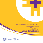HeartSine samaritan® PAD SAM 350P Trainer modèle TRN-350-1 Manuel de l’utilisateur HeartSine samaritan PAD 350P Trainer, modèle TRN-350-1 Ce Manuel de l’utilisateur explique comment faire fonctionner le HeartSine samaritan PAD 350P Trainer. Le HeartSine samaritan PAD 350P Trainer est un dispositif non médical destiné à la formation des services d’urgence pour une utilisation correcte du défibrillateur externe automatisé HeartSine samaritan PAD 350P. Le Trainer n’est pas destiné au traitement et ne doit pas être utilisé dans de véritables situations de sauvetage. IMPORTANT : de façon à éviter toute confusion en cas de véritable sauvetage, ne pas stocker ou laisser le Trainer près du défibrillateur externe automatisé HeartSine samaritan PAD 350. Pour faciliter son identification rapide, le HeartSine samaritan PAD 350P Trainer comporte une membrane interface utilisateur frontale jaune tandis que le défibrillateur externe automatisé HeartSine samaritan PAD 350P possède une membrane frontale bleu marine/noire. HeartSine recommande aux sauveteurs susceptibles d’utiliser ses défibrillateurs d’avoir également une formation en réanimation cardio-pulmonaire avec utilisation d’un défibrillateur (RCP-D). Le HeartSine samaritan PAD 350P Trainer est destiné à être utilisé par des formateurs RCP-D approuvés à cette fin. Le HeartSine samaritan PAD 350P Trainer est configuré en usine conformément aux directives communes de l’American Heart Association/European Resuscitation Council 2015 en matière de RCP. L’appareil est équipé de six scénarios préprogrammés s’appuyant sur ces directives. Si les directives RCP changent, un logiciel sera mis à disposition de façon à mettre à jour le HeartSine samaritan PAD 350P Trainer et le mettre en conformité. Contactez votre distributeur agréé HeartSine ou directement HeartSine Technologies. Dès sa mise sous tension, le HeartSine samaritan PAD 350P Trainer émet des instructions vocales accompagnant les indicateurs visuels. Le Trainer peut également être contrôlé manuellement à l’aide de la télécommande associée livrée avec l’appareil. Pour obtenir une liste des accessoires de remplacement, contactez votre distributeur HeartSine agréé. 2 www.heartsine.com Préparation du HeartSine samaritan PAD 350P Trainer 1) S’assurer que le HeartSine samaritan PAD 350P Trainer est complètement chargé (se reporter à la section Chargement de ce manuel). 2) Placer le HeartSine samaritan PAD 350P Trainer et le Trainer-Pak™ sur une surface plane. Insérer le Trainer-Pak dans le HeartSine samaritan PAD 350P Trainer en étant attentif au déclic garantissant sa bonne insertion. 3) Mettre en place les piles fournies avec votre Trainer dans la télécommande du HeartSine samaritan PAD 350. N’appuyer sur aucun bouton lors de l’insertion des piles de la télécommande dans la mesure où cela réinitialise l’ID de la télécommande. 4) Appuyer sur le bouton Marche/Arrêt du HeartSine samaritan PAD 350P Trainer et écouter l’instruction vocale afin de s’assurer du bon fonctionnement de l’appareil. 5) Si le HeartSine samaritan PAD 350P Trainer n’est pas suffisamment chargé, il ne fonctionnera pas correctement. Lors de la mise sous tension, le témoin lumineux d’état de marche clignote en rouge de façon à indiquer qu’un chargement est nécessaire. Si la batterie est complètement déchargée, l’appareil ne s’allume pas du tout. Pour obtenir les instructions relatives au chargement, se reporter à la section Chargement de ce manuel. Mise sous tension et hors tension du HeartSine samaritan PAD 350P Trainer Pour mettre sous tension le HeartSine samaritan PAD 350P Trainer, appuyer sur le bouton Marche/Arrêt vert. Le Trainer fonctionne par défaut avec le dernier scénario utilisé. Pour mettre hors tension le HeartSine samaritan PAD 350P Trainer, appuyer à nouveau sur le bouton Marche/Arrêt. Lorsque le HeartSine samaritan PAD 350P Trainer est sous tension, il peut être mis hors tension à l’aide de la télécommande associée. Pour mettre le Trainer hors tension, appuyer sur le bouton Arrêt (bouton rouge) de la télécommande. Lorsqu’il est sous tension, le HeartSine samaritan PAD 350P Trainer sera automatiquement mis hors tension après quinze minutes si l’appareil n’est pas utilisé. Manuel de l’utilisateur du HeartSine samaritan PAD 350P Trainer 3 HeartSine samaritan PAD 350P Trainer, modèle TRN-350-1 HeartSine samaritan PAD 350P Trainer A B C K D E J I F H G Bouton Marche/Arrêt Flèches d’action Appuyer sur ce bouton pour allumer et éteindre l’appareil. (si l’on appuie sur ce bouton alors qu’ un choc est conseillé, un avertissement est émis. « Attention, bouton Arrêt activé » ; et l’appareil ne se mettra pas Hors tension sauf si l’on appuie à nouveau sur le bouton dans les trois secondes.) Les flèches d’action situées autour d’une icône clignotent pour indiquer les actions devant être menées par l’utilisateur. Indicateur de mise en place d’électrodes Les flèches d’action de cette icône se mettent à clignoter pour demander à l’utilisateur de fixer les électrodes HeartSine samaritan PAD 350P sur le patient comme indiqué. Indicateur « Contact avec le patient possible » Vous pouvez toucher le patient sans danger lorsque les flèches d’action de cette icône clignotent. Vous pouvez réaliser la RCP ou contrôler le patient. 4 A Port de données B LED d’état de charge de la batterie C Indicateur d’état de marche D Bouton Choc E Indicateur « Contact avec le patient possible » F Haut-parleur G Cartouche du Trainer-Pak H Bouton Marche/Arrêt I Indicateur « Ne pas toucher le patient » J Indicateur de mise en place d’électrodes K Flèches d’action Indicateur « Ne pas toucher le patient » Vous ne pouvez pas toucher le patient lorsque les flèches d’action de cette icône clignotent. Le HeartSine samaritan PAD 350