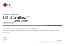 Manuel d'utilisation (MONITEUR LED*) * Les moniteurs LED de LG combinent un écran LCD et un rétroéclairage LED. Veuillez lire attentivement ce manuel avant de mettre en service votre appareil et conservez-le afin de pouvoir vous y référer ultérieurement. 27GP850 27GP83B 32GP83B www.lg.com Copyright 2021 LG Electronics Inc. Tous droits réservés. SOMMAIRE LICENCE Chaque modèle dispose de licences différentes. Consultez le site www.lg.com pour en savoir plus sur les licences. FRANÇAIS Les termes HDMI et High-Definition Multimedia Interface ainsi que le logo HDMI sont des marques commerciales ou des marques déposées de HDMI Licensing Administrator, Inc. aux États-Unis et dans d’autres pays. LICENCE..........................................................2 INFORMATIONS SUR LES LOGICIELS LIBRES...3 ASSEMBLAGE ET PRÉPARATION.....................3 UTILISATION DU MONITEUR.........................13 PARAMÈTRES UTILISATEUR..........................16 RÉSOLUTION DES PROBLÈMES.....................22 CARACTÉRISTIQUES DU PRODUIT................25 2 27GP850 uniquement INFORMATIONS SUR LES LOGICIELS LIBRES MISE EN GARDE •• Veillez à toujours utiliser des composants de la marque LG afin d'assurer la sécurité et les performances du produit. •• La garantie du produit ne couvre pas les dommages ou les blessures causés par l'utilisation de composants non certifiés. •• Nous vous recommandons d'utiliser les composants fournis. •• Les illustrations de ce document représentent les procédures standard ; elles peuvent donc différer de votre produit. •• Lors de l’assemblage du produit, n’appliquez pas de substances étrangères (huiles, lubrifiants, etc.) sur les vis. (Cela pourrait endommager le produit.) •• Évitez de trop serrer les vis. Vous risqueriez d'endommager le moniteur. Les dommages provoqués de cette manière ne sont pas couverts par la garantie du produit. •• Ne portez jamais le moniteur à l'envers en le tenant uniquement par la base du support. Cela pourrait provoquer la chute du moniteur et entraîner des blessures. •• Lorsque vous soulevez ou déplacez le moniteur, ne touchez pas à l'écran. Toute pression exercée sur l'écran du moniteur pourrait l'endommager. •• Pour le dessin d'onde sur l'apparence, contrairement à la méthode générale de revêtement, il est appliqué à l’ajout d’un matériau scintillant dans la matière première. Par conséquent, il se caractérise par son apparence de non décollée et la bonne durabilité. Vous pouvez utiliser ce produit sans souci car il n'y a aucun de problème pendant le cycle de vie. FRANÇAIS Pour obtenir le code source sous la licence publique générale, la licence publique générale limitée, la licence publique Mozilla ou les autres licences libres de ce produit, rendez-vous sur http://opensource.lge.com. En plus du code source, tous les termes de la licence, ainsi que les exclusions de garantie et les droits d’auteur, sont disponibles au téléchargement. LG Electronics peut aussi vous fournir le code source sur CD-ROM moyennant le paiement des frais de distribution (support, envoi et manutention) sur simple demande adressée par e-mail à [email protected]. Cette offre est valable pour une période de trois ans à compter de la date de la dernière distribution de ce produit. Cette offre est valable pour toute personne possédant cette information. ASSEMBLAGE ET PRÉPARATION 3 Remarque FRANÇAIS •• Les composants peuvent différer de l'illustration. •• Les informations et spécifications contenues dans ce manuel peuvent être modifiées sans préavis, dans le but d'améliorer les performances du produit. •• Pour l'achat d'accessoires en option, adressez-vous à un magasin de matériel électronique, rendez-vous sur un site d'achat en ligne ou contactez le revendeur auprès duquel vous avez acheté ce produit. •• Le cordon d'alimentation fourni peut différer selon les régions. Description du produit et des boutons Pilotes et logiciels pris en charge Vous pouvez télécharger et installer la dernière version depuis le site Web LGE (www.lg.com). -- Pilote du moniteur / Bouton du joystick 4 Comment utiliser le bouton du joystick Vous pouvez facilement contrôler les fonctions du moniteur en appuyant sur le bouton du joystick ou en le déplaçant vers la gauche/droite/haut/bas avec le doigt. Si vous souhaitez déplacer ou soulever le moniteur, suivez ces instructions pour éviter de le rayer ou de l'endommager afin d'assurer un déplacement sans danger, quelle que soit sa forme ou sa taille. •• Il est recommandé d'installer le moniteur dans sa boîte ou son emballage d'origine avant d'essayer de le déplacer. •• Avant de déplacer ou de soulever le moniteur, débranchez le cordon d'alimentation et tous les autres câbles. •• Maintenez fermement le moniteur par le bas et le côté du cadre. Ne maintenez pas le panneau directement. •• Lorsque vous tenez le moniteur, orientez l'écran à l'opposé de vous pour éviter de le rayer. •• Lorsque vous transportez le moniteur, ne l'exposez pas à des secousses ou à des vibrations excessives. •• Lorsque vous déplacez le moniteur, maintenez-le à la verticale, ne le tournez jamais latéralement et ne l'inclinez pas sur le côté. FRANÇAIS Fonctions de base Déplacer et soulever le moniteur (Sous tension) : Appuyez une fois sur le bouton du joystick pour allumer le moniteur. ( Hors tension) : Appuyez de façon prolongée sur le bouton du joystick pour éteindre le moniteur. (Contrôle du volume) : Vous pouvez régler le volume en déplaçant le bouton du joystick vers la gauche/droite. (Contrôle de la luminosité de l'écran) : Vous pouvez contrôler la luminosité de l'écran en déplaçant le bouton du joystick vers le haut/bas. 5 MISE EN GARDE FRANÇAIS •• Évitez autant que possible de toucher l'écran du moniteur. -- Vous risqueriez d'endommager l'écran ou certains pixels qu