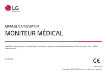 MANUEL D'UTILISATION MONITEUR MÉDICAL Veuillez lire attentivement ce manuel avant de mettre en service votre appareil et conservez-le afin de pouvoir vous y référer ultérieurement. 21HQ513D www.lg.com Copyright 2021 LG Electronics Inc. Tous droits réservés. CONTENU NETTOYAGE...........................................3 FRANÇAIS LICENCE................................................4 INFORMATIONS SUR LES LOGICIELS LIBRES.................................................4 ASSEMBLAGE ET PRÉPARATION...............5 UTILISATION DU MONITEUR..................23 PARAMÈTRES UTILISATEUR...................25 RÉSOLUTION DES PROBLÈMES...............36 CARACTÉRISTIQUES DU PRODUIT...........37 2 Veuillez noter que ces informations ont pour objectif de favoriser une utilisation correcte et la sécurité de l'équipement. Les symboles suivants peuvent indiquer une situation dangereuse qui, si vous n'en tenez pas compte, peut entraîner des blessures graves ou même la mort pour l'utilisateur ou d'autres personnes, ou endommager l'équipement. MISE EN GARDE • Indique une situation dangereuse qui, si vous n'en tenez pas compte, peut entraîner des blessures mineures ou modérées pour l'utilisateur ou d'autres personnes, ou endommager l'équipement. Produits chimiques de nettoyage recommandés • Isopropanol à 70 % • Éthanol à 70 % • Solution saline à 0,9 % • Biospot 500 ppm FRANÇAIS AVERTISSEMENT • Indique un avertissement et des instructions de sécurité. Non respecté, il peut entraîner la mort ou des blessures graves pour l'utilisateur ou d'autres personnes. NETTOYAGE Comment utiliser un nettoyant • Avant de commencer le nettoyage, éteignez le moniteur et débranchez le câble d'alimentation. • Trempez un chiffon doux dans un nettoyant recommandé, puis frottez doucement l'écran avec une force de 1 N au maximum. • Le nettoyant peut provoquer de graves dommages s'il pénètre dans le moniteur durant le nettoyage. • Comme cela pourrait endommager l'affichage, nettoyez uniquement les parties du moniteur qui ne forment pas le panneau LCD de l'écran. • N'utilisez pas de diluants, de benzène, de nettoyants acides ou alcalins, ou d'autres solvants de ce type. • La procédure de nettoyage pour les écrans ne doit être réalisée que par des professionnels de santé (médecins ou infirmières) et non par les patients. 3 FRANÇAIS LICENCE INFORMATIONS SUR LES LOGICIELS LIBRES Chaque modèle dispose de licences différentes. Consultez le site www.lg.com pour en savoir plus sur les licences. Pour obtenir le code source sous la licence publique générale, la licence publique générale limitée, la licence publique Mozilla ou les autres licences libres de ce produit, rendez-vous sur https://opensource.lge.com. En plus du code source, tous les termes de la licence, ainsi que les exclusions de garantie et les droits d’auteur, sont disponibles au téléchargement. LG Electronics peut aussi vous fournir le code source sur CD-ROM moyennant le paiement des frais de distribution (support, envoi et manutention) sur simple demande adressée par e-mail à [email protected]. Cette offre est valable pour une période de trois ans à compter de la date de la dernière distribution de ce produit. Cette offre est valable pour toute personne possédant cette information. « DICOM® est la marque déposée de la National Electrical Manufacturers Association pour ses publications de normes liées à la communication numérique de données médicales. » 4 ASSEMBLAGE ET PRÉPARATION Veuillez vérifier que tous les éléments sont bien présents dans l'emballage avant d'utiliser le produit. S'il manque des éléments, contactez le revendeur auprès duquel vous avez acheté le produit. Notez bien que le produit et les éléments qui l'accompagnent peuvent avoir un aspect différent de ceux de l'illustration. Manuel d'utilisation/Manuel des réglementations/ Cartes Cordon d'alimentation Adaptateur ca/cc Support de câble Câble DisplayPort Câble USB 3.0 Câble DVI-D Corps du support/Base du support FRANÇAIS Composition du produit 5 REMARQUE MISE EN GARDE FRANÇAIS • Veillez à toujours utiliser des composants de la marque LG afin d'assurer la sécurité et les performances du produit. • La garantie du produit ne couvre pas les dommages ou les blessures causés par l'utilisation de composants non certifiés. • Nous vous recommandons d'utiliser les composants fournis. • Si vous utilisez des câbles génériques non certifiés par LG, l'écran risque de ne rien afficher ou de subir des bruits de l'image. • Utilisez uniquement les composants répertoriés ci-dessous qui répondent à la norme indiquée. Les composants non autorisés peuvent causer des dommages au produit et entraîner des dysfonctionnements. Composant Standard Câble DisplayPort Prise en charge de DisplayPort version 1.2, UL, impédance de 100 ohms Câble USB 3.0 Prise en charge d'USB 3.0, UL Câble DVI-D UL, impédance de 100 ohms Cordon d'alimentation États-Unis - Règlement des classes médicales approuvées Autres – Réglementation concernant la sécurité approuvée dans les pays • Les adaptateurs CA/CC, etc., doivent être ceux fournis par le fabricant, à l’exclusion de tout autre. 6 • Les composants peuvent différer de l'illustration. • Les informations et spécifications contenues dans ce manuel peuvent être modifiées sans préavis, dans le but d'améliorer les performances du produit. • Pour l'achat d'accessoires en option, adressez-vous à un magasin de matériel électronique, rendez-vous sur un site d'achat en ligne ou contactez le revendeur auprès duquel vous avez acheté ce produit. • Le cordon d'alimentation fourni peut différer selon les régions. Logiciels pris en charge Pilotes et logiciels Niveau de priorité de l'installation Facultatif Facultatif FRANÇAIS Recommandé • LG Calibration Studio Medical permet d'étalonner la sortie couleur du moniteur à l'aide de l'étalon