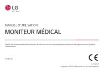MANUEL D'UTILISATION MONITEUR MÉDICAL Veuillez lire attentivement ce manuel avant de mettre en service votre appareil et conservez-le afin de pouvoir vous y référer ultérieurement. 27HQ710S www.lg.com Copyright 2022 LG Electronics Inc. Tous droits réservés. CONTENU NETTOYAGE.........................................................................3 FRANÇAIS LICENCE..............................................................................4 INFORMATIONS SUR LES LOGICIELS LIBRES.............................4 ASSEMBLAGE ET PRÉPARATION.............................................5 PARAMÈTRES UTILISATEUR................................................. 15 RÉSOLUTION DES PROBLÈMES............................................. 29 CARACTÉRISTIQUES DU PRODUIT......................................... 31 CONFIGURATION DU CONTRÔLEUR EXTERNE.......................... 38 PLAN DE MAINTENANCE PRÉVENTIVE – RECOMMANDATION... 49 2 Veuillez noter que ces informations ont pour objectif de favoriser une utilisation correcte et la sécurité de l'équipement. Les symboles suivants peuvent indiquer une situation dangereuse qui, si vous n'en tenez pas compte, peut entraîner des blessures graves ou même la mort pour l'utilisateur ou d'autres personnes, ou endommager l'équipement. MISE EN GARDE • Indique une situation dangereuse qui, si vous n'en tenez pas compte, peut entraîner des blessures mineures ou modérées pour l'utilisateur ou d'autres personnes, ou endommager l'équipement. Produits chimiques de nettoyage recommandés • Isopropanol à 70 % • Éthanol à 70 % • Solution saline à 0,9 % • FRANÇAIS AVERTISSEMENT • Indique un avertissement et des instructions de sécurité. Non respecté, il peut entraîner la mort ou des blessures graves pour l'utilisateur ou d'autres personnes. NETTOYAGE Comment utiliser un nettoyant • Avant de commencer le nettoyage, éteignez le moniteur et débranchez le câble d'alimentation. • Trempez un chiffon doux dans un nettoyant recommandé, puis frottez doucement l'écran avec une force de 1 N au maximum. • Le nettoyant peut provoquer de graves dommages s'il pénètre dans le moniteur durant le nettoyage. • Comme cela pourrait endommager l'affichage, nettoyez uniquement les parties du moniteur qui ne forment pas le panneau LCD de l'écran. • N'utilisez pas de diluants, de benzène, de nettoyants acides ou alcalins, ou d'autres solvants de ce type. • La procédure de nettoyage des écrans ne doit être réalisée que par des professionnels de santé (médecins ou infirmières) et non par les patients. 3 FRANÇAIS 4 LICENCE INFORMATIONS SUR LES LOGICIELS LIBRES Chaque modèle dispose de licences différentes. Consultez le site www.lg.com pour en savoir plus sur les licences. Pour obtenir le code source sous les licences GPL, LGPL, MPL et autres licences de source ouverte qui ont l'obligation de divulguer le code source, qui est contenu dans ce produit, et pour accéder à toutes les conditions de licence mentionnées, aux avis de droits d'auteur et autres documents pertinents, veuillez visiter le site https://opensource.lge.com. LG Electronics peut aussi vous fournir le code source sur CD-ROM moyennant le paiement des frais de distribution (support, envoi et manutention) sur simple demande adressée par e-mail à [email protected]. Cette offre est valable pour toute personne recevant ces informations pendant une période de trois ans après notre dernière expédition de ce produit. Les termes HDMI, interface multimédia haute définition HDMI et habillage commercial HDMI, et les logos HDMI sont des marques commerciales et des marques déposées de HDMI Licensing Administrator, Inc. ASSEMBLAGE ET PRÉPARATION Veuillez vérifier que tous les éléments sont bien présents dans l'emballage avant d'utiliser le produit. S'il manque des éléments, contactez le revendeur auprès duquel vous avez acheté le produit. Notez bien que le produit et les éléments qui l'accompagnent peuvent avoir un aspect différent de ceux de l'illustration. Manuel d'utilisation/Manuel des réglementations/Cartes Cordon d'alimentation Adaptateur ca/cc Câble HDMI Câble DisplayPort Vis (M4 x L12) FRANÇAIS Composition du produit 5 Logiciels pris en charge MISE EN GARDE FRANÇAIS • Veillez à toujours utiliser des composants de la marque LG afin d'assurer la sécurité et les performances du produit. • La garantie du produit ne couvre pas les dommages ou les blessures causés par l'utilisation de composants non certifiés. • Nous vous recommandons d'utiliser les composants fournis. • Si vous utilisez des câbles génériques non certifiés par LG, l'écran risque de ne rien afficher ou de subir des bruits de l'image. • Utilisez uniquement les composants répertoriés ci-dessous qui répondent à la norme indiquée. Les composants non autorisés peuvent causer des dommages au produit et entraîner des dysfonctionnements. Composant Standard Câble HDMI UL, impédance de 100 ohms Câble DisplayPort UL, impédance de 100 ohms Cordon d'alimentation États-Unis - Règlement des classes médicales approuvées Autres - Réglementation concernant la sécurité approuvée dans les pays • À l'exception des composants répertoriés ci-dessus, utilisez uniquement des adaptateurs CA/CC et des composants fournis par le fabricant. REMARQUE • Les composants peuvent différer de l'illustration. • Les informations et spécifications contenues dans ce manuel peuvent être modifiées sans préavis, dans le but d'améliorer les performances du produit. • Pour l'achat d'accessoires en option, adressez-vous à un magasin de matériel électronique, rendez-vous sur un site d'achat en ligne ou contactez le revendeur auprès duquel vous avez acheté ce produit. • Le cordon d'alimentation fourni peut différer selon les régions. 6 Vérifiez les pilotes et logiciels pris en charge par votre produit et reportez-vous aux manuels sur CD fourni avec le produit. Pilotes e