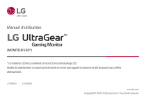 Manuel d'utilisation (MONITEUR LED*) * Les moniteurs LED de LG combinent un écran LCD et un rétroéclairage LED. Veuillez lire attentivement ce manuel avant de mettre en service votre appareil et conservez-le afin de pouvoir vous y référer ultérieurement. 27GN950 27GN95B www.lg.com Copyright 2020 LG Electronics Inc. Tous droits réservés. SOMMAIRE FRANÇAIS LICENCE..........................................................3 INFORMATIONS SUR LES LOGICIELS LIBRES...4 ASSEMBLAGE ET PRÉPARATION.....................4 UTILISATION DU MONITEUR.........................16 PARAMÈTRES UTILISATEUR..........................18 RÉSOLUTION DES PROBLÈMES.....................26 CARACTÉRISTIQUES DU PRODUIT................30 2 LICENCE Chaque modèle dispose de licences différentes. Consultez le site www.lg.com pour en savoir plus sur les licences. FRANÇAIS Les termes HDMI et High-Definition Multimedia Interface ainsi que le logo HDMI sont des marques commerciales ou des marques déposées de HDMI Licensing Administrator, Inc. aux États-Unis et dans d’autres pays. 3 INFORMATIONS SUR LES LOGICIELS LIBRES FRANÇAIS 4 Pour obtenir le code source sous la licence publique générale, la licence publique générale limitée, la licence publique Mozilla ou les autres licences libres de ce produit, rendez-vous sur http://opensource.lge.com. En plus du code source, tous les termes de la licence, ainsi que les exclusions de garantie et les droits d’auteur, sont disponibles au téléchargement. LG Electronics peut aussi vous fournir le code source sur CD-ROM moyennant le paiement des frais de distribution (support, envoi et manutention) sur simple demande adressée par e-mail à [email protected]. Cette offre est valable pour une période de trois ans à compter de la date de la dernière distribution de ce produit. Cette offre est valable pour toute personne possédant cette information. ASSEMBLAGE ET PRÉPARATION AVERTISSEMENT •• Veillez à toujours utiliser des composants de la marque LG afin d'assurer la sécurité et les performances du produit. •• La garantie du produit ne couvre pas les dommages ou les blessures causés par l'utilisation de composants non certifiés. •• Nous vous recommandons d'utiliser les composants fournis. •• Les illustrations de ce document représentent les procédures standard ; elles peuvent donc différer de votre produit. •• Lors de l’assemblage du produit, n’appliquez pas de substances étrangères (huiles, lubrifiants, etc.) sur les vis. (Cela pourrait endommager le produit.) •• Évitez de trop serrer les vis. Vous risqueriez d'endommager le moniteur. Les dommages provoqués de cette manière ne sont pas couverts par la garantie du produit. •• Ne portez jamais le moniteur à l'envers en le tenant uniquement par la base du support. Cela pourrait provoquer la chute du moniteur et entraîner des blessures. •• Lorsque vous soulevez ou déplacez le moniteur, ne touchez pas à l'écran. Toute pression exercée sur l'écran du moniteur pourrait l'endommager. •• Pour le dessin d'onde sur l'apparence, contrairement à la méthode générale de revêtement, il est appliqué à l’ajout d’un matériau scintillant dans la matière première. Par conséquent, il se caractérise par son apparence de non décollée et la bonne durabilité. Vous pouvez utiliser ce produit sans souci car il n'y a aucun de problème pendant le cycle de vie. REMARQUE Description du produit et des boutons FRANÇAIS •• Les composants peuvent différer de l'illustration. •• Les informations et spécifications contenues dans ce manuel peuvent être modifiées sans préavis, dans le but d'améliorer les performances du produit. •• Pour l'achat d'accessoires en option, adressez-vous à un magasin de matériel électronique, rendez-vous sur un site d'achat en ligne ou contactez le revendeur auprès duquel vous avez acheté ce produit. •• Le cordon d'alimentation fourni peut différer selon les régions. Pilotes et logiciels pris en charge •• Vous pouvez télécharger et installer la dernière version depuis le site Web LGE (www.lg.com). -- Pilote du moniteur/ / / Bouton d'éclairage Bouton du joystick 5 Comment utiliser le bouton du joystick Vous pouvez facilement contrôler les fonctions du moniteur en appuyant sur le bouton du joystick ou en le déplaçant vers la gauche/droite/haut/bas avec le doigt. FRANÇAIS Éclairage Fonctions de base (Sous tension) : Appuyez une fois sur le bouton du joystick pour allumer le moniteur. ( Hors tension) : Appuyez de façon prolongée sur le bouton du joystick (plus de 5 secondes) pour éteindre le moniteur. (Contrôle du volume) : Vous pouvez régler le volume en déplaçant le bouton du joystick vers la gauche/droite. (Contrôle de la luminosité de l'écran) : Vous pouvez contrôler la luminosité de l'écran en déplaçant le bouton du joystick vers le haut/bas. 6 Lorsque l'éclairage est allumé Vous pouvez facilement contrôler les fonctions du moniteur en appuyant sur le bouton d'éclairage ou en le déplaçant vers la gauche/droite avec le doigt. : appuyez sur le bouton d'éclairage pour modifier la couleur des voyants à l'arrière du moniteur (huit couleurs différentes). : appuyez une fois sur le bouton d'éclairage et maintenez-le enfoncé pour éteindre l'éclairage à l'arrière du moniteur. : vous pouvez régler la luminosité en déplaçant le bouton d'éclairage vers la gauche/droite. Fonctions de base REMARQUE Lorsque l'éclairage est éteint FRANÇAIS Comment utiliser le bouton d'éclairage •• Le bouton du joystick et d'éclairage se trouvent en bas du moniteur. •• La fonction d'éclairage pour l'arrière du moniteur est disponible même lorsque le moniteur est en mode économie d'énergie ou quand son écran est désactivé. ([Paramètres] > [Général] > [Option d'éclairage] > [Garder le statut d'éclairage]) •• Le LED lumineux n'est pas destiné à l'éclairage. Veuillez égal