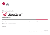 Manuel d'utilisation (Moniteur OLED) Veuillez lire attentivement ce manuel avant de mettre en service votre appareil et conservez-le afin de pouvoir vous y référer ultérieurement. 48GQ900 www.lg.com Copyright 2022 LG Electronics Inc. Tous droits réservés. SOMMAIRE LICENCE Chaque modèle dispose de licences différentes. Consultez le site www.lg.com pour en savoir plus sur les licences. FRANÇAIS LICENCE.............................................................................................. 2 INFORMATIONS SUR LES LOGICIELS LIBRES....................................... 3 Les termes HDMI et High-Definition Multimedia Interface ainsi que le logo HDMI sont des marques commerciales ou des marques déposées de HDMI Licensing Administrator, Inc. aux États-Unis et dans d’autres pays. ASSEMBLAGE ET PRÉPARATION......................................................... 3 UTILISATION DU MONITEUR............................................................. 10 TÉLÉCOMMANDE.............................................................................. 13 PARAMÈTRES UTILISATEUR.............................................................. 14 RÉSOLUTION DES PROBLÈMES......................................................... 21 CARACTÉRISTIQUES DU PRODUIT.................................................... 23 2 http://patents.dts.com INFORMATIONS SUR LES LOGICIELS LIBRES MISE EN GARDE •• Veillez à toujours utiliser des composants de la marque LG afin d'assurer la sécurité et les performances du produit. •• La garantie du produit ne couvre pas les dommages ou les blessures causés par l'utilisation de composants non certifiés. •• Nous vous recommandons d'utiliser les composants fournis. •• Les illustrations et les écrans d'affichage du produit utilisés dans ce manuel sont des exemples destinés à aider les consommateurs à utiliser ledit produit et peuvent différer du produit réel. •• Lors de l’assemblage du produit, n’appliquez pas de substances étrangères (huiles, lubrifiants, etc.) sur les vis. (Cela pourrait endommager le produit.) •• Évitez de trop serrer les vis. Vous risqueriez d'endommager le moniteur. Les dommages provoqués de cette manière ne sont pas couverts par la garantie du produit. •• Ne portez jamais le moniteur à l'envers en le tenant uniquement par la base du support. Cela pourrait provoquer la chute du moniteur et entraîner des blessures. •• Lorsque vous soulevez ou déplacez le moniteur, ne touchez pas à l'écran. Toute pression exercée sur l'écran du moniteur pourrait l'endommager. •• Pour le motif d'onde à la surface du moniteur, contrairement à la méthode générale de revêtement, il est appliqué en ajoutant un matériau scintillant à la matière première. Par conséquent, il ne se décolle pas et dure sur le long terme. Vous pouvez utiliser ce produit sans souci car il n'y a aucun problème d'utilisation. FRANÇAIS Pour obtenir le code source sous les licences GPL, LGPL, MPL et autres licences de source ouverte qui ont l'obligation de divulguer le code source, qui est contenu dans ce produit, et pour accéder à toutes les conditions de licence mentionnées, aux avis de droits d'auteur et autres documents pertinents, veuillez visiter le site https://opensource.lge.com. LG Electronics peut aussi vous fournir le code source sur CD-ROM moyennant le paiement des frais de distribution (support, envoi et manutention) sur simple demande adressée par e-mail à [email protected]. Cette offre est valable pour toute personne recevant ces informations pendant une période de trois ans après notre dernière expédition de ce produit. ASSEMBLAGE ET PRÉPARATION 3 REMARQUE FRANÇAIS •• Les composants peuvent différer de l'illustration. •• Les informations et spécifications contenues dans ce manuel peuvent être modifiées sans préavis, dans le but d'améliorer les performances du produit. •• Pour l'achat d'accessoires en option, adressez-vous à un magasin de matériel électronique, rendez-vous sur un site d'achat en ligne ou contactez le revendeur auprès duquel vous avez acheté ce produit. •• Le cordon d'alimentation fourni peut différer selon les régions. Pilotes et logiciels pris en charge Vous pouvez télécharger et installer la dernière version depuis le site Web LGE (www.lg.com). -- Pilote du moniteur / / 4 Description du produit et des boutons Utilisation du bouton Le moniteur peut être commandé en appuyant sur un bouton. Mise sous tension (Appui) Mise hors tension (Appui prolongé) Déplacement dans le menu (Appui1) Sélection du menu (Appui prolongé2) 1 La fonction souhaitée peut être sélectionnée en se déplaçant dans le menu. 2 Vous pouvez accéder au menu pour modifier la fonction lorsque le moniteur est sous tension. Si vous souhaitez déplacer ou soulever le moniteur, suivez ces instructions pour éviter de le rayer ou de l'endommager afin d'assurer un déplacement sans danger, quelle que soit sa forme ou sa taille. •• Il est recommandé d'installer le moniteur dans sa boîte ou son emballage d'origine avant d'essayer de le déplacer. •• Avant de déplacer ou de soulever le moniteur, débranchez le cordon d'alimentation et tous les autres câbles. •• Maintenez fermement le moniteur par le bas et le côté du cadre. Ne maintenez pas le panneau directement. •• Lorsque vous tenez le moniteur, orientez l'écran à l'opposé de vous pour éviter de le rayer. •• Lorsque vous transportez le moniteur, ne l'exposez pas à des secousses ou à des vibrations excessives. •• Lorsque vous déplacez le moniteur, maintenez-le à la verticale, ne le tournez jamais latéralement et ne l'inclinez pas sur le côté. FRANÇAIS Fonctions de base Déplacer et soulever le moniteur Paramètres du menu Permet d'éteindre le moniteur. Permet de modifier la source externe. / Permet de régler le volume. / Permet de régler la luminosité. 5 MISE EN GARDE FRANÇAIS •