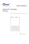 Manuel d'utilisation Batterie LFP – Série Spring SE-F5 Plus Édition : 01 Date : 19.06.2025 Comment utiliser ce manuel Lisez ce manuel ainsi que tous les documents connexes avant d’effectuer toute opération sur la batterie. Ces documents doivent être conservés avec soin et être toujours accessibles. Le contenu peut être mis à jour ou révisé périodiquement en raison du développement du produit. Les informations contenues dans ce manuel sont susceptibles de changer sans préavis. Tous droits réservés Aucune partie de ce document ne peut être reproduite, sous quelque forme ou par quelque moyen que ce soit, sans l'autorisation formelle du fabricant. Marques commerciales et autorisations Les marques commerciales utilisées dans ce manuel appartiennent au fabricant. Toutes les autres marques ou marques déposées mentionnées dans ce manuel appartiennent à leurs propriétaires respectifs. Licences logicielles * Il est interdit d'utiliser, en partie ou en totalité, les données contenues dans le micrologiciel ou le logiciel développé par le fabricant à des fins commerciales, par quelque moyen que ce soit. * Il est interdit de réaliser de l’ingénierie inverse, du cracking ou toute autre opération susceptible de compromettre la conception originale du programme du logiciel développé par le fabricant. Avis de non-responsabilité Le fabricant ne pourra être tenu responsable des blessures corporelles, pertes de biens, dommages au produit et des pertes subséquentes dans les circonstances suivantes : * Dommages causés par un cas de force majeure, notamment tremblement de terre, inondation, éruption volcanique, glissement de terrain, foudre, incendie, guerre, conflit militaire, typhon, ouragan, etc. * Non-respect des dispositions de ce manuel. * Un environnement d'installation, de fonctionnement ou de stockage non conforme aux normes internationales, nationales ou régionales applicables ; * Utilisation incorrecte de ce produit. * Des réparations, démontages de l'armoire ou autres opérations effectuées par un personnel non autorisé ou non qualifié. * Utilisation de pièces de rechange non approuvées. * Modifications ou changements techniques non autorisés du produit ou du logiciel. * Expédition incorrecte par vous-même ou par un tiers mandaté par vous. * Utilisation de matériaux et d’outils de qualité insuffisante, non conformes aux normes internationales, nationales ou régionales applicables. * Dommages causés par votre négligence, celle d'un tiers, une intention délibérée, une négligence grave ou une opération inappropriée. 1 Table des matières 1 Consignes de sécurité ...................................................................................................................................................................3 1.1 Termes et symboles .......................................................................................................................................................... 3 1.2 Règles de sécurité ............................................................................................................................................................. 5 2 Description du produit ................................................................................................................................................................. 6 2.1 Caractéristiques du produit ...............................................................................................................................................6 2.2 Scénarios d'application .....................................................................................................................................................6 2.3 Aperçu du produit .............................................................................................................................................................7 3 Préparation à l'installation ............................................................................................................................................................9 3.1 Liste de déballage .............................................................................................................................................................9 3.2 Outils requis ....................................................................................................................................................................11 3.3 Équipement de sécurité .................................................................................................................................................. 12 4 Instructions d'installation ........................................................................................................................................................... 13 4.1 Personnel d'installation ...................................................................................................................................................13 4.2 Environnement d'installation ..........................................................................................................................................14 4.3 Choix des emplacements d'installation .......................................................................................................................... 17 4.4 Installation de la batterie .............................................................................................................................................. 18 4.4.1 Montage mural / Montage au sol .....................................................................................................................18 4.4.2 Montage en empilement ......................................................................................................................................20 5. Raccordement électrique ....................................................................................................