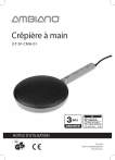 Crêpière à main GT-SF-CMH-01 ans GARANTIE SAV 01 40 82 92 26 (gratuitement) Mail : gt-support @zeitlos-vertrieb.de AN FR 2006050206063 33/2025 NOTICE D’UTILISATION 33/2025 AN FR: 2006050206063 PO51033161 Sommaire Sommaire 2 Généralités Introduction Déclaration de conformité UE Utilisation conforme 3 3 3 3 Composants / Contenu de l’emballage 4 Sécurité 5 Consignes générales de sécurité 5 Risques pour les enfants et les personnes dont les facultés sont limitées 5 Risques liés à l’utilisation d’appareils électriques 6 Risques liés à l’utilisation de la crêpière à main 8 Explication des symboles et autres informations 11 2 Installation et montage Avant la première utilisation 12 12 Utilisation Utilisation de la crêpière 14 14 Pannes et solutions 17 Maintenance, nettoyage et entretien 18 Conseils et recettes 19 Recette de base de pâte à crêpes 19 Données techniques 20 Recyclage 20 Carte de garantie 23 Généralités Introduction Nous vous remercions d’avoir choisi un crêpière à main Ambiano. Vous venez d’acquérir un produit de qualité qui satisfait aux normes de performance et de sécurité les plus élevées. Afin de manipuler correctement l’appareil et de garantir sa longévité, nous vous recommandons de respecter les indications suivantes. Veuillez lire attentivement cette notice d’utilisation et notamment les consignes de sécurité avant la mise en service de l’appareil. Vous y trouverez un certain nombre de recommandations importantes et utiles qui doivent être comprises et observées par tous les utilisateurs avant la mise en service. Conservez cette notice d’utilisation et donnez-la avec l’appareil si vous le remettez à une autre personne. Déclaration de conformité UE La conformité du produit aux normes prescrites par la loi est garantie. Vous trouverez la déclaration de conformité intégrale sur Internet sous www.gt-support.de. L’appareil répond aux exigences de la loi sur la sécurité des produits. Ceci est prouvé par le sigle GS de l’institut de contrôle indépendant : Utilisation conforme L’appareil est exclusivement réservé à la préparation de crêpes/ galettes. De plus, l’appareil n’est pas destiné à une utilisation professionnelle mais uniquement à une utilisation privée. Il ne peut être utilisé par les employés de magasins, bureaux et autres établissements industriels, dans les propriétés agricoles, ou par les clients d’hôtels, motels et autres types d’hébergement comme les chambres d’hôtes. Toute autre utilisation ou modification de l’appareil n’est pas conforme et est strictement interdite. Nous ne pouvons être tenus responsables des dommages survenus à la suite d’une utilisation non conforme ou incorrecte. Éditeur de la notice : Globaltronics GmbH & Co. KG Bei den Mühren 5 20457 Hamburg Allemagne [email protected] 3 Composants / Contenu de l’emballage E A D A) B) C) D) E) F) Plaque chauffante Poignée Bouton marche/arrêt Voyant de fonctionnement Bol à pâte séparé Notice d’utilisation et carte de garantie (non illustrées) Sous réserve de modifications techniques et visuelles. 4 C B Sécurité Veuillez lire et respecter les consignes de ­sécurité énoncées ci-après. Le non-respect de ces consignes peut engendrer des risques d’accident et de blessures, ainsi que des dommages matériels ou des dysfonctionnements de l’appareil. Consignes générales de sécurité Risques pour les enfants et les personnes dont les facultés sont limitées - Les enfants âgés de plus de 8 ans et les personnes dont les facultés physiques, sensorielles ou mentales sont limitées ou les personnes manquant d’expérience et/ou de connaissances sont autorisés à utiliser cet appareil, à condition qu’ils soient surveillés ou qu’ils aient été instruits quant à son usage sûr et qu’ils aient compris les dangers en résultant. - Le nettoyage et l’entretien de l’appareil ne doivent pas être effectués par des enfants de moins de 8 ans. Passé cet âge, les enfants peuvent réaliser ces opérations s’ils sont surveillés. Les enfants de moins de 8 ans doivent être tenus à distance de l’appareil et du cordon. - Les enfants ne doivent pas jouer avec l’appareil. Les enfants ne sont pas conscients du danger inhérent à l’utilisation d’appareils électriques. Par conséquent, utilisez et conservez l’appareil hors de portée des enfants de moins de 8 ans. Ne laissez pas pendre le 5 cordon électrique afin d’éviter que quelqu’un ne tire dessus. - Conservez l’emballage hors de portée des enfants Risque d’asphyxie ! Risques liés à l’utilisation d’appareils électriques - Branchez l’appareil uniquement sur une prise secteur avec terre, installée de manière conforme et dont la tension de secteur respecte la plaque signalétique. - Si le cordon électrique est endommagé, seul un atelier spécialisé désigné par le constructeur est autorisé à le remplacer afin d’éviter tout risque de blessure, d’accident ou de dégâts à l’appareil. - Veillez à ce que la prise secteur se trouve à proximité de l’appareil et soit facilement accessible de façon à ce que l’appareil puisse être rapidement débranché en cas d’accident. - Seuls des ateliers spécialisés et habilités sont autorisés à effectuer les réparations. Les appareils réparés par un personnel non spécialisé représentent un danger pour l’utilisateur. - Ne laissez pas l’appareil sans surveillance pendant qu’il fonctionne afin d’éviter tout accident. - Afin d’éviter tout accident, n’utilisez jamais la même prise secteur avec terre pour brancher simultanément plusieurs appareils ménagers (par exemple sur une triplite). - Ne plongez jamais l’appareil dans l’eau et ne l’utilisez pas en plein air, car ce dernier ne doit en aucun cas 6 être exposé à la pluie ou à l’humidité – Risque d’électrocution ! - Si l’appareil venait