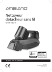 Nettoyeur détacheur sans fil GT-SF-HSC-01 ans GARANTIE SAV 01 40 82 92 26 (gratuitement) Mail : gt-support @zeitlos-vertrieb.de AN FR 2006050206025 32/2025 NOTICE D’UTILISATION 32/2025 AN FR 2006050206025 PO51033152 Sommaire Sommaire 2 Généralités Introduction Déclaration de conformité UE Utilisation conforme 3 3 3 3 Composants / Contenu de l’emballage 4 Sécurité 6 Consignes générales de sécurité 6 Risques pour les enfants et les personnes dont les facultés sont limitées 6 Risques liés à l’utilisation d’appareils électriques 6 Risques liés à l’utilisation du nettoyeur détacheur sans fil 9 Explication des symboles et autres informations 12 Installation et montage Avant la première utilisation Mise en place du pack d’accus 2 13 13 13 Utilisation Utilisation de l’appareil 18 18 Pannes et solutions 23 Maintenance, nettoyage et entretien Vider le réservoir d’eau sale (H) Nettoyage des autres accessoires Rangement 24 24 25 26 Données techniques 27 Recyclage 28 Carte de garantie 31 Généralités Introduction Nous vous remercions d’avoir choisi le nettoyeur détacheur sans fil Ambiano. Vous venez d’acquérir un produit de qualité qui satisfait aux normes de performance et de sécurité les plus élevées. Afin de manipuler correctement l’appareil et de garantir sa longévité, nous vous recommandons de respecter les indications suivantes. Veuillez lire attentivement cette notice d’utilisation et notamment les consignes de sécurité avant la mise en service de l’appareil. Vous y trouverez un certain nombre de recommandations importantes et utiles qui doivent être comprises et observées par tous les utilisateurs avant la mise en service. Conservez cette notice d’utilisation et donnez-la avec l’appareil si vous le remettez à une autre personne. Utilisation conforme Cet appareil convient exclusivement pour le nettoyage de taches sur des matériaux textiles (tels que les coussins, tapis, sièges auto). De plus, l’appareil n’est pas destiné à une utilisation professionnelle mais uniquement à une utilisation privée. Toute autre utilisation ou modification de l’appareil n’est pas conforme et est strictement interdite. Nous ne pouvons être tenus responsables des dommages survenus à la suite d’une utilisation non conforme ou incorrecte. Déclaration de conformité UE La conformité du produit aux normes prescrites par la loi est garantie. Vous trouverez la déclaration de conformité intégrale sur Internet sous www.gt-support.de. Éditeur de la notice : Globaltronics GmbH & Co. KG Bei den Mühren 5 20457 Hamburg, Allemagne [email protected] 3 Composants / Contenu de l’emballage G N M L A H K J B G I 4 B C D E F A) Appareil de base B) Affichage de l’état de la batterie C) Affichage des niveaux de puissance d’aspiration D) Bouton marche/arrêt E) Bouton de réglage de la puissance d’aspiration F) Bouton de pulvérisation G) Réservoir d’eau propre H) Réservoir d’eau sale I) Bouton de déverrouillage du réservoir d’eau sale J) Brosse (amovible) K) Bouche d’aspiration L) Couvercle d’aspiration M) Bouton de déverrouillage du couvercle d’aspiration N) Pulvérisateur O) Prise de charge (voir page 15) P) Câble de charge USB (sans ill.) Q) Notice d’utilisation et carte de garantie (non illustrées) Sous réserve de modifications techniques et visuelles. 5 Sécurité Veuillez lire et respecter les consignes de ­sécurité énoncées ci-après. Le non-respect de ces consignes peut engendrer des risques d’accident et de blessures, ainsi que des dommages matériels ou des dysfonctionnements de l’appareil. Risques pour les enfants et les personnes dont les facultés sont limitées - Les enfants âgés de plus de 8 ans et les personnes dont les facultés physiques, sensorielles ou mentales sont limitées ou les personnes manquant d’expérience et/ou de connaissances sont autorisés à utiliser cet appareil, à condition qu’ils soient surveillés ou qu’ils aient été instruits quant à son usage sûr et qu’ils aient compris les dangers en résultant. - Le nettoyage et l’entretien de l’appareil ne doivent pas être effectués par des enfants, sauf s’ils sont sous surveillance. - Les enfants de moins de 8 ans doivent être tenus à distance de l’appareil, de l’adaptateur secteur et du câble électrique. - Les enfants ne doivent pas jouer avec l’appareil. Les enfants ne sont pas conscients du danger inhérent à l’utilisation d’appareils électriques. Par conséquent, utilisez et conservez l’appareil hors de la portée de ces derniers. Ne laissez pas pendre le cordon d’alimentation afin d’éviter que quelqu’un ne tire dessus. 6 - Conservez l’emballage hors de portée des enfants – Risque d’asphyxie ! Risques liés à l’utilisation ­d’appareils électriques - Un câble de charge USB défectueux ne doit plus être utilisé. Mettez au rebut tout câble de charge USB défectueux et remplacez-le par un câble de charge USB du même type. Vérifiez régulièrement l’absence de dommages au niveau du câble de charge USB. - Seuls des ateliers spécialisés et habilités sont autorisés à effectuer les réparations. Les appareils réparés par un personnel non spécialisé représentent un danger pour l’utilisateur. - L’appareil peut être rechargé uniquement avec le câble de charge USB fourni. - Afin d’éviter tout accident, ne laissez pas l’appareil sans surveillance pendant qu’il fonctionne. - Ne plongez jamais le câble de charge USB et l’appareil de base dans l’eau et ne les utilisez pas en plein air, car ces derniers ne doivent en aucun cas être exposés à la pluie ou à l’humidité ! L’eau ne doit parvenir que dans le(s) réservoir(s) prévus à cet effet. Risque d’électrocution ! - Si l’appareil venait à tomber dans l’eau, débranchez d’abord le câble de charge USB avant de le sortir de l’eau. Avant de réutiliser l’appareil, faites-le