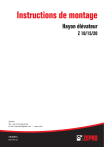 Instructions de montage Hayon élévateur Z 10/15/20 ZEPRO Tel.: +46 (0)10-459 05 00 E-mail: [email protected] | zepro.com 75395TL 2024-06-27 Sommaire Z 10/15/20 Sommaire 1 Avant-propos..................................................................................................... 5 1.1 1.2 1.3 1.4 1.5 1.6 1.7 1.8 1.9 2 Important................................................................................................. 5 Assistance technique............................................................................... 5 Identification............................................................................................ 6 Marquage CE.......................................................................................... 6 Homologation ......................................................................................... 6 Huile hydraulique..................................................................................... 6 Garantie................................................................................................... 6 Réfection de la peinture........................................................................... 7 Entretien de la batterie............................................................................ 7 Consignes de sécurité...................................................................................... 8 2.1 2.2 2.3 2.4 3 Bouchon de transport.............................................................................. 8 Parties mobiles - libre mouvement.......................................................... 8 Interdiction de raccorder des équipements extérieurs............................. 9 Installation............................................................................................... 9 Procédure de montage................................................................................... 10 3.1 3.2 3.3 3.4 3.5 4 Installation de l’ossature de l’élévateur.................................................. 10 Connexions électriques......................................................................... 10 Installation de la plate-forme................................................................. 10 Installation des vérins............................................................................ 10 Application des autocollants.................................................................. 10 Calcul des cotes de montage......................................................................... 11 4.1 4.2 4.3 4.4 Cote C .................................................................................................. 11 Cote D .................................................................................................. 11 Cote A.................................................................................................... 11 Cote H................................................................................................... 11 5 Évidement de la traverse arrière.................................................................... 14 6 Installation ...................................................................................................... 15 6.1 6.2 6.3 6.4 6.5 6.6 6.7 6.8 6.9 6.10 www.zepro.com Ossature de l’élévateur.......................................................................... 15 Actionneur............................................................................................. 18 Protection anti-encastrement................................................................. 20 Protection anti-encastrement ajustable................................................. 22 Butées de bras...................................................................................... 24 Bande d’étanchéité (horizontale)........................................................... 24 Bande d’étanchéité (verticale)............................................................... 24 Plate-forme............................................................................................ 25 Amorçage des vérins............................................................................. 29 Verrouillage de transport....................................................................... 29 3 Sommaire 7 Z 10/15/20 Traction de faisceau ....................................................................................... 30 7.1 7.2 7.3 Généralités............................................................................................ 30 Dimensionnement des systèmes électriques........................................ 31 Câble d’alimentation principal, câble de terre, fusible principal et interrupteur principal................................................ 32 Câble de courant de commande........................................................... 34 Alarme de plate-forme ouverte.............................................................. 34 Commande au pied / Feux de signalisation.......................................... 34 7.4 7.5 7.6 8 Raccordement................................................................................................. 35 9 Groupe hydraulique........................................................................................ 36 10 Schémas électriques et hydrauliques........................................................... 37 10.1 10.2 10.3 10.4 10.5 10.6 10.7 Z 10/15/20............................................................................................. 37 Z 10/15/20, inclinaison automatique hydraulique.................................. 38 Z 10/15/20, Soupapes mécaniques d'éclatement de tuyau................... 39 Connexion à la carte électronique, commande à 4 boutons................. 40 Connexion de l'alarme de plate-forme ouverte...................................... 41 Branchement des feux d'avertissement et de la commande au pied.... 42 Raccordement du boîtier de commande...............................