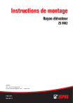 Instructions de montage Hayon élévateur ZS MK2 ZEPRO Tél.: +46 (0)10-459 05 00 E-mail: [email protected] | zepro.com 78614TL 2024-08-13 Sommaire ZS MK2 Sommaire 1 Informations importantes ..........................................................................5 1.1 1.2 1.3 1.4 1.5 1.6 1.7 1.8 1.9 2 Soyez attentif !....................................................................................5 Configuration......................................................................................5 Assistance technique.........................................................................5 Marquage CE.....................................................................................6 Homologation ....................................................................................6 Huile hydraulique................................................................................6 Garantie..............................................................................................6 Réfection de la peinture.....................................................................7 Entretien de la batterie.......................................................................7 Consignes de sécurité................................................................................8 2.1 2.2 2.3 3 Parties mobiles - libre mouvement.....................................................8 Interdiction de raccorder des équipements extérieurs.......................8 Installation .........................................................................................8 Avant de commencer l’installation ...........................................................9 3.1 3.2 3.3 3.4 3.5 3.6 3.7 4 Protection anti-encastrement.............................................................9 Calcul des cotes de montage (version Standard)............................ 11 Calcul des cotes de montage (version Slimline)..............................13 Évidement de la traverse arrière......................................................15 Préparation du hayon élévateur.......................................................16 Enclenchement temporaire de l’élévateur........................................18 Ajustement des profilés du tube porteur...........................................19 Installation..................................................................................................20 4.1 4.2 4.3 4.4 4.5 4.6 4.7 4.8 4.9 4.10 5 Ossature de l’élévateur....................................................................20 Réglage de la position de travail......................................................22 Blocage de la position de travail (option).........................................23 Plate-forme.......................................................................................24 Butées de plate-forme......................................................................26 Butées de bras.................................................................................26 Amorçage des vérins........................................................................26 Butée de transport............................................................................27 Capteur d’angle de l’ouverture/fermeture automatique....................29 Commande.......................................................................................30 Traction du faisceau .................................................................................35 5.1 5.2 5.3 5.4 5.5 5.6 www.zepro.com Généralités.......................................................................................35 Consommation électrique maximale Section minimale recommandée......................................................36 Câble d’alimentation principal, câble de terre, fusible principal et interrup teur principal..........................................37 Câble de courant de commande......................................................39 Alarme de plate-forme ouverte.........................................................39 Commande au pied / Feux de signalisation.....................................39 3 Sommaire 6 ZS MK2 Raccordement............................................................................................40 6.1 6.2 Presse-étoupe..................................................................................40 Raccordement..................................................................................41 7 Mise sous tension du hayon élévateur....................................................45 8 Schémas électriques et hydrauliques.....................................................46 8.1 8.2 9 ZS MK2............................................................................................46 ZS MK2 Inclinaison automatique......................................................47 Graissage et contrôle du niveau d’huile.................................................48 9.1 9.2 Points de graissage..........................................................................48 Contrôle du niveau d’huile................................................................48 10 Marquage....................................................................................................49 10.1 10.2 10.3 10.4 10.5 10.6 10.7 Charge maximale autorisée.............................................................50 Plaque signalétique .........................................................................51 Zone de travail .................................................................................51 Ruban de signalisation ....................................................................51 Autocollant de commande................................................................52 Zone de danger ...............................................................................55 Drapeaux de signalisation ...............................................................55 11 