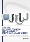 GLIDESCOPE SYSTÈMES TITANIUM RÉUTILISABLES ET SPECTRUM À USAGE UNIQUE Manuel d'utilisation et de maintenance 0900‑4712-FRFR REV-12 GLIDESCOPE SYSTÈMES TITANIUM RÉUTILISABLES ET SPECTRUM À USAGE UNIQUE Manuel d'utilisation et de maintenance Date d’effet : 13 février 2025 Attention : la loi fédérale des États-Unis limite la vente de ce dispositif aux médecins ou sur prescription médicale. 0900‑4712-FRFR REV-12 COORDONNÉES Pour en savoir plus sur le système GlideScope, contacter le Service client de Verathon ou consulter la page verathon.com/service-and-support. Verathon Inc. 20001 North Creek Parkway Bothell, WA 98011 États-Unis Tél. : +1 800 331 2313 (États-Unis/Canada) Tél. : +1 425 867 1348 Fax : +1 425 883 2896 verathon.com Verathon Medical (Canada) ULC 2227 Douglas Road Burnaby, BC V5C 5A9 Canada Tél. : +1 604 439 3009 Fax : +1 604 439 3039 Verathon Medical (Europe) B.V. Willem Fenengastraat 13 1096 BL Amsterdam Pays-Bas Tél. : +31 (0) 20 210 30 91 Fax : +31 (0) 20 210 30 92 EU MDSS-UK RP Ltd. 6 Wilmslow Road, Rusholme Manchester M14 5TP Royaume-Uni Tel: +44 (0)7898 375115 Verathon Medical (Australie) Pty Limited Unit 9, 39 Herbert Street St Leonards NSW 2065 Australie En Australie : 1800 613 603 Tél. / 1800 657 970 Fax International : +61 2 9431 2000 Tél. / +61 2 9475 1201 Fax MDSS CH GmbH Laurenzenvorstadt 61 5000 Aarau Suisse CH Anandic Medical Systems AG Stadtweg 24 8245 Feuerthalen Suisse Copyright© 2025 Verathon Inc. Tous droits réservés. Aucune partie de ce manuel ne peut être copiée ni transmise de quelque manière que ce soit sans le consentement explicite écrit de Verathon Inc. GlideRite, GlideScope, le symbole de GlideScope, DirectView, Reveal, Spectrum, Verathon et le flambeau symbole de Verathon sont des marques de Verathon Inc. Tous les autres noms de marques et de produits sont des marques ou des marques déposées de leurs propriétaires respectifs. Tous les produits Verathon Inc. présentés ou décrits dans ce manuel ne sont pas disponibles à la vente commerciale dans tous les pays. Les informations contenues dans le présent manuel sont susceptibles d'être modifiées à tout moment sans préavis. Pour obtenir les informations les plus récentes, consultez la documentation disponible en ligne sur verathon.com/service-and-support. 0900‑4712-FRFR REV-12 TABLE DES MATIÈRES INFORMATIONS IMPORTANTES.............................................................................................................................1 Informations sur le produit...................................................................................................................................1 Description du produit.........................................................................................................................................1 Utilisation prévue.................................................................................................................................................1 Performances essentielles.....................................................................................................................................1 Environnements de l'utilisation prévue.................................................................................................................1 Déclaration de prescription..................................................................................................................................1 Informations pour l'ensemble des utilisateurs.......................................................................................................2 Avertissements et attentions................................................................................................................................2 INTRODUCTION......................................................................................................................................................8 Systèmes réutilisables Titanium et systèmes à usage unique Spectrum..................................................................8 Pièces et accessoires du système..........................................................................................................................9 Paramètres de langue........................................................................................................................................11 Composants du vidéolaryngoscope....................................................................................................................12 Boutons, icônes et connexions du moniteur vidéo..............................................................................................13 CONFIGURATION.................................................................................................................................................17 Procédure 1. Inspection initiale..................................................................................................................17 Procédure 2. Montage du système (facultatif)...........................................................................................18 Procédure 3. Charge de la batterie du moniteur........................................................................................21 Procédure 4. Raccordement du câble vidéo et du vidéolaryngoscope.........................................................22 Procédure 5. Connexion à un moniteur externe (facultatif)........................................................................25 Procédure 6. Configuration des paramètres utilisateur...............................................................................26 Procédure 7. Test de fonctionnement........................................................................................................27 i Manuel d'utilisation et de maintenance: Table des matières 0900‑4712-FRFR REV-12 UTILISATION DU DISPOSITIF.................................................