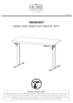 août, 2023 PMO4825WCF BUREAU ASSIS-DEBOUT ÉLECTRIQUE DE 48 PO Instructions de montage – Important: Déballez soigneusement le colis et identifiez chaque composant avant de tenter un montage. Référez-vous à la liste des pièces jointe. Veuillez prendre soin lors du montage de l’unité et posez toujours les pièces sur une surface propre et lisse. Si vous avez besoin d’assistance en ce qui concerne le montage, les pièces ou si vous souhaitez recevoir des informations sur d’autres produits, veuillez visiter notre site Web: www.officestar.net, ou écrivez-nous par courriel ou par la poste. 1. Ne pas utiliser ce produit à moins que toutes les vis et tous les boulons soient resserrés. 2. Vérifier à tous les trois mois ou au besoin que toutes les vis et tous les boulons sont resserrés. 3. Éliminer les matériaux de conditionnement d’une manière convenable. Ne pas utiliser la couverture en plastique pour couvrir la tête à cause du risque d’étouffement. 4. Ne pas utiliser ce produit comme un escabeau. 5. Ce produit ne doit servir qu’à l’usage pour lequel il a été conçu. 6. POUR USAGE INTÉRIEUR ET RÉSIDENTIEL SEULEMENT. GARANTIE LIMITÉE OSP Home Furnishings® garantit à l’acheteur original que ce produit sera exempt de tout défaut de pièces et de main d’œuvre tel que décrit ci-dessous. OSP Home Furnishings® réparera ou remplacera, à sa discrétion, sans frais à l’acheteur original seulement, les produits ou les pièces défectueux/défectueuses durant une période d’un (1) an à compter de la date d’achat. Les pièces de rechange ne peuvent être fournies que lorsque celles-ci sont disponibles. Les pièces d’articles discontinués peuvent ne pas être disponibles. Cette garantie est effective pour la période de temps applicable à compter de la date d’achat indiquée sur votre reçu de vente original. Cette garantie est votre seul recours pour les défauts de produits et exclut les défauts liés à ou découlant d’un abus ou d’une mauvaise utilisation d’un produit, à l’utilisation d’une modification, ou d’accessoires, d’un produit, et aux produits ou pièces utilisés, entretenus ou installés contrairement aux directives d’installation, d’entretien ou autres applicables de l’entreprise. Il n’existe aucune autre garantie, expresse ou implicite, autre que celle expressément décrite, y compris, mais sans s’y limiter, toute garantie implicite de qualité marchande ou d’adéquation à un usage particulier. OSP Home Furnishings® ne sera pas tenue responsable des dommages directs ou indirects. Certains États ne permettent pas l’exclusion ou la limitation des dommages accidentels ou consécutifs, et donc les limitations ou exclusions susmentionnées peuvent ne pas s’appliquer à vous. Cette garantie vous donne des droits légaux spécifiques comme vous pouvez également avoir d’autres droits qui peuvent varier d’un État à un autre. Nos normes de qualité sont parmi les meilleures de l’industrie. Parfois, et malgré toutes nos tentatives, il existe des moments où les pièces peuvent être endommagées ou manquantes. Notre service des pièces de rechange fera tout son possible pour remédier rapidement à ce problème. Contactez-nous par courriel [email protected], par télécopieur 1-909-930-5629 ou par téléphone au numéro sans frais du service des pièces 1-800-950-7262, du lundi au vendredi de 8h00 à 15h30, heure du Pacifique. Pour faire une réclamation de garantie, contacter le service des pièces. Fournir le numéro de modèle, preuve de paiement, et une description du problème. À sa discrétion, OSP Home Furnishings®: (a) fournira des pièces compatibles de produits courants (b) réparera la pièce du client. Le client doit payer d’avance les frais de transport de toute pièce retournée à l’usine. Les frais de transport de retour pour des pièces encore sous garantie seront payés par OSP Home Furnishings®. LISTE DES PIÈCES (A) Dessus de bureau (1 PC) (B) Cadre (1 PCS) (C) Support (2 PCS) (D) Barre de pied (2 PCS) Caractéristiques Capacité de poids maximale 50kg Vitesse 25mm/s Tension d'entrée 100-240V Hauteur minimale 29.25” (743mm) Hauteur maximale 47.5” (1206mm) Cycle de service 10% (travailler 2 minutes puis arrête dix-huit minutes) Certificat FCC, UKCA LISTE DU MATÉRIEL ÉT. DESSIN DESCRIPTION TAILLE QUANTITÉ 1 Boulon 1-1/2” 8 PCS + 1 Suppl. 2 Boulon 1/2” 16 PCS + 2 Suppl. 3 Boulon 2” 2 PCS 4 Clé Allen n/a 1 PC 5 Vis 1/2” 2 PCS 6 Vis 1” 3 PCS 7 Vis 5/8” 4 PCS 8 Vis 1/2” 2 PCS 9 Accrocher n/a 2 PCS 10 Agrafe n/a 2 PCS 11 Porte-gobelet n/a 1 PC 12 Contrôle n/a 1 PC 13 Adaptateur secteur n/a 1 PC Le Tourne-a-vis de Phillips est aussi besoin pour l’assemblage (non fourni). ÉTAPE 1 (5) 1/2” Vis 2PCS (11) (5) (6) 1” Vis 3PCS (7) 5/8” Vis 4PCS (7) (13) (6) (A) (12) SERREZ COMPLÈTEMENT TOUTES LES VIS ÉTAPE 2 (C) (2) 1/2” Boulon 4PCS (4) Clé Allen (2) (C) (B) SERREZ COMPLÈTEMENT TOUTES LES BOULONS ÉTAPE 3 (2) 1/2” Boulon 4PCS (C) (4) Clé Allen (C) (2) (B) SERREZ COMPLÈTEMENT TOUTES LES BOULONS ÉTAPE 4 (2) 1/2” Boulon 8PCS (3) 2” Boulon 2PCS (4) Clé Allen (3) (B) (2) (A) SERREZ COMPLÈTEMENT TOUTES LES BOULONS ÉTAPE 5 (1) 1-1/2” Boulon 8PCS (4) Clé Allen (D) (1) (D) (B) SERREZ COMPLÈTEMENT TOUTES LES BOULONS ÉTAPE 6 (8) 1/2” Vis 2PCS (10) Agrafe 2PCS Cordon d'alimentation Interface pour câble moteur 1 2 (8) 3 serrer la sangle Décoller l'autocollant Serrer les vis (facultatif) Insérez le câble dans la sangle ÉTAPE 7 (9) RÉGLAGE DU NIVELEUR ÉTAPE 8 Note: une réinitialisation d'usine est nécessaire pour la première in itialisation( Page 11) (13) Connectez le câble d'alimentation à l'adaptateur secteur OPERATION OPÉRATION 2 ports USB (1Ports de type A, 5 V, 2,4 A, 2 USB et 1 de type C 20 V, A) (1 Type A 5V2.4A,1 Type C120V1A) Pendant le réglage de la hauteur du bureau, While adjustinglesthe of your desk, USB ports 