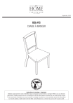 Septembre, 2023 DEL47C CHAISE À MANGER Instructions de montage – Important: Déballez soigneusement le colis et identifiez chaque composant avant de tenter un montage. Référez-vous à la liste des pièces jointe. Veuillez prendre soin lors du montage de l’unité et posez toujours les pièces sur une surface propre et lisse. Si vous avez besoin d’assistance en ce qui concerne le montage, les pièces ou si vous souhaitez recevoir des informations sur d’autres produits, veuillez visiter notre site Web: www.officestar.net, ou écrivez-nous par courriel ou par la poste. 1. Ne pas utiliser ce produit à moins que toutes les vis et tous les boulons soient resserrés. 2. Vérifier à tous les trois mois ou au besoin que toutes les vis et tous les boulons sont resserrés.. 3. Éliminer les matériaux de conditionnement d’une manière convenable. Ne pas utiliser la couverture en plastique pour couvrir la tête à cause du risque d’étouffement. 4. Ne pas utiliser ce produit comme un escabeau. 5. Ce produit ne doit servir qu’à l’usage pour lequel il a été conçu. 6. POUR USAGE INTÉRIEUR ET RÉSIDENTIEL SEULEMENT. GARANTIE LIMITÉE OSP Home Furnishings® garantit à l’acheteur original que ce produit sera exempt de tout défaut de pièces et de main d’oeuvre tel que décrit ci-dessous. OSP Home Furnishings® réparera ou remplacera, à sa discrétion, sans frais à l’acheteur original seulement, les produits ou les pièces défectueux/défectueuses durant une période d’un (1) an à compter de la date d’achat. Les pièces de rechange ne peuvent être fournies que lorsque celles-ci sont disponibles. Les pièces d’articles discontinués peuvent ne pas être disponibles. Cette garantie est effective pour la période de temps applicable à compter de la date d’achat indiquée sur votre reçu de vente original. Cette garantie est votre seul recours pour les défauts de produits et exclut les défauts liés à ou découlant d’un abus ou d’une mauvaise utilisation d’un produit, à l’utilisation d’une modification, ou d’accessoires, d’un produit, et aux produits ou pièces utilisés, entretenus ou installés contrairement aux directives d’installation, d’entretien ou autres applicables de l’entreprise. Il n’existe aucune autre garantie, expresse ou implicite, autre que celle expressément décrite, y compris, mais sans s’y limiter, toute garantie implicite de qualité marchande ou d’adéquation à un usage particulier. OSP Home Furnishings® ne sera pas tenue responsable des dommages directs ou indirects. Certains États ne permettent pas l’exclusion ou la limitation des dommages accidentels ou consécutifs, et donc les limitations ou exclusions susmentionnées peuvent ne pas s’appliquer à vous. Cette garantie vous donne des droits légaux spécifiques comme vous pouvez également avoir d’autres droits qui peuvent varier d’un État à un autre. Nos normes de qualité sont parmi les meilleures de l’industrie. Parfois, et malgré toutes nos tentatives, il existe des moments où les pièces peuvent être endommagées ou manquantes. Notre service des pièces de rechange fera tout son possible pour remédier rapidement à ce problème. Contactez-nous par courriel [email protected], par télécopieur 1-909-930-5629 ou par téléphone au numéro sans frais du service des pièces 1-800-950-7262, du lundi au vendredi de 8h00 à 15h30, heure du Pacifique. Pour faire une réclamation de garantie, contacter le service des pièces. Fournir le numéro de modèle, preuve de paiement, et une description du problème. À sa discrétion, OSP Home Furnishings®: (a) fournira des pièces compatibles de produits courants (b) réparera la pièce du client. Le client doit payer d’avance les frais de transport de toute pièce retournée à l’usine. Les frais de transport de retour pour des pièces encore sous garantie seront payés par OSP Home Furnishings®. PIÈCES (A) Dossier de Chaise (2 PCS) (B) Siège (2 PCS) (C) Jambe Avant (4 PCS) LISTE DU MATÉRIEL ÉT. DESSIN DESCRIPTION TAILLE QUANTITÉ 1 Boulon Hexagonal Phillips 1/4" x 75mm 8 PCS 2 Boulon Hexagonal Phillips 1/4" x 45mm 4 PCS 3 Rondelle Plate 5/16" 20 PCS 4 Rondelle Élastique 5/16" 20 PCS 5 Écrou 5/16" 8 PCS 6 Clé Hexagonale (Non Disponible) 1 PC ÉTAPE 1 1 6 2 4 B 4 3 A 3 x2 SERREZ COMPLÈTEMENT TOUS LES BOULONS ÉTAPE 2 C C x2 3 4 5 SERREZ COMPLÈTEMENT TOUS LES ÉCROUS RÉPÉTER LES ÉTAPE 1 ET 2 POUR ASSEMBLER LA 2ÈME CHAISE ">