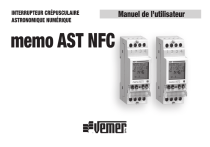 INTERRUPTEUR CRÉPUSCULAIRE ASTRONOMIQUE NUMÉRIQUE memo AST NFC Manuel de l’utilisateur ■ Menù NFC ■ Menu du compteur d’heures ■ Menu du reset ■ Menu du firmware ■ Messages d’erreurs ■ Remplacement de la batterie ■ Normes de référence -1Manuel utilisateur memo AST NFC page42 page43 page44 page46 page47 page48 page48 Français Index ■ Caractéristiques techniques page3 ■ Avertissements de sécurité page4 ■ Dimensions page4 ■ Schémas de raccordement page5 ■ Description de l’écran et du clavier page6 ■ Première mise en service page7 ■ Page d’accueil (ou principale) page8 ■ Description du menu page11 ■ Menu paramètres page12 Menu de réglage de la langue page 13 Menu de réglage de la date page 14 Menu de réglage de l’heure page 15 Menu de réglage du changement d’heure été/hiver page 16 Menu de réglage des coordonnées astronomiques page 18 Menu de réglage des commutations aléatoires page 20 Menu de réglage du code PIN de protection page 21 ■ Menu programme page22 Menu Programme: nouveau page 27 Menu Programme: nouveau astro nuit page 28 Menu Programme: nouveau astro journalier page 32 Menu Programme: nouveau astro hebdomadaire page 33 Menu Programme: nouveau astro vacances page 34 Menu Programme: vérifier page 36 Menu Programme: modifier page 38 Menu Programme: copier page 41 Menu Programme: effacer page 41 Français MANUEL UTILISATEUR Les horloges numériques de la série memo AST sont des dispositifs électroniques pour gérer les charges électriques entre les heures de coucher et de lever du soleil (programmation astronomique). Ils ont une interface NFC qui permet leur couplage avec des appareils mobiles (smartphone ou tablette) et, grâce à l’application gratuite téléchargeable sur Google Play, il est possible d’effectuer la programmation et les réglages directement sur votre smartphone, puis transférer toutes les données sur l’horloge. La procédure inverse est également possible, c’est-à-dire copier la programmation d’un horloge sur votre appareil mobile. La batterie de secours vous permet de conserver les paramètres même en cas de panne de courant et peut être remplacée par le couvercle au dos de l’horloge. Les horloges de la série memo sont des appareils électroniques qui effectuent des actions de type 1BTU, destinés à fonctionner dans des environnements de catégorie de surtension III et degré de pollution 2 selon la norme EN 60730-1. Code VE344800 VE343000 Modèle memo AST1 memo AST2 Description Interrupteur crépusculaire astronomique à 1 canal avec interface NFC Interrupteur crépusculaire astronomique à 2 canaux avec interface NFC -2Manuel utilisateur memo AST NFC • Alimentation: 230 Vac (-15% ÷ + 10%) 50/60 Hz • Consommation: - memo AST1: 1W (3,5 VA) - memo AST2: 1,5W (5,5 VA) • Batterie de secours au lithium 3V type CR2032 (le remplacement de la batterie doit être réalisée par du personnel technique qualifié) • Sortie: - memo AST1: 1 relais monostable en échange avec charge maximale commutable - Sur contact NC : 16 (4) A / 250 Vac - Sur contact NA : 16 (10) A / 250 Vac - memo AST2: 2 relais monostable en échange avec charge maximale commutable - Sur contact NC : 16 (4) A / 250 Vac - Sur contact NA : 16 (10) A / 250 Vac • Écran LCD avec rétroéclairage (actif avec alimentation de réseau électrique) • Interface de communication NFC • Programmes mémorisables: - memo AST1: 120 événements - memo AST2: 120 événements (divisibles sur 2 canaux) • • • • • • • Type d’actions: 1BTU Température de fonctionnement: -20 ÷ + 50°C Humidité de fonctionnement: 20 ÷ 90% sans condensation Température de stockage: -25°C ÷ + 70°C Boîte: 2 modules DIN Degré de protection: IP20 Isolation: renforcée entre les parties accessibles (avant) et toutes autres terminaux • Tension nominale de résistance aux impulsions : 4 kV -3Manuel utilisateur memo AST NFC Français CARACTÉRISTIQUES TECHNIQUES DIMENSIONS n Pendant l’installation et l’utilisation du produit les exigences suivantes doivent être respectées: 1) Le produit doit être installé par un personnel qualifié en suivant scrupuleusement les schémas de raccordement fournis dans ce manuel 2) Après son installation, les bornes doivent être rendues inaccessibles sans outils spécifiques. 3) Avant d’accéder aux bornes de raccordement, vérifier que les fils ne soient pas sous tension. 4) Ne pas brancher l’appareil ni le mettre sous tension si l’une de ses parties est endommagée. 5) L’appareil doit être installé et mise en service conformément aux normes des systèmes électriques en vigueur. 6) Ne pas utiliser l’appareil à des fins autres que celles indiquées 7) Dans le système électrique en amont du produit, un dispositif de protection doit être installé contre les surintensités 8) Le produit peut être utilisé dans des environnements avec catégorie de mesure III et degré de pollution 2, selon la Norme CEI EN 60730-1 -4Manuel utilisateur memo AST NFC 65 35 87 Français AVERTISSEMENTS DE SÉCURITÉ memo AST1 memo AST2 IMPORTANT : Typiquement, le dispositif est destiné à un montage indépendant dans les installations fixes à la température ambiante de 25 °C, pour lequel des câbles PVC normaux sont utilisés. En installant le dispositif dans des environnements réchauffés, est nécessaire d’utiliser des câbles spéciaux avec un T marking 110 °C. -5Manuel utilisateur memo AST NFC Français SCHÉMAS DE CONNEXION Français DESCRIPTION DE L’ÉCRAN ET DU CLAVIER C1 Informations générales Affichage de l’heure Indication de l’état du canal 1/ canal 2 état du canal commutations bloquées commutations aléatoires actives programme de vacances actif programme d’impulsion actif programme manuel actif Indication du jour de la semaine (DAY) C2 Activer l’écran Accéder au menu ESC (1 niveau en arrière) Touche “C1”: diminuer les données/menu précéden