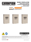 MANUEL D’INSTALLATION COMMUTATEUR DE TRANSFERT AUTOMATIQUE MAISON ENTIERE POUR ENTRÉE DE SERVICE Tous les modèles fleX Controller™ ACTIVEZ VOTRE GARANTIE en enregistrant votre produit : championpowerequipment.com ou rendez-vous sur championpowerequipment.com CONSERVEZ CES INSTRUCTIONS. Ce manuel contient des informations importantes relatives à la sécurité qui doivent être lues et comprises avant l’utilisation du produit. Dans le cas contraire, l’utilisateur s’expose à de graves blessures. Ce manuel doit être conservé avec le produit. Les spécifications, descriptions et illustrations figurant dans ce manuel correspondent aux informations connues au moment de la publication, mais peuvent être modifiées sans préavis. 5423-M-OP REV 20241223 FR Champion Power Equipment, Inc. COMMUTATEUR DE TRANSFERT AUTOMATIQUE MAISON ENTIERE- TOUS LES MODÈLES FLEX CONTROLLER™ TABLE DES MATIÈRES TABLE DES MATIÈRES Installation.......................................... ......... 13 Câbler l’ATS...................................................... 13 Introduction.................................................... 3 Câblage du Chargeur de Batterie....................... ......... 14 Définitions de sécurité................................... 3 Bloc de Fusibles de Détection D’utilité................. ......... 15 Instructions importantes relatives à la sécurité.......................................................... 4 Relais de commande basse tension.................... ......... 15 Instructions pour l’interrupteur de transfert automatique Champion avec module fleX Controller™.......................... 4 Ampoules à DEL.................................................. 16 Avant l’installation.................................................. 4 Voyants ATS primaires.................................. ......... 19 Étiquettes de sécurité.............................................. 5 Voyants ATS secondaires............................... ......... 19 Pictogrammes de sécurité......................................... 7 Méthode de configuration du WIFI.............................. 20 Commandes et caractéristiques..................... 8 Statut ATS et HSB en utilisant le WI-FI................. ......... 22 Interrupteur de transfert automatique Champion avec module fleX Controller™ - Modèle 201020 (100 A)........................ 8 Mode liaison (mode d’apprentissage du système).............. 22 Réglages du fleX Controller™................................... 15 Installation 400A................................................. 17 Connexion des systèmes de gestion de charge................. 22 Confirmation du mode liaison................................... 27 Interrupteur de transfert automatique Champion avec module fleX Controller™ Modèles 201039 (200 A) / 201355 (150 A)....................... 9 Système d’enseignement de la charge................. ......... 27 Vérification complète du système............................... 28 Étiquettes de sécurité et de données........................... 10 Spécifications...................................... ......... 29 Interrupteur de fonctionnement manuel...... 11 Précisions techniques................................... ......... 29 Déballage...................................................... 12 Résistance aux courts-circuits et valeurs de fermeture........ 29 Emplacement et montage........................................ 12 Fil – Capacité de cosse – Couple................................ 30 Oeillet(s) électriques............................................. 12 201020 Schéma de câblage de l’ATS.................. ......... 31 Câblage d’installation pour la prise de courant ATS............ 12 201039 Schéma de câblage de l’ATS........................... 32 201355 Schéma de câblage de l’ATS.................. ......... 33 Garantie........................................................ 34 POUR SCHÉMA DES PIÈCES Rechercher par numéro de modèle au championpowerequipment.com 2 Introduction COMMUTATEUR DE TRANSFERT AUTOMATIQUE MAISON ENTIERE- TOUS LES MODÈLES FLEX CONTROLLER™ INTRODUCTION DÉFINITIONS DE SÉCURITÉ Félicitations pour votre achat d’un produit de Champion Power Equipment (CPE). CPE conçoit, fabrique et offre un soutien à l’ensemble de nos produits conformément à de strictes spécifications et directives. Avec une connaissance appropriée du produit, une utilisation sûre et un entretien périodique, ce produit devrait satisfaire vos attentes pendant des années. Les pictogrammes de sécurité visent à attirer votre attention sur les dangers potentiels. Il est essentiel de bien comprendre la signification des pictogrammes de sécurité. Les avertissements de sécurité n’éliminent pas tout danger. Les instructions ou avertissements qu’ils fournissent ne peuvent pas remplacer les mesures de prévention d’accidents appropriées. Nous déployons tous nos efforts pour assurer l’exactitude et l’intégralité de l’information contenue dans le présent manuel et nous nous réservons le droit de modifier, de changer et/ou d’améliorer le produit et le présent document à tout moment et sans préavis. DANGER Le mot DANGER indique une situation dangereuse qui, si elle n’est pas évitée, causera des blessures graves ou mortelles. CPE accorde une grande importance à la façon dont nos produits sont conçus, fabriqués, utilisés et entretenus, ainsi qu’à la sécurité de l’opérateur et aux personnes se trouvant à proximité de la génératrice. Par conséquent, il est IMPORTANT d’examiner attentivement ce manuel du produit et toute autre documentation du produit et d’être pleinement conscient et bien informé de l’assemblage, du fonctionnement, des risques et de l’entretien du produit avant de l’utiliser. Familiarisez-vous bien avec le produit et assurez-vous que toute autre personne voulant l’utiliser fasse de même, en obser