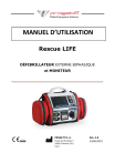 MANUEL D’UTILISATION Rescue LIFE DÉFIBRILLATEUR EXTERNE BIPHASIQUE et MONITEUR PROGETTI S.r.l. Strada del Rondello, 5 10028 Trofarello (TO) ITALY Rév. 2.8 23/06/2021 Rescue LIFE - Manuel d’utilisation Rescue LIFE - Manuel d’utilisation SOMMAIRE INFORMATIONS GÉNÉRALES ET DE SÉCURITÉ.................................................... 1 INSTRUCTIONS DE SÉCURITÉ ............................................................................................................... 2 RESPONSABILITÉ DES INFORMATIONS ................................................................................................. 2 INDICATIONS GÉNÉRALES .................................................................................................................... 2 PRÉCAUTIONS..................................................................................................................................... 3 RISQUE DE DÉCHARGE ÉLECTRIQUE OU D’INCENDIE............................................................................. 4 POSSIBILITÉ D’INTERFÉRENCES ÉLECTRIQUES ....................................................................................... 4 POSSIBILITÉ DE MAUVAIS FONCTIONNEMENT DE L’APPAREIL ............................................................... 5 POSSIBILITÉ D’ARRÊT OU DE NON MISE EN MARCHE DE L’APPAREIL ...................................................... 5 INDICATIONS GÉNÉRALES POUR LA SÉCURITÉ ÉLECTRIQUE ................................................................... 5 SYMBOLES UTILISÉS ............................................................................................................................ 6 INTRODUCTION .......................................................................................................................... 8 DÉBALLAGE ET INSPECTION ................................................................................................................. 8 LIGNES DIRECTRICES POUR LE FONCTIONNEMENT ET LA CONSERVATION DU DISPOSITIF ...................... 8 NETTOYAGE ET ENTRETIEN .................................................................................................................. 9 BRANCHEMENT À L'ALIMENTATION ................................................................................................... 10 CHARGE DE LA BATTERIE ................................................................................................................... 11 GARANTIE ........................................................................................................................................ 12 ASSISTANCE ...................................................................................................................................... 13 DESCRIPTION............................................................................................................................ 14 DU FONCTIONNEMENT DU PRODUIT ................................................................................................. 14 UTILISATION PRÉVUE (GROUPE DE PATIENTS ET CONDITIONS MÉDICALES) ...................................................................................................................... 15 INDICATIONS .................................................................................................................................... 16 CONTRE-INDICATIONS ....................................................................................................................... 16 DESCRIPTION DU PANNEAU FRONTAL ................................................................................................ 17 TOUCHES DU PANNEAU FRONTAL ...................................................................................................... 17 TOUCHES DE FONCTION (F1-F5) ......................................................................................................... 18 INDICATEURS LUMINEUX................................................................................................................... 19 CONNEXIONS.................................................................................................................................... 20 INTERFACE ÉCRAN DE DÉMARRAGE ................................................................................................... 21 ÉCRAN OPÉRATIONNEL ..................................................................................................................... 22 II Rescue LIFE - Manuel d’utilisation CARACTÉRISTIQUES DE L’ÉCRAN OPÉRATIONNEL................................................................................ 23 MENU PARAMÉTRAGES..................................................................................................................... 25 PRÉPARATION DE L’APPAREIL ET DU PATIENT ............................................................................ 27 Contrôle du produit .......................................................................................................................... 27 Comment tester le défibrillateur ....................................................................................................... 27 COMMENT UTILISER LE CÂBLE ECG DE CONNEXION AU PATIENT ET POSITIONNER LES ÉLECTRODES. ... 28 CONNEXIONS ECG ............................................................................................................................. 29 THÉRAPIE DE DÉFIBRILLATION .................................................................................................. 29 INFORMATIONS GÉNÉRALES POUR LES UTILISATEURS PROFESSIONNELS............................................. 30 PRÉPARATION DU PATIENT ................................................................................................................ 32 PRÉPARATION DU PATIENT PÉDIATRIQUE ........................................................................................... 33 MODE DE DÉFIBRILLATION.................