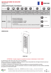 NOTICE DE MISE EN OEUVRE KRN1000_NTALL vC_230912 KRN1000 CARACTÉRISTIQUES TECHNIQUES hxlxp 151 x 43,50 x 24 mm 0,6 kg 12/24V AC/DC 110 mA sortie relais =2 30V DC - 2 A 125V AC - 0,5 A entrée bouton poussoir =2 1010 65* Relais 1 = 1000 Relais 2 = 10 0 - 99 s 3 modes de fonctionnement : ● LECTEUR DE PROXIMITÉ KRN1000 125 KHz (MARIN) ● LECTEUR DE PROXIMITÉ ou CODE ● LECTEUR DE PROXIMITÉ + CODE -10+60°C ATTENTION : dans ce cas, tous les utilisateurs doivent avoir 1 CODE et 1 BADGE DE PROXIMITE 3 m de câble *IP 65 : Protection contre les poussières, pas de dépôts nuisibles. Protection contre les jets d’eau à la lance de toutes directions DIMENSIONS KRN1000 ATTENTION : Veuillez respecter la polarité et la tension d’alimentation 12/24V AC/DC ! Lire attentivement cette notice avant mise en service et utilisation. Utiliser ce matériel pour une application adaptée. Le fabricant n’est pas responsable des dommages éventuels causés par une utilisation contraire aux dispositions de sécurité. Le montage, la maintenance et les réparations doivent être réalisés par un personnel spécialisé et autorisé. La mise en oeuvre est très simple, mais une manipulation correcte et un entretien approprié sont des conditions e ssentielles pour garantir un fonctionnement parfait. www.sewosy.com Depuis la France : 0 891 89 95 97 (service 0,80€ / min + prix appel) - From abroad: +33 (0)3 90 59 02 20 Les indications, photographies, images ou schémas présents sur cette notice n’engagent pas la société SEWOSY et n’ont aucune valeur contractuelle The informations, photographs, images, drawings contained in this leaflet does not engage the responsibility of SEWOSY and have no contractual value 1/20 MONTAGE Ø6 RACCORDEMENT Rouge Noir Brun Orange Jaune Vert Blanc Rose Vert clair Bleu Violet Gris + 12-24V - AC/DC BP 1 = Bouton poussoir Relais 1 CM BP1 BP2 BP 2 = Bouton poussoir Relais 2 GND NO 1 COM 1 NC 1 NO 2 COM 2 NC 2 Relais 1 Relais 2 CM = Contact Magnétique* Cellule photoélectrique d’autoprotection. Pour l’activer se référer à la page 10/20 "Autoprotection" *CM (Contact magnétique) : Si branchement d’un contact magnétique de porte sur cette entrée, en cas de temporisation assignée au contrôle d’accès, celle-ci s’annule lorsque que la porte est à nouveau fermée. 2/20 EXEMPLES DE CONFIGURATIONS RACCORDEMENT D’UNE GÂCHE ÉLECTRIQUE* VERROUILLAGE À ÉMISSION + - + Rouge - Noir ALIMENTATION Rose C Blanc NO C NO Vert GND Orange BP1 en option *exemple AC ou DC NO RACCORDEMENT D’UN PORTAIL* VERROUILLAGE À ÉMISSION 12-24V AC/DC 12-24V AC/DC + - 12-24V AC/DC + - ALIMENTATION + Rouge - Noir 12-24V AC/DC C Blanc NO C NO Rose Vert GND Orange BP1 C NO en option idéal pour portails NO *exemple RACCORDEMENT D’UNE VENTOUSE ÉLECTROMAGNÉTIQUE* VERROUILLAGE À RUPTURE ALIMEN*exemple TATION 12-24V Rouge 12-24 V DC AC/DC Noir + - Rose C Vert Clair NC Vert GND Orange BP1 DC C NO en option + - + - NO 3/20 SOMMAIRE Paramètres relais 1 1. Programmation d'un utilisateur (CARTE UNIQUEMENT)...................................... 5 2. Programmation d'un utilisateur (CARTE ou CODE)............................................... 5 3. Programmation d'un utilisateur (CARTE + CODE)................................................. 5 4. Temporisation du relais 1........................................................................................6 5. Supprimer un utilisateur du relais 1........................................................................ 6 6. Enregistrer des cartes en série...............................................................................6 Paramètres relais 2 7. Programmation d'un utilisateur (CARTE ou CODE)...............................................7 8. Temporisation du relais 2........................................................................................7 9. Supprimer un utilisateur du relais 2........................................................................ 7 Paramètres administrateurs 10. Changer le code maître.......................................................................................... 8 11. Créer une carte maître......................................................................................... 8 12. Modifier une carte maître..................................................................................... 8 13. Supprimer tous les utilisateurs............................................................................. 8 14. Retour réglage d'usine......................................................................................... 8 15. Restaurer le code maître d'origine ("1234" "1234").............................................. 8 Paramètres réglages 16. Activation du buzzer............................................................................................. 9 17. Désactivation du buzzer....................................................................................... 9 18. Activation du retroéclairage des touches du clavier............................................. 9 19. Désactivation du retroéclairage des touches du clavier....................................... 9 20. OPTIONNEL : Modification du nombre de chiffres des codes............................10 21. Activation de l'autoprotection..............................................................................10 22. Désactivation de l'autoprotection........................................................................10 4/20 P = procédure à suivre // E = exemple Code maître par défaut "1234" "1234" PARAMÈTRES RELAIS 1 Les codes ou cartes utilisateurs du relais 1 et 2 doivent être différents les uns des autres 1 P E 2 Programmation d’un utilisateur (CARTE UNIQUEMENT) ATTENTION : Dans ce cas aucun code utilisateur n'est disponible ! Étape 1 Étape 2 Code 2x ou Carte maître * 000 "1234" "1234" * 000 "1234" "1234" * 000 Programmation d’un utilisateur (CARTE ou CODE) ATTENTION : Le code m
