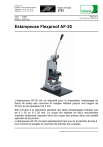 Habasit AG Postfach, CH-4153 Reinach-Basel Téléphone ++41 61 715 15 15 Télécopie ++41 61 715 15 55 Mode d’emploi 3703 Auteur: Gul/Nyk Edition: 01/0511 Remplace: Edition 9803 Page 1 de 16 Sous réserve de modifications Estampeuse Flexproof AF-30 L’estampeuse AF-30 est un dispositif pour la préparation (estampage en dents de scies) des courroies et sangles Habasit jusqu'à une largeur de 30 mm et une épaisseur de 3 mm. Elle convient à la géométrie standard des têtes d'estampages Habasit‚ pas de 6 x 30 ou 8 x 30 mm. La coupe est réalisée en deux mouvements manuels seulement‚ assurant ainsi une coupe très précise donc une solidité optimale de la jonction. L’estampeuse AF-30 convient spécialement bien pour la production de bas à haut volume de sangles et courroies de bobines pre-coupées. I:\data\Msf\fabdata\TOOLS\AF-30\BAL-2003\AF-30_fr.doc printed 01.03.06 11:27:00 Estampeuse Flexproof Mode d’emploi 3703 AF-30 Page 2 de 16 Sous réserve de modifications Edition:01/0511 Sommaire 1. 1.1 1.2 1.3 1.4 1.5 1.6 Informations générales ...................................................................................................................... 3 Application............................................................................................................................................. 3 Informations relatives à la sécurité ....................................................................................................... 3 Contenu détaillé .................................................................................................................................... 4 Commande d'accessoires / pièces de rechange .................................................................................. 4 Garantie ................................................................................................................................................ 4 Conseil technique ................................................................................................................................. 4 2. Fonctionnement .................................................................................................................................. 5 3. Positionnement initial en fonctionnement ....................................................................................... 5 4. 4.1 4.2 4.3 4.4 Estampage des extrémités de la bande/courroie ............................................................................ 6 Estampage Flexproof d’une bande/courroie......................................................................................... 6 La première opération débute à partir d’une nouvelle bobine de bande/courroie................................ 6 Poursuite de l’estampage Flexproof ..................................................................................................... 7 Procédé d’estampage Flexproof en série ............................................................................................. 7 5. 5.1 5.2 5.3 5.4 5.5 Service.................................................................................................................................................. 8 Maintenance.......................................................................................................................................... 8 Remplacement des lames .................................................................................................................... 8 Réglage de la coulisse de la tête d’estampage .................................................................................... 8 Réglage de la position de la tête d’estampage..................................................................................... 9 Remplacement du support d’estampage .............................................................................................. 9 6. Illustrations........................................................................................................................................ 10 7. Caractéristiques techniques............................................................................................................ 12 8. Dessins .............................................................................................................................................. 13 Annexe: Liste de vérification pour la maintenance préventive Formulaire de compte-rendu pour la maintenance préventive Responsabilité du fait des produits I:\data\Msf\fabdata\TOOLS\AF-30\BAL-2003\AF-30_fr.doc printed 01.03.06 11:27:00 Estampeuse Flexproof AF-30 Mode d’emploi 3703 Page 3 de 16 Sous réserve de modifications Edition:01/0511 1. Informations générales 1.1 Application L’estampeuse Flexproof AF-30 a été spécifiquement conçue pour la préparation (estampage en dents de scie) rapide et sûre des courroies et bandes Habasit en utilisant le procédé Flexproof. Les bandes et courroies peuvent être d’une largeur jusqu'à 30 mm/1.2 inch. L'épaisseur maximum est de 3 mm/0.12 inch. L’estampeuse Flexproof AF-30 a été développée exclusivement pour les applications décrites dans ce mode d’emploi. Une utilisation inadéquate ou pour des raisons autres que celles décrites dans ce mode d’emploi, n’est pas admissible. Habasit décline toute responsabilité quant aux conséquences liées à des applications non autorisées. L’estampeuse Flexproof AF-30 a été construite selon les règles reconnues de la technique et les connaissances technologiques actuelles; elle est conforme aux prescriptions en vigueur. Ce mode d’emploi implique que tous les travaux de montage, de maintenance et de réparation, ainsi que les opérations au moyen de l’estampeuse, soient exécutés par du personnel qualifié ou contrôlés par des équipes spécialisées responsables. Pour des raisons de clarté, les présentes instructions ne peuvent couvrir tous les aspects possibles d