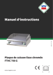 2025-07-25 Manuel d‘instructions Plaque de cuisson lisse chromée FTHC 708 G www.rmgastro.com PLAQUE DE CUISSON LISSE CHROMÉE · FTHC 708 G · 00019415 OBSAH 1. DÉCLARATION DE CONFORMITÉ 3 2. DONNÉES TECHNIQUES 3 3. TABLEAU DES GAZ AUXQUELS LE PRODUIT EST DESTINÉ 3 4. EMPLACEMENT DE L'ÉLECTRICITÉ 5 5. EMPLACEMENT GAZ 5 6. MESURES DE SÉCURITÉ DU POINT DE VUE DE LA PROTECTION INCENDIE 6 7. INSTALLATION 6 8. CONTRÔLE DES PERFORMANCES THERMIQUES 7 9. RACCORDEMENT DU TUYAU DE RACCORDEMENT AU GAZ 7 10. RACCORDEMENT GAZ LIQUIDE 7 11. RACCORDEMENT D'EAU 7 12. CONNEXION DU CÂBLE ÉLECTRIQUE AU RÉSEAU 7 13. VÉRIFIER LES PARAMÈTRES DE L'APPAREIL POUR LE TYPE DE GAZ 8 14. TABLEAU DES BUSES 8 15. VÉRIFICATION DES RÉGLAGES DE L‘APPAREIL EN FONCTION DU TYPE DE GAZ 9 16. MODE D‘EMPLOI 11 17. NETTOYAGE ET ENTRETIEN 12 2025-07-25 2 www.rmgastro.com PLAQUE DE CUISSON LISSE CHROMÉE · FTHC 708 G · 00019415 1. DÉCLARATION DE CONFORMITÉ Décret du Ministère de santé. 38/21 Sb. Règlement 197/26/CE - Règlement REACH, 1935/24/CE - Règlement relatif au contact alimentaire. Les produits répondent aux exigences du §26 de la loi n° 258/2 telle qu’en vigeur. Les produits répondent aux exigences de la directive RoHS 215/863/UE, 1/211, 517/214, 215/194, 215/195. Attention, le fabricant décline toute responsabilité en cas de dommages directs ou indirects résultant d’une mauvaise installation, d’interventions ou de modifications inappropriées, d’un entretien insuffisant, d’une utilisation incorrecte, ou encore d’autres causes mentionnées dans les conditions générales de vente. Cet appareil est exclusivement destiné à un usage professionnel et doit être manipulé par des personnes qualifiées. Les parties qui ont été réglées et sécurisées par le fabricant ou un technicien agréé ne doivent pas être modifiées par l’utilisateur. 2. DONNÉES TECHNIQUES L’étiquette de données techniques est située sur le panneau latéral ou arrière de l’appareil. Avant l’installation, étudiez le schéma de câblage et toutes les informations suivantes dans les instructions ci-jointes. Largeur nette [mm] Profondeur nette [mm] Hauteur nette [mm] Poids net [kg] Puissance gaz [kW] Dimensions de la planche à griller [mm x mm] 800 730 300 14.000 560 x 770 75.00 La puissance thermique nominale maximale et réduite, exprimée en kW, est basée sur la valeur Hi du gaz utilisé. Si le produit est connecté au GPL, la bouteille de gaz doit se trouver dans des pièces suffisamment ventilées. 3. TABLEAU DES GAZ AUXQUELS LE PRODUIT EST DESTINÉ Version Catégorie de produits Pressions de raccordement (mbar) Gaz utilisé Pays de destination A1 I2E 20 G20 DE, NL, PL, RO A1 I2ELL 20, 20 G20,G25 DE A1 I2E+ 20/25 G20/G25 BE, FR A1 I2H 2025-07-25 3 www.rmgastro.com PLAQUE DE CUISSON LISSE CHROMÉE · FTHC 708 G · 00019415 20 G20 AT, BG, CH, CZ, DK, HR, EE, ES, FI, GB, GR, IE, IT, LT, LV, NO, PT, RO, SE, SI, SK, TR, LU, CY , FR A1 I3B/P 30 G30 BG, CY, CZ, DK, GB, HR, EE, FI, FR, GR, HU, IT, LT, LV, MT, NL, NO, RO, SE, SI, SK, TR A1 I3B/P 50 G30 AT, DE, CZ, CH, FR, SK A1 I3P 37 G31 BE, CH, CZ, ES, GB, GR, IE, RO, SI, SK, FR, NL, PT, HR, IT, LT, PL, TR A1 I3+ 28-30/37 G30/G31 BE, CH, CY, CZ, EE, ES, FR, GB, GR, IE, IT, LT, PT, SI, SK, TR A1 II2E3B/P 20, 50 G20, G30 DE, PL, RO A1 II2ELL3B/P 20, 20, 50 G20, G25, G30 DE A1 II2E+3+ 20/25, 28-30/37 G20/G25, G30/G31 BE, FR A1 II2H3B/P 20, 30 G20, G30 BG, CZ, GB, DK, HR, EE, FI, GR, IT, LT, LV, NO, RO, SE, SI, SK, TR, CY, FR A1 2025-07-25 4 www.rmgastro.com PLAQUE DE CUISSON LISSE CHROMÉE · FTHC 708 G · 00019415 II2H3B/P 20, 50 G20, G30 AT, CH, CZ, FR, SK A1 II2H3P 20, 37 G20, G31 CH, CZ, ES, GB, GR, IE, RO, SI, SK A1 II2H3+ 20, 28-30/37 G20, G30/G31 CH, CY, CZ, EE, ES, GB, GR, IE, IT, LT, PT, SK, SI, TR 4. EMPLACEMENT DE L'ÉLECTRICITÉ Pour le bon fonctionnement et le placement de l'appareil, il est nécessaire de respecter toutes les normes prescrites suivantes pour le marché concerné. Déballez l'appareil et vérifiez qu'il n'a pas été endommagé pendant le transport. Placez l'appareil sur une surface horizontale (dénivelé maximum jusqu'à 2°). Les petites irrégularités peuvent être nivelées avec des pieds réglables. Si l'appareil est placé de manière à être en contact avec les parois des meubles, ceux-ci doivent résister à une température allant jusqu'à 60°C. L'installation, le réglage, la mise en service doivent être effectués par une personne qualifiée et autorisée à effectuer de telles opérations, selon les normes en vigueur. L’appareil peut être installé individuellement ou en série avec d’autres appareils de notre fabrication. Une distance minimale de 10 cm doit être respectée par rapport aux matériaux inflammables. Dans ce cas, des aménagements appropriés doivent être prévus pour garantir une isolation thermique adéquate des parties inflammables. L'appareil doit être installé uniquement sur une surface ininflammable ou contre un mur ininflammable. Les composants de l’appareil sécurisés par le fabricant ou son représentant ne doivent pas être modifiés par le personnel effectuant l’installation de l’appareil. 5. EMPLACEMENT GAZ Pour un fonctionnement et un emplacement corrects de l'appareil, il est nécessaire de respecter toutes les directives et normes du pays en question. Déballez l'appareil et vérifiez qu'il n'a pas été endommagé pendant le transport. Placez l'appareil sur une surface horizontale (dénivelé maximum jusqu'à 2°). Les petites irrégularités peuvent être nivelées avec des pieds réglables. Si l'appareil est placé de manière à être en contact avec les parois des meubles, ceux-ci doivent résister à une température allant jusqu'à 60°C. L'installation, le réglage, la mise en service doivent être effectués par une personne qualifiée et autorisée à effectuer de telles opérations, selon les normes en vigueur. L'appareil peut être install