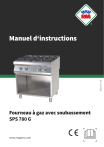 2025-07-25 Manuel d‘instructions Fourneau à gaz avec soubassement SPS 780 G www.rmgastro.com FOURNEAU À GAZ AVEC SOUBASSEMENT · SPS 780 G · 00008291 OBSAH 1. DÉCLARATION DE CONFORMITÉ 3 2. DONNÉES TECHNIQUES 3 3. TABLEAU DES GAZ AUXQUELS LE PRODUIT EST DESTINÉ 3 4. EMPLACEMENT DE L'ÉLECTRICITÉ 5 5. EMPLACEMENT GAZ 5 6. MESURES DE SÉCURITÉ DU POINT DE VUE DE LA PROTECTION INCENDIE 5 7. INSTALLATION 6 8. CONTRÔLE DES PERFORMANCES THERMIQUES 6 9. RACCORDEMENT DU TUYAU DE RACCORDEMENT AU GAZ 7 10. RACCORDEMENT GAZ LIQUIDE 7 11. RACCORDEMENT D'EAU 7 12. CONNEXION DU CÂBLE ÉLECTRIQUE AU RÉSEAU 7 13. VÉRIFIER LES PARAMÈTRES DE L'APPAREIL POUR LE TYPE DE GAZ 8 14. VÉRIFICATION DES RÉGLAGES DE L‘APPAREIL EN FONCTION DU TYPE DE GAZ 9 15. MODE D‘EMPLOI 11 16. NETTOYAGE ET ENTRETIEN 11 2025-07-25 2 www.rmgastro.com FOURNEAU À GAZ AVEC SOUBASSEMENT · SPS 780 G · 00008291 1. DÉCLARATION DE CONFORMITÉ Décret du Ministère de santé. 38/21 Sb. Règlement 197/26/CE - Règlement REACH, 1935/24/CE - Règlement relatif au contact alimentaire. Les produits répondent aux exigences du §26 de la loi n° 258/2 telle qu’en vigeur. Les produits répondent aux exigences de la directive RoHS 215/863/UE, 1/211, 517/214, 215/194, 215/195. Attention, le fabricant décline toute responsabilité en cas de dommages directs ou indirects résultant d’une mauvaise installation, d’interventions ou de modifications inappropriées, d’un entretien insuffisant, d’une utilisation incorrecte, ou encore d’autres causes mentionnées dans les conditions générales de vente. Cet appareil est exclusivement destiné à un usage professionnel et doit être manipulé par des personnes qualifiées. Les parties qui ont été réglées et sécurisées par le fabricant ou un technicien agréé ne doivent pas être modifiées par l’utilisateur. 2. DONNÉES TECHNIQUES L’étiquette de données techniques est située sur le panneau latéral ou arrière de l’appareil. Avant l’installation, étudiez le schéma de câblage et toutes les informations suivantes dans les instructions ci-jointes. Largeur nette [mm] Profondeur nette [mm] Hauteur nette [mm] Poids net [kg] Puissance gaz [kW] 800 900 900 65.50 29.500 La puissance thermique nominale maximale et réduite, exprimée en kW, est basée sur la valeur Hi du gaz utilisé. Si le produit est connecté au GPL, la bouteille de gaz doit se trouver dans des pièces suffisamment ventilées. 3. TABLEAU DES GAZ AUXQUELS LE PRODUIT EST DESTINÉ Version Catégorie de produits Pressions de raccordement (mbar) Gaz utilisé Pays de destination A1 I2E 20 G20 DE, NL, PL, RO A1 I2ELL 20, 20 G20,G25 DE A1 I2E+ 20/25 G20/G25 BE, FR A1 I2H 20 2025-07-25 3 www.rmgastro.com FOURNEAU À GAZ AVEC SOUBASSEMENT · SPS 780 G · 00008291 G20 AT, BG, CH, CZ, DK, HR, EE, ES, FI, GB, GR, IE, IT, LT, LV, NO, PT, RO, SE, SI, SK, TR, LU, CY , FR A1 I3B/P 30 G30 BG, CY, CZ, DK, GB, HR, EE, FI, FR, GR, HU, IT, LT, LV, MT, NL, NO, RO, SE, SI, SK, TR A1 I3B/P 50 G30 AT, DE, CZ, CH, FR, SK A1 I3P 37 G31 BE, CH, CZ, ES, GB, GR, IE, RO, SI, SK, FR, NL, PT, HR, IT, LT, PL, TR A1 I3+ 28-30/37 G30/G31 BE, CH, CY, CZ, EE, ES, FR, GB, GR, IE, IT, LT, PT, SI, SK, TR A1 II2E3B/P 20, 50 G20, G30 DE, PL, RO A1 II2ELL3B/P 20, 20, 50 G20, G25, G30 DE A1 II2E+3+ 20/25, 28-30/37 G20/G25, G30/G31 BE, FR A1 II2H3B/P 20, 30 G20, G30 BG, CZ, GB, DK, HR, EE, FI, GR, IT, LT, LV, NO, RO, SE, SI, SK, TR, CY, FR A1 II2H3B/P 2025-07-25 4 www.rmgastro.com FOURNEAU À GAZ AVEC SOUBASSEMENT · SPS 780 G · 00008291 20, 50 G20, G30 AT, CH, CZ, FR, SK A1 II2H3P 20, 37 G20, G31 CH, CZ, ES, GB, GR, IE, RO, SI, SK A1 II2H3+ 20, 28-30/37 G20, G30/G31 CH, CY, CZ, EE, ES, GB, GR, IE, IT, LT, PT, SK, SI, TR 4. EMPLACEMENT DE L'ÉLECTRICITÉ Pour le bon fonctionnement et le placement de l'appareil, il est nécessaire de respecter toutes les normes prescrites suivantes pour le marché concerné. Déballez l'appareil et vérifiez qu'il n'a pas été endommagé pendant le transport. Placez l'appareil sur une surface horizontale (dénivelé maximum jusqu'à 2°). Les petites irrégularités peuvent être nivelées avec des pieds réglables. Si l'appareil est placé de manière à être en contact avec les parois des meubles, ceux-ci doivent résister à une température allant jusqu'à 60°C. L'installation, le réglage, la mise en service doivent être effectués par une personne qualifiée et autorisée à effectuer de telles opérations, selon les normes en vigueur. L’appareil peut être installé individuellement ou en série avec d’autres appareils de notre fabrication. Une distance minimale de 10 cm doit être respectée par rapport aux matériaux inflammables. Dans ce cas, des aménagements appropriés doivent être prévus pour garantir une isolation thermique adéquate des parties inflammables. L'appareil doit être installé uniquement sur une surface ininflammable ou contre un mur ininflammable. Les composants de l’appareil sécurisés par le fabricant ou son représentant ne doivent pas être modifiés par le personnel effectuant l’installation de l’appareil. 5. EMPLACEMENT GAZ Pour un fonctionnement et un emplacement corrects de l'appareil, il est nécessaire de respecter toutes les directives et normes du pays en question. Déballez l'appareil et vérifiez qu'il n'a pas été endommagé pendant le transport. Placez l'appareil sur une surface horizontale (dénivelé maximum jusqu'à 2°). Les petites irrégularités peuvent être nivelées avec des pieds réglables. Si l'appareil est placé de manière à être en contact avec les parois des meubles, ceux-ci doivent résister à une température allant jusqu'à 60°C. L'installation, le réglage, la mise en service doivent être effectués par une personne qualifiée et autorisée à effectuer de telles opérations, selon les normes en vigueur. L'appareil peut être installé séparément ou en série avec des appareils de notre production. Une distanc