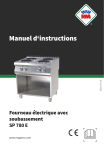 2025-07-25 Manuel d‘instructions Fourneau électrique avec soubassement SP 780 E www.rmgastro.com FOURNEAU ÉLECTRIQUE AVEC SOUBASSEMENT · SP 780 E · 00014769 OBSAH 1. DÉCLARATION DE CONFORMITÉ 3 2. DONNÉES TECHNIQUES 3 3. TABLEAU DES GAZ AUXQUELS LE PRODUIT EST DESTINÉ 3 4. EMPLACEMENT DE L'ÉLECTRICITÉ 5 5. EMPLACEMENT GAZ 5 6. MESURES DE SÉCURITÉ DU POINT DE VUE DE LA PROTECTION INCENDIE 5 7. INSTALLATION 6 8. CONTRÔLE DES PERFORMANCES THERMIQUES 6 9. RACCORDEMENT DU TUYAU DE RACCORDEMENT AU GAZ 7 10. RACCORDEMENT GAZ LIQUIDE 7 11. RACCORDEMENT D'EAU 7 12. CONNEXION DU CÂBLE ÉLECTRIQUE AU RÉSEAU 7 13. VÉRIFIER LES PARAMÈTRES DE L'APPAREIL POUR LE TYPE DE GAZ 8 14. MODE D‘EMPLOI 8 15. NETTOYAGE ET ENTRETIEN 9 2025-07-25 2 www.rmgastro.com FOURNEAU ÉLECTRIQUE AVEC SOUBASSEMENT · SP 780 E · 00014769 1. DÉCLARATION DE CONFORMITÉ Décret du Ministère de santé. 38/21 Sb. Règlement 197/26/CE - Règlement REACH, 1935/24/CE - Règlement relatif au contact alimentaire. Les produits répondent aux exigences du §26 de la loi n° 258/2 telle qu’en vigeur. Les produits répondent aux exigences de la directive RoHS 215/863/UE, 1/211, 517/214, 215/194, 215/195. Attention, le fabricant décline toute responsabilité en cas de dommages directs ou indirects résultant d’une mauvaise installation, d’interventions ou de modifications inappropriées, d’un entretien insuffisant, d’une utilisation incorrecte, ou encore d’autres causes mentionnées dans les conditions générales de vente. Cet appareil est exclusivement destiné à un usage professionnel et doit être manipulé par des personnes qualifiées. Les parties qui ont été réglées et sécurisées par le fabricant ou un technicien agréé ne doivent pas être modifiées par l’utilisateur. 2. DONNÉES TECHNIQUES L’étiquette de données techniques est située sur le panneau latéral ou arrière de l’appareil. Avant l’installation, étudiez le schéma de câblage et toutes les informations suivantes dans les instructions ci-jointes. Largeur nette [mm] Profondeur nette [mm] Hauteur nette [mm] Poids net [kg] Puissance électrique [kW] Alimentation 800 900 900 10.400 400 V / 3N - 50 Hz 59.50 La puissance thermique nominale maximale et réduite, exprimée en kW, est basée sur la valeur Hi du gaz utilisé. Si le produit est connecté au GPL, la bouteille de gaz doit se trouver dans des pièces suffisamment ventilées. 3. TABLEAU DES GAZ AUXQUELS LE PRODUIT EST DESTINÉ Version Catégorie de produits Pressions de raccordement (mbar) Gaz utilisé Pays de destination A1 I2E 20 G20 DE, NL, PL, RO A1 I2ELL 20, 20 G20,G25 DE A1 I2E+ 20/25 G20/G25 BE, FR A1 I2H 20 2025-07-25 3 www.rmgastro.com FOURNEAU ÉLECTRIQUE AVEC SOUBASSEMENT · SP 780 E · 00014769 G20 AT, BG, CH, CZ, DK, HR, EE, ES, FI, GB, GR, IE, IT, LT, LV, NO, PT, RO, SE, SI, SK, TR, LU, CY , FR A1 I3B/P 30 G30 BG, CY, CZ, DK, GB, HR, EE, FI, FR, GR, HU, IT, LT, LV, MT, NL, NO, RO, SE, SI, SK, TR A1 I3B/P 50 G30 AT, DE, CZ, CH, FR, SK A1 I3P 37 G31 BE, CH, CZ, ES, GB, GR, IE, RO, SI, SK, FR, NL, PT, HR, IT, LT, PL, TR A1 I3+ 28-30/37 G30/G31 BE, CH, CY, CZ, EE, ES, FR, GB, GR, IE, IT, LT, PT, SI, SK, TR A1 II2E3B/P 20, 50 G20, G30 DE, PL, RO A1 II2ELL3B/P 20, 20, 50 G20, G25, G30 DE A1 II2E+3+ 20/25, 28-30/37 G20/G25, G30/G31 BE, FR A1 II2H3B/P 20, 30 G20, G30 BG, CZ, GB, DK, HR, EE, FI, GR, IT, LT, LV, NO, RO, SE, SI, SK, TR, CY, FR A1 II2H3B/P 2025-07-25 4 www.rmgastro.com FOURNEAU ÉLECTRIQUE AVEC SOUBASSEMENT · SP 780 E · 00014769 20, 50 G20, G30 AT, CH, CZ, FR, SK A1 II2H3P 20, 37 G20, G31 CH, CZ, ES, GB, GR, IE, RO, SI, SK A1 II2H3+ 20, 28-30/37 G20, G30/G31 CH, CY, CZ, EE, ES, GB, GR, IE, IT, LT, PT, SK, SI, TR 4. EMPLACEMENT DE L'ÉLECTRICITÉ Pour le bon fonctionnement et le placement de l'appareil, il est nécessaire de respecter toutes les normes prescrites suivantes pour le marché concerné. Déballez l'appareil et vérifiez qu'il n'a pas été endommagé pendant le transport. Placez l'appareil sur une surface horizontale (dénivelé maximum jusqu'à 2°). Les petites irrégularités peuvent être nivelées avec des pieds réglables. Si l'appareil est placé de manière à être en contact avec les parois des meubles, ceux-ci doivent résister à une température allant jusqu'à 60°C. L'installation, le réglage, la mise en service doivent être effectués par une personne qualifiée et autorisée à effectuer de telles opérations, selon les normes en vigueur. L’appareil peut être installé individuellement ou en série avec d’autres appareils de notre fabrication. Une distance minimale de 10 cm doit être respectée par rapport aux matériaux inflammables. Dans ce cas, des aménagements appropriés doivent être prévus pour garantir une isolation thermique adéquate des parties inflammables. L'appareil doit être installé uniquement sur une surface ininflammable ou contre un mur ininflammable. Les composants de l’appareil sécurisés par le fabricant ou son représentant ne doivent pas être modifiés par le personnel effectuant l’installation de l’appareil. 5. EMPLACEMENT GAZ Pour un fonctionnement et un emplacement corrects de l'appareil, il est nécessaire de respecter toutes les directives et normes du pays en question. Déballez l'appareil et vérifiez qu'il n'a pas été endommagé pendant le transport. Placez l'appareil sur une surface horizontale (dénivelé maximum jusqu'à 2°). Les petites irrégularités peuvent être nivelées avec des pieds réglables. Si l'appareil est placé de manière à être en contact avec les parois des meubles, ceux-ci doivent résister à une température allant jusqu'à 60°C. L'installation, le réglage, la mise en service doivent être effectués par une personne qualifiée et autorisée à effectuer de telles opérations, selon les normes en vigueur. L'appareil peut être installé séparément ou en série avec des appareils de notre production. Une distance minimale de 10 cm