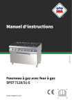 2025-07-25 Manuel d‘instructions Fourneau à gaz avec four à gaz SPST 7120/31 G www.rmgastro.com FOURNEAU À GAZ AVEC FOUR À GAZ · SPST 7120/31 G · 00014806 OBSAH 1. DÉCLARATION DE CONFORMITÉ 3 2. DONNÉES TECHNIQUES 3 3. TABLEAU DES GAZ AUXQUELS LE PRODUIT EST DESTINÉ 3 4. EMPLACEMENT DE L'ÉLECTRICITÉ 5 5. EMPLACEMENT GAZ 5 6. MESURES DE SÉCURITÉ DU POINT DE VUE DE LA PROTECTION INCENDIE 6 7. INSTALLATION 6 8. CONTRÔLE DES PERFORMANCES THERMIQUES 7 9. RACCORDEMENT DU TUYAU DE RACCORDEMENT AU GAZ 7 10. RACCORDEMENT GAZ LIQUIDE 7 11. RACCORDEMENT D'EAU 7 12. CONNEXION DU CÂBLE ÉLECTRIQUE AU RÉSEAU 7 13. VÉRIFIER LES PARAMÈTRES DE L'APPAREIL POUR LE TYPE DE GAZ 8 14. DONNÉES TECHNIQUES DU BRÛLEUR 8 15. VÉRIFICATION DES RÉGLAGES DE L‘APPAREIL EN FONCTION DU TYPE DE GAZ 9 16. VÉRIFICATION DU RÉGLAGE DU GAZ DE L‘APPAREIL (FOUR) 12 17. MODE D‘EMPLOI 13 18. CONTRÔLE DU FOUR 14 19. NETTOYAGE ET ENTRETIEN 15 2025-07-25 2 www.rmgastro.com FOURNEAU À GAZ AVEC FOUR À GAZ · SPST 7120/31 G · 00014806 1. DÉCLARATION DE CONFORMITÉ Décret du Ministère de santé. 38/21 Sb. Règlement 197/26/CE - Règlement REACH, 1935/24/CE - Règlement relatif au contact alimentaire. Les produits répondent aux exigences du §26 de la loi n° 258/2 telle qu’en vigeur. Les produits répondent aux exigences de la directive RoHS 215/863/UE, 1/211, 517/214, 215/194, 215/195. Attention, le fabricant décline toute responsabilité en cas de dommages directs ou indirects résultant d’une mauvaise installation, d’interventions ou de modifications inappropriées, d’un entretien insuffisant, d’une utilisation incorrecte, ou encore d’autres causes mentionnées dans les conditions générales de vente. Cet appareil est exclusivement destiné à un usage professionnel et doit être manipulé par des personnes qualifiées. Les parties qui ont été réglées et sécurisées par le fabricant ou un technicien agréé ne doivent pas être modifiées par l’utilisateur. 2. DONNÉES TECHNIQUES L’étiquette de données techniques est située sur le panneau latéral ou arrière de l’appareil. Avant l’installation, étudiez le schéma de câblage et toutes les informations suivantes dans les instructions ci-jointes. Largeur nette [mm] Profondeur nette [mm] Hauteur nette [mm] Poids net [kg] 1200 900 900 150.00 Puissance gaz [kW] Type de four Puissance du four à gaz [kW] Taille du four 52.500 À gaz, statique 10.50 GN 3x 1/1 La puissance thermique nominale maximale et réduite, exprimée en kW, est basée sur la valeur Hi du gaz utilisé. Si le produit est connecté au GPL, la bouteille de gaz doit se trouver dans des pièces suffisamment ventilées. 3. TABLEAU DES GAZ AUXQUELS LE PRODUIT EST DESTINÉ Version Catégorie de produits Pressions de raccordement (mbar) Gaz utilisé Pays de destination A1 I2E 20 G20 DE, NL, PL, RO A1 I2ELL 20, 20 G20,G25 DE A1 I2E+ 20/25 G20/G25 BE, FR A1 2025-07-25 3 www.rmgastro.com FOURNEAU À GAZ AVEC FOUR À GAZ · SPST 7120/31 G · 00014806 I2H 20 G20 AT, BG, CH, CZ, DK, HR, EE, ES, FI, GB, GR, IE, IT, LT, LV, NO, PT, RO, SE, SI, SK, TR, LU, CY , FR A1 I3B/P 30 G30 BG, CY, CZ, DK, GB, HR, EE, FI, FR, GR, HU, IT, LT, LV, MT, NL, NO, RO, SE, SI, SK, TR A1 I3B/P 50 G30 AT, DE, CZ, CH, FR, SK A1 I3P 37 G31 BE, CH, CZ, ES, GB, GR, IE, RO, SI, SK, FR, NL, PT, HR, IT, LT, PL, TR A1 I3+ 28-30/37 G30/G31 BE, CH, CY, CZ, EE, ES, FR, GB, GR, IE, IT, LT, PT, SI, SK, TR A1 II2E3B/P 20, 50 G20, G30 DE, PL, RO A1 II2ELL3B/P 20, 20, 50 G20, G25, G30 DE A1 II2E+3+ 20/25, 28-30/37 G20/G25, G30/G31 BE, FR A1 II2H3B/P 20, 30 G20, G30 BG, CZ, GB, DK, HR, EE, FI, GR, IT, LT, LV, NO, RO, SE, SI, SK, TR, CY, FR 2025-07-25 4 www.rmgastro.com FOURNEAU À GAZ AVEC FOUR À GAZ · SPST 7120/31 G · 00014806 A1 II2H3B/P 20, 50 G20, G30 AT, CH, CZ, FR, SK A1 II2H3P 20, 37 G20, G31 CH, CZ, ES, GB, GR, IE, RO, SI, SK A1 II2H3+ 20, 28-30/37 G20, G30/G31 CH, CY, CZ, EE, ES, GB, GR, IE, IT, LT, PT, SK, SI, TR 4. EMPLACEMENT DE L'ÉLECTRICITÉ Pour le bon fonctionnement et le placement de l'appareil, il est nécessaire de respecter toutes les normes prescrites suivantes pour le marché concerné. Déballez l'appareil et vérifiez qu'il n'a pas été endommagé pendant le transport. Placez l'appareil sur une surface horizontale (dénivelé maximum jusqu'à 2°). Les petites irrégularités peuvent être nivelées avec des pieds réglables. Si l'appareil est placé de manière à être en contact avec les parois des meubles, ceux-ci doivent résister à une température allant jusqu'à 60°C. L'installation, le réglage, la mise en service doivent être effectués par une personne qualifiée et autorisée à effectuer de telles opérations, selon les normes en vigueur. L’appareil peut être installé individuellement ou en série avec d’autres appareils de notre fabrication. Une distance minimale de 10 cm doit être respectée par rapport aux matériaux inflammables. Dans ce cas, des aménagements appropriés doivent être prévus pour garantir une isolation thermique adéquate des parties inflammables. L'appareil doit être installé uniquement sur une surface ininflammable ou contre un mur ininflammable. Les composants de l’appareil sécurisés par le fabricant ou son représentant ne doivent pas être modifiés par le personnel effectuant l’installation de l’appareil. 5. EMPLACEMENT GAZ Pour un fonctionnement et un emplacement corrects de l'appareil, il est nécessaire de respecter toutes les directives et normes du pays en question. Déballez l'appareil et vérifiez qu'il n'a pas été endommagé pendant le transport. Placez l'appareil sur une surface horizontale (dénivelé maximum jusqu'à 2°). Les petites irrégularités peuvent être nivelées avec des pieds réglables. Si l'appareil est placé de manière à être en contact avec les parois des meubles, ceux-ci doivent résister à une température allant jusqu'à 60°C. L'installation, le réglage, la mise en service do