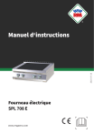2025-07-25 Manuel d‘instructions Fourneau électrique SPL 708 E www.rmgastro.com FOURNEAU ÉLECTRIQUE · SPL 708 E · 00014775 OBSAH 1. DÉCLARATION DE CONFORMITÉ 3 2. DONNÉES TECHNIQUES 3 3. TABLEAU DES GAZ AUXQUELS LE PRODUIT EST DESTINÉ 3 4. EMPLACEMENT DE L'ÉLECTRICITÉ 5 5. EMPLACEMENT GAZ 5 6. MESURES DE SÉCURITÉ DU POINT DE VUE DE LA PROTECTION INCENDIE 5 7. INSTALLATION 6 8. CONTRÔLE DES PERFORMANCES THERMIQUES 6 9. RACCORDEMENT DU TUYAU DE RACCORDEMENT AU GAZ 7 10. RACCORDEMENT GAZ LIQUIDE 7 11. RACCORDEMENT D'EAU 7 12. CONNEXION DU CÂBLE ÉLECTRIQUE AU RÉSEAU 7 13. VÉRIFIER LES PARAMÈTRES DE L'APPAREIL POUR LE TYPE DE GAZ 8 14. MODE D‘EMPLOI 8 15. NETTOYAGE ET ENTRETIEN 9 2025-07-25 2 www.rmgastro.com FOURNEAU ÉLECTRIQUE · SPL 708 E · 00014775 1. DÉCLARATION DE CONFORMITÉ Décret du Ministère de santé. 38/21 Sb. Règlement 197/26/CE - Règlement REACH, 1935/24/CE - Règlement relatif au contact alimentaire. Les produits répondent aux exigences du §26 de la loi n° 258/2 telle qu’en vigeur. Les produits répondent aux exigences de la directive RoHS 215/863/UE, 1/211, 517/214, 215/194, 215/195. Attention, le fabricant décline toute responsabilité en cas de dommages directs ou indirects résultant d’une mauvaise installation, d’interventions ou de modifications inappropriées, d’un entretien insuffisant, d’une utilisation incorrecte, ou encore d’autres causes mentionnées dans les conditions générales de vente. Cet appareil est exclusivement destiné à un usage professionnel et doit être manipulé par des personnes qualifiées. Les parties qui ont été réglées et sécurisées par le fabricant ou un technicien agréé ne doivent pas être modifiées par l’utilisateur. 2. DONNÉES TECHNIQUES L’étiquette de données techniques est située sur le panneau latéral ou arrière de l’appareil. Avant l’installation, étudiez le schéma de câblage et toutes les informations suivantes dans les instructions ci-jointes. Largeur nette [mm] Profondeur nette [mm] Hauteur nette [mm] Poids net [kg] Puissance électrique [kW] Alimentation 800 300 300 10.000 400 V / 3N - 50 Hz 40.00 La puissance thermique nominale maximale et réduite, exprimée en kW, est basée sur la valeur Hi du gaz utilisé. Si le produit est connecté au GPL, la bouteille de gaz doit se trouver dans des pièces suffisamment ventilées. 3. TABLEAU DES GAZ AUXQUELS LE PRODUIT EST DESTINÉ Version Catégorie de produits Pressions de raccordement (mbar) Gaz utilisé Pays de destination A1 I2E 20 G20 DE, NL, PL, RO A1 I2ELL 20, 20 G20,G25 DE A1 I2E+ 20/25 G20/G25 BE, FR A1 I2H 20 2025-07-25 3 www.rmgastro.com FOURNEAU ÉLECTRIQUE · SPL 708 E · 00014775 G20 AT, BG, CH, CZ, DK, HR, EE, ES, FI, GB, GR, IE, IT, LT, LV, NO, PT, RO, SE, SI, SK, TR, LU, CY , FR A1 I3B/P 30 G30 BG, CY, CZ, DK, GB, HR, EE, FI, FR, GR, HU, IT, LT, LV, MT, NL, NO, RO, SE, SI, SK, TR A1 I3B/P 50 G30 AT, DE, CZ, CH, FR, SK A1 I3P 37 G31 BE, CH, CZ, ES, GB, GR, IE, RO, SI, SK, FR, NL, PT, HR, IT, LT, PL, TR A1 I3+ 28-30/37 G30/G31 BE, CH, CY, CZ, EE, ES, FR, GB, GR, IE, IT, LT, PT, SI, SK, TR A1 II2E3B/P 20, 50 G20, G30 DE, PL, RO A1 II2ELL3B/P 20, 20, 50 G20, G25, G30 DE A1 II2E+3+ 20/25, 28-30/37 G20/G25, G30/G31 BE, FR A1 II2H3B/P 20, 30 G20, G30 BG, CZ, GB, DK, HR, EE, FI, GR, IT, LT, LV, NO, RO, SE, SI, SK, TR, CY, FR A1 II2H3B/P 2025-07-25 4 www.rmgastro.com FOURNEAU ÉLECTRIQUE · SPL 708 E · 00014775 20, 50 G20, G30 AT, CH, CZ, FR, SK A1 II2H3P 20, 37 G20, G31 CH, CZ, ES, GB, GR, IE, RO, SI, SK A1 II2H3+ 20, 28-30/37 G20, G30/G31 CH, CY, CZ, EE, ES, GB, GR, IE, IT, LT, PT, SK, SI, TR 4. EMPLACEMENT DE L'ÉLECTRICITÉ Pour le bon fonctionnement et le placement de l'appareil, il est nécessaire de respecter toutes les normes prescrites suivantes pour le marché concerné. Déballez l'appareil et vérifiez qu'il n'a pas été endommagé pendant le transport. Placez l'appareil sur une surface horizontale (dénivelé maximum jusqu'à 2°). Les petites irrégularités peuvent être nivelées avec des pieds réglables. Si l'appareil est placé de manière à être en contact avec les parois des meubles, ceux-ci doivent résister à une température allant jusqu'à 60°C. L'installation, le réglage, la mise en service doivent être effectués par une personne qualifiée et autorisée à effectuer de telles opérations, selon les normes en vigueur. L’appareil peut être installé individuellement ou en série avec d’autres appareils de notre fabrication. Une distance minimale de 10 cm doit être respectée par rapport aux matériaux inflammables. Dans ce cas, des aménagements appropriés doivent être prévus pour garantir une isolation thermique adéquate des parties inflammables. L'appareil doit être installé uniquement sur une surface ininflammable ou contre un mur ininflammable. Les composants de l’appareil sécurisés par le fabricant ou son représentant ne doivent pas être modifiés par le personnel effectuant l’installation de l’appareil. 5. EMPLACEMENT GAZ Pour un fonctionnement et un emplacement corrects de l'appareil, il est nécessaire de respecter toutes les directives et normes du pays en question. Déballez l'appareil et vérifiez qu'il n'a pas été endommagé pendant le transport. Placez l'appareil sur une surface horizontale (dénivelé maximum jusqu'à 2°). Les petites irrégularités peuvent être nivelées avec des pieds réglables. Si l'appareil est placé de manière à être en contact avec les parois des meubles, ceux-ci doivent résister à une température allant jusqu'à 60°C. L'installation, le réglage, la mise en service doivent être effectués par une personne qualifiée et autorisée à effectuer de telles opérations, selon les normes en vigueur. L'appareil peut être installé séparément ou en série avec des appareils de notre production. Une distance minimale de 10 cm doit être respectée par rapport aux matériaux inflammables. Dans ce cas, des amé