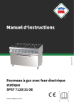 2025-07-25 Manuel d‘instructions Fourneau à gaz avec four électrique statique SPST 7120/31 GE www.rmgastro.com FOURNEAU À GAZ AVEC FOUR ÉLECTRIQUE STATIQUE · SPST 7120/31 GE · 00014805 OBSAH 1. DÉCLARATION DE CONFORMITÉ 3 2. DONNÉES TECHNIQUES 3 3. TABLEAU DES GAZ AUXQUELS LE PRODUIT EST DESTINÉ 3 4. EMPLACEMENT DE L'ÉLECTRICITÉ 5 5. EMPLACEMENT GAZ 5 6. MESURES DE SÉCURITÉ DU POINT DE VUE DE LA PROTECTION INCENDIE 6 7. INSTALLATION 6 8. CONTRÔLE DES PERFORMANCES THERMIQUES 7 9. RACCORDEMENT DU TUYAU DE RACCORDEMENT AU GAZ 7 10. RACCORDEMENT GAZ LIQUIDE 7 11. RACCORDEMENT D'EAU 7 12. CONNEXION DU CÂBLE ÉLECTRIQUE AU RÉSEAU 7 13. VÉRIFIER LES PARAMÈTRES DE L'APPAREIL POUR LE TYPE DE GAZ 8 14. DONNÉES TECHNIQUES DU BRÛLEUR 8 15. VÉRIFICATION DES RÉGLAGES DE L‘APPAREIL EN FONCTION DU TYPE DE GAZ 9 16. VÉRIFICATION DU RÉGLAGE DU GAZ DE L‘APPAREIL (FOUR) 12 17. MODE D‘EMPLOI 13 18. CONTRÔLE DU FOUR 14 19. NETTOYAGE ET ENTRETIEN 15 2025-07-25 2 www.rmgastro.com FOURNEAU À GAZ AVEC FOUR ÉLECTRIQUE STATIQUE · SPST 7120/31 GE · 00014805 1. DÉCLARATION DE CONFORMITÉ Décret du Ministère de santé. 38/21 Sb. Règlement 197/26/CE - Règlement REACH, 1935/24/CE - Règlement relatif au contact alimentaire. Les produits répondent aux exigences du §26 de la loi n° 258/2 telle qu’en vigeur. Les produits répondent aux exigences de la directive RoHS 215/863/UE, 1/211, 517/214, 215/194, 215/195. Attention, le fabricant décline toute responsabilité en cas de dommages directs ou indirects résultant d’une mauvaise installation, d’interventions ou de modifications inappropriées, d’un entretien insuffisant, d’une utilisation incorrecte, ou encore d’autres causes mentionnées dans les conditions générales de vente. Cet appareil est exclusivement destiné à un usage professionnel et doit être manipulé par des personnes qualifiées. Les parties qui ont été réglées et sécurisées par le fabricant ou un technicien agréé ne doivent pas être modifiées par l’utilisateur. 2. DONNÉES TECHNIQUES L’étiquette de données techniques est située sur le panneau latéral ou arrière de l’appareil. Avant l’installation, étudiez le schéma de câblage et toutes les informations suivantes dans les instructions ci-jointes. Largeur nette [mm] Profondeur nette [mm] Hauteur nette [mm] Poids net [kg] Puissance électrique [kW] 1200 900 900 150.00 8.700 Alimentation Puissance gaz [kW] Type de four Puissance du four électrique [kW] Taille du four 400 V / 3N - 50 Hz 42.000 Électrique, statique 8.70 GN 3x 1/1 La puissance thermique nominale maximale et réduite, exprimée en kW, est basée sur la valeur Hi du gaz utilisé. Si le produit est connecté au GPL, la bouteille de gaz doit se trouver dans des pièces suffisamment ventilées. 3. TABLEAU DES GAZ AUXQUELS LE PRODUIT EST DESTINÉ Version Catégorie de produits Pressions de raccordement (mbar) Gaz utilisé Pays de destination A1 I2E 20 G20 DE, NL, PL, RO A1 I2ELL 20, 20 G20,G25 DE A1 I2E+ 20/25 G20/G25 BE, FR 2025-07-25 3 www.rmgastro.com FOURNEAU À GAZ AVEC FOUR ÉLECTRIQUE STATIQUE · SPST 7120/31 GE · 00014805 A1 I2H 20 G20 AT, BG, CH, CZ, DK, HR, EE, ES, FI, GB, GR, IE, IT, LT, LV, NO, PT, RO, SE, SI, SK, TR, LU, CY , FR A1 I3B/P 30 G30 BG, CY, CZ, DK, GB, HR, EE, FI, FR, GR, HU, IT, LT, LV, MT, NL, NO, RO, SE, SI, SK, TR A1 I3B/P 50 G30 AT, DE, CZ, CH, FR, SK A1 I3P 37 G31 BE, CH, CZ, ES, GB, GR, IE, RO, SI, SK, FR, NL, PT, HR, IT, LT, PL, TR A1 I3+ 28-30/37 G30/G31 BE, CH, CY, CZ, EE, ES, FR, GB, GR, IE, IT, LT, PT, SI, SK, TR A1 II2E3B/P 20, 50 G20, G30 DE, PL, RO A1 II2ELL3B/P 20, 20, 50 G20, G25, G30 DE A1 II2E+3+ 20/25, 28-30/37 G20/G25, G30/G31 BE, FR A1 II2H3B/P 20, 30 G20, G30 2025-07-25 4 www.rmgastro.com FOURNEAU À GAZ AVEC FOUR ÉLECTRIQUE STATIQUE · SPST 7120/31 GE · 00014805 BG, CZ, GB, DK, HR, EE, FI, GR, IT, LT, LV, NO, RO, SE, SI, SK, TR, CY, FR A1 II2H3B/P 20, 50 G20, G30 AT, CH, CZ, FR, SK A1 II2H3P 20, 37 G20, G31 CH, CZ, ES, GB, GR, IE, RO, SI, SK A1 II2H3+ 20, 28-30/37 G20, G30/G31 CH, CY, CZ, EE, ES, GB, GR, IE, IT, LT, PT, SK, SI, TR 4. EMPLACEMENT DE L'ÉLECTRICITÉ Pour le bon fonctionnement et le placement de l'appareil, il est nécessaire de respecter toutes les normes prescrites suivantes pour le marché concerné. Déballez l'appareil et vérifiez qu'il n'a pas été endommagé pendant le transport. Placez l'appareil sur une surface horizontale (dénivelé maximum jusqu'à 2°). Les petites irrégularités peuvent être nivelées avec des pieds réglables. Si l'appareil est placé de manière à être en contact avec les parois des meubles, ceux-ci doivent résister à une température allant jusqu'à 60°C. L'installation, le réglage, la mise en service doivent être effectués par une personne qualifiée et autorisée à effectuer de telles opérations, selon les normes en vigueur. L’appareil peut être installé individuellement ou en série avec d’autres appareils de notre fabrication. Une distance minimale de 10 cm doit être respectée par rapport aux matériaux inflammables. Dans ce cas, des aménagements appropriés doivent être prévus pour garantir une isolation thermique adéquate des parties inflammables. L'appareil doit être installé uniquement sur une surface ininflammable ou contre un mur ininflammable. Les composants de l’appareil sécurisés par le fabricant ou son représentant ne doivent pas être modifiés par le personnel effectuant l’installation de l’appareil. 5. EMPLACEMENT GAZ Pour un fonctionnement et un emplacement corrects de l'appareil, il est nécessaire de respecter toutes les directives et normes du pays en question. Déballez l'appareil et vérifiez qu'il n'a pas été endommagé pendant le transport. Placez l'appareil sur une surface horizontale (dénivelé maximum jusqu'à 2°). Les petites irrégularités peuvent être nivelées avec des pieds réglables. Si l'appareil est placé de manière à être en contact