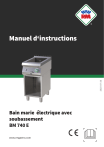2025-07-26 Manuel d‘instructions Bain marie électrique avec soubassement BM 740 E www.rmgastro.com BAIN MARIE ÉLECTRIQUE AVEC SOUBASSEMENT · BM 740 E · 00008925 OBSAH 1. DÉCLARATION DE CONFORMITÉ 3 2. DONNÉES TECHNIQUES 3 3. TABLEAU DES GAZ AUXQUELS LE PRODUIT EST DESTINÉ 3 4. EMPLACEMENT DE L'ÉLECTRICITÉ 5 5. EMPLACEMENT GAZ 5 6. MESURES DE SÉCURITÉ DU POINT DE VUE DE LA PROTECTION INCENDIE 5 7. INSTALLATION 6 8. CONTRÔLE DES PERFORMANCES THERMIQUES 6 9. RACCORDEMENT DU TUYAU DE RACCORDEMENT AU GAZ 7 10. RACCORDEMENT GAZ LIQUIDE 7 11. RACCORDEMENT D'EAU 7 12. CONNEXION DU CÂBLE ÉLECTRIQUE AU RÉSEAU 7 13. VÉRIFIER LES PARAMÈTRES DE L'APPAREIL POUR LE TYPE DE GAZ 8 14. MODE D‘EMPLOI 8 15. NETTOYAGE ET ENTRETIEN 9 2025-07-26 2 www.rmgastro.com BAIN MARIE ÉLECTRIQUE AVEC SOUBASSEMENT · BM 740 E · 00008925 1. DÉCLARATION DE CONFORMITÉ Décret du Ministère de santé. 38/21 Sb. Règlement 197/26/CE - Règlement REACH, 1935/24/CE - Règlement relatif au contact alimentaire. Les produits répondent aux exigences du §26 de la loi n° 258/2 telle qu’en vigeur. Les produits répondent aux exigences de la directive RoHS 215/863/UE, 1/211, 517/214, 215/194, 215/195. Attention, le fabricant décline toute responsabilité en cas de dommages directs ou indirects résultant d’une mauvaise installation, d’interventions ou de modifications inappropriées, d’un entretien insuffisant, d’une utilisation incorrecte, ou encore d’autres causes mentionnées dans les conditions générales de vente. Cet appareil est exclusivement destiné à un usage professionnel et doit être manipulé par des personnes qualifiées. Les parties qui ont été réglées et sécurisées par le fabricant ou un technicien agréé ne doivent pas être modifiées par l’utilisateur. 2. DONNÉES TECHNIQUES L’étiquette de données techniques est située sur le panneau latéral ou arrière de l’appareil. Avant l’installation, étudiez le schéma de câblage et toutes les informations suivantes dans les instructions ci-jointes. Largeur nette [mm] Profondeur nette [mm] Hauteur nette [mm] Poids net [kg] Puissance électrique [kW] Alimentation 400 900 900 1.600 230 V / 1N - 50 Hz 28.60 La puissance thermique nominale maximale et réduite, exprimée en kW, est basée sur la valeur Hi du gaz utilisé. Si le produit est connecté au GPL, la bouteille de gaz doit se trouver dans des pièces suffisamment ventilées. 3. TABLEAU DES GAZ AUXQUELS LE PRODUIT EST DESTINÉ Version Catégorie de produits Pressions de raccordement (mbar) Gaz utilisé Pays de destination A1 I2E 20 G20 DE, NL, PL, RO A1 I2ELL 20, 20 G20,G25 DE A1 I2E+ 20/25 G20/G25 BE, FR A1 I2H 20 2025-07-26 3 www.rmgastro.com BAIN MARIE ÉLECTRIQUE AVEC SOUBASSEMENT · BM 740 E · 00008925 G20 AT, BG, CH, CZ, DK, HR, EE, ES, FI, GB, GR, IE, IT, LT, LV, NO, PT, RO, SE, SI, SK, TR, LU, CY , FR A1 I3B/P 30 G30 BG, CY, CZ, DK, GB, HR, EE, FI, FR, GR, HU, IT, LT, LV, MT, NL, NO, RO, SE, SI, SK, TR A1 I3B/P 50 G30 AT, DE, CZ, CH, FR, SK A1 I3P 37 G31 BE, CH, CZ, ES, GB, GR, IE, RO, SI, SK, FR, NL, PT, HR, IT, LT, PL, TR A1 I3+ 28-30/37 G30/G31 BE, CH, CY, CZ, EE, ES, FR, GB, GR, IE, IT, LT, PT, SI, SK, TR A1 II2E3B/P 20, 50 G20, G30 DE, PL, RO A1 II2ELL3B/P 20, 20, 50 G20, G25, G30 DE A1 II2E+3+ 20/25, 28-30/37 G20/G25, G30/G31 BE, FR A1 II2H3B/P 20, 30 G20, G30 BG, CZ, GB, DK, HR, EE, FI, GR, IT, LT, LV, NO, RO, SE, SI, SK, TR, CY, FR A1 II2H3B/P 2025-07-26 4 www.rmgastro.com BAIN MARIE ÉLECTRIQUE AVEC SOUBASSEMENT · BM 740 E · 00008925 20, 50 G20, G30 AT, CH, CZ, FR, SK A1 II2H3P 20, 37 G20, G31 CH, CZ, ES, GB, GR, IE, RO, SI, SK A1 II2H3+ 20, 28-30/37 G20, G30/G31 CH, CY, CZ, EE, ES, GB, GR, IE, IT, LT, PT, SK, SI, TR 4. EMPLACEMENT DE L'ÉLECTRICITÉ Pour le bon fonctionnement et le placement de l'appareil, il est nécessaire de respecter toutes les normes prescrites suivantes pour le marché concerné. Déballez l'appareil et vérifiez qu'il n'a pas été endommagé pendant le transport. Placez l'appareil sur une surface horizontale (dénivelé maximum jusqu'à 2°). Les petites irrégularités peuvent être nivelées avec des pieds réglables. Si l'appareil est placé de manière à être en contact avec les parois des meubles, ceux-ci doivent résister à une température allant jusqu'à 60°C. L'installation, le réglage, la mise en service doivent être effectués par une personne qualifiée et autorisée à effectuer de telles opérations, selon les normes en vigueur. L’appareil peut être installé individuellement ou en série avec d’autres appareils de notre fabrication. Une distance minimale de 10 cm doit être respectée par rapport aux matériaux inflammables. Dans ce cas, des aménagements appropriés doivent être prévus pour garantir une isolation thermique adéquate des parties inflammables. L'appareil doit être installé uniquement sur une surface ininflammable ou contre un mur ininflammable. Les composants de l’appareil sécurisés par le fabricant ou son représentant ne doivent pas être modifiés par le personnel effectuant l’installation de l’appareil. 5. EMPLACEMENT GAZ Pour un fonctionnement et un emplacement corrects de l'appareil, il est nécessaire de respecter toutes les directives et normes du pays en question. Déballez l'appareil et vérifiez qu'il n'a pas été endommagé pendant le transport. Placez l'appareil sur une surface horizontale (dénivelé maximum jusqu'à 2°). Les petites irrégularités peuvent être nivelées avec des pieds réglables. Si l'appareil est placé de manière à être en contact avec les parois des meubles, ceux-ci doivent résister à une température allant jusqu'à 60°C. L'installation, le réglage, la mise en service doivent être effectués par une personne qualifiée et autorisée à effectuer de telles opérations, selon les normes en vigueur. L'appareil peut être installé séparément ou en série avec des appareils de notre production. Une distance minimale