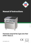 2025-07-25 Manuel d‘instructions Fourneau coup de feu à gaz avec four STPST 780/21 G www.rmgastro.com FOURNEAU COUP DE FEU À GAZ AVEC FOUR · STPST 780/21 G · 00020645 OBSAH 1. DÉCLARATION DE CONFORMITÉ 3 2. DONNÉES TECHNIQUES 3 3. TABLEAU DES GAZ AUXQUELS LE PRODUIT EST DESTINÉ 3 4. EMPLACEMENT DE L'ÉLECTRICITÉ 5 5. EMPLACEMENT GAZ 5 6. MESURES DE SÉCURITÉ DU POINT DE VUE DE LA PROTECTION INCENDIE 6 7. INSTALLATION 6 8. CONTRÔLE DES PERFORMANCES THERMIQUES 7 9. RACCORDEMENT DU TUYAU DE RACCORDEMENT AU GAZ 7 10. RACCORDEMENT GAZ LIQUIDE 7 11. RACCORDEMENT D'EAU 7 12. CONNEXION DU CÂBLE ÉLECTRIQUE AU RÉSEAU 7 13. VÉRIFIER LES PARAMÈTRES DE L'APPAREIL POUR LE TYPE DE GAZ 8 14. VÉRIFICATION DU RÉGLAGE DE L‘APPAREIL POUR LE TYPE DE BRÛLEURS À GAZ 11 15. CONTRÔLE DU RÉGLAGE DE L‘APPAREIL POUR LE TYPE DE GAZ UTILISÉ PLAQUE COUP DE FEU 12 16. VÉRIFICATION DU RÉGLAGE DU GAZ DE L‘APPAREIL (FOUR) 13 17. MODE D‘EMPLOI 14 18. MODE D‘EMPLOI DES PLAQUES COUP DE FEU 15 19. CONTRÔLE DU FOUR 17 20. NETTOYAGE ET ENTRETIEN 18 2025-07-25 2 www.rmgastro.com FOURNEAU COUP DE FEU À GAZ AVEC FOUR · STPST 780/21 G · 00020645 1. DÉCLARATION DE CONFORMITÉ Décret du Ministère de santé. 38/21 Sb. Règlement 197/26/CE - Règlement REACH, 1935/24/CE - Règlement relatif au contact alimentaire. Les produits répondent aux exigences du §26 de la loi n° 258/2 telle qu’en vigeur. Les produits répondent aux exigences de la directive RoHS 215/863/UE, 1/211, 517/214, 215/194, 215/195. Attention, le fabricant décline toute responsabilité en cas de dommages directs ou indirects résultant d’une mauvaise installation, d’interventions ou de modifications inappropriées, d’un entretien insuffisant, d’une utilisation incorrecte, ou encore d’autres causes mentionnées dans les conditions générales de vente. Cet appareil est exclusivement destiné à un usage professionnel et doit être manipulé par des personnes qualifiées. Les parties qui ont été réglées et sécurisées par le fabricant ou un technicien agréé ne doivent pas être modifiées par l’utilisateur. 2. DONNÉES TECHNIQUES L’étiquette de données techniques est située sur le panneau latéral ou arrière de l’appareil. Avant l’installation, étudiez le schéma de câblage et toutes les informations suivantes dans les instructions ci-jointes. Largeur nette [mm] Profondeur nette [mm] Hauteur nette [mm] Poids net [kg] 800 900 900 130.40 Puissance gaz [kW] Type de four Puissance du four à gaz [kW] Taille du four 25.100 À gaz, statique 6.00 GN 2/1 La puissance thermique nominale maximale et réduite, exprimée en kW, est basée sur la valeur Hi du gaz utilisé. Si le produit est connecté au GPL, la bouteille de gaz doit se trouver dans des pièces suffisamment ventilées. 3. TABLEAU DES GAZ AUXQUELS LE PRODUIT EST DESTINÉ Version Catégorie de produits Pressions de raccordement (mbar) Gaz utilisé Pays de destination A1 I2E 20 G20 DE, NL, PL, RO A1 I2ELL 20, 20 G20,G25 DE A1 I2E+ 20/25 G20/G25 BE, FR A1 2025-07-25 3 www.rmgastro.com FOURNEAU COUP DE FEU À GAZ AVEC FOUR · STPST 780/21 G · 00020645 I2H 20 G20 AT, BG, CH, CZ, DK, HR, EE, ES, FI, GB, GR, IE, IT, LT, LV, NO, PT, RO, SE, SI, SK, TR, LU, CY , FR A1 I3B/P 30 G30 BG, CY, CZ, DK, GB, HR, EE, FI, FR, GR, HU, IT, LT, LV, MT, NL, NO, RO, SE, SI, SK, TR A1 I3B/P 50 G30 AT, DE, CZ, CH, FR, SK A1 I3P 37 G31 BE, CH, CZ, ES, GB, GR, IE, RO, SI, SK, FR, NL, PT, HR, IT, LT, PL, TR A1 I3+ 28-30/37 G30/G31 BE, CH, CY, CZ, EE, ES, FR, GB, GR, IE, IT, LT, PT, SI, SK, TR A1 II2E3B/P 20, 50 G20, G30 DE, PL, RO A1 II2ELL3B/P 20, 20, 50 G20, G25, G30 DE A1 II2E+3+ 20/25, 28-30/37 G20/G25, G30/G31 BE, FR A1 II2H3B/P 20, 30 G20, G30 BG, CZ, GB, DK, HR, EE, FI, GR, IT, LT, LV, NO, RO, SE, SI, SK, TR, CY, FR 2025-07-25 4 www.rmgastro.com FOURNEAU COUP DE FEU À GAZ AVEC FOUR · STPST 780/21 G · 00020645 A1 II2H3B/P 20, 50 G20, G30 AT, CH, CZ, FR, SK A1 II2H3P 20, 37 G20, G31 CH, CZ, ES, GB, GR, IE, RO, SI, SK A1 II2H3+ 20, 28-30/37 G20, G30/G31 CH, CY, CZ, EE, ES, GB, GR, IE, IT, LT, PT, SK, SI, TR 4. EMPLACEMENT DE L'ÉLECTRICITÉ Pour le bon fonctionnement et le placement de l'appareil, il est nécessaire de respecter toutes les normes prescrites suivantes pour le marché concerné. Déballez l'appareil et vérifiez qu'il n'a pas été endommagé pendant le transport. Placez l'appareil sur une surface horizontale (dénivelé maximum jusqu'à 2°). Les petites irrégularités peuvent être nivelées avec des pieds réglables. Si l'appareil est placé de manière à être en contact avec les parois des meubles, ceux-ci doivent résister à une température allant jusqu'à 60°C. L'installation, le réglage, la mise en service doivent être effectués par une personne qualifiée et autorisée à effectuer de telles opérations, selon les normes en vigueur. L’appareil peut être installé individuellement ou en série avec d’autres appareils de notre fabrication. Une distance minimale de 10 cm doit être respectée par rapport aux matériaux inflammables. Dans ce cas, des aménagements appropriés doivent être prévus pour garantir une isolation thermique adéquate des parties inflammables. L'appareil doit être installé uniquement sur une surface ininflammable ou contre un mur ininflammable. Les composants de l’appareil sécurisés par le fabricant ou son représentant ne doivent pas être modifiés par le personnel effectuant l’installation de l’appareil. 5. EMPLACEMENT GAZ Pour un fonctionnement et un emplacement corrects de l'appareil, il est nécessaire de respecter toutes les directives et normes du pays en question. Déballez l'appareil et vérifiez qu'il n'a pas été endommagé pendant le transport. Placez l'appareil sur une surface horizontale (dénivelé maximum jusqu'à 2°). Les petites irrégularités peuvent être nivelées avec des pieds réglables. Si l'appareil est placé de manière à être en contact avec les parois des m