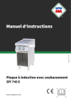2025-07-25 Manuel d‘instructions Plaque à induction avec soubassement SPI 740 E www.rmgastro.com PLAQUE À INDUCTION AVEC SOUBASSEMENT · SPI 740 E · 00014511 OBSAH 1. DÉCLARATION DE CONFORMITÉ 3 2. DONNÉES TECHNIQUES 3 3. TABLE OF GASES FOR WHICH THE PRODUCT IS INTENDED 3 4. EMPLACEMENT DE L'ÉLECTRICITÉ 4 5. LOCATION GAS 4 6. MESURES DE SÉCURITÉ DU POINT DE VUE DE LA PROTECTION INCENDIE 4 7. INSTALLATION 5 8. THERMAL OUTPUT CHECK 5 9. CONNECTING GAS CONNECTION HOSE 5 10. LIQUID GAS CONNECTION 6 11. WATER CONNECTION 6 12. CONNEXION DU CÂBLE ÉLECTRIQUE AU RÉSEAU 6 13. CHECK DEVICE SETTINGS FOR GAS TYPE 7 14. CONSIGNES DE SÉCURITÉ 7 15. CONSIGNES DE SÉCURITÉ 9 16. RECONNAISSANCE DES USTENSILES 11 17. CONDITION D‘INSTALLATION 11 18. MISE EN SERVICE DE L‘APPAREIL 13 19. TEST DE FONCTIONNEMENT 13 20. SERVICE 14 21. MODE D‘EMPLOI 16 22. NETTOYAGE ET ENTRETIEN 16 2025-07-25 2 www.rmgastro.com PLAQUE À INDUCTION AVEC SOUBASSEMENT · SPI 740 E · 00014511 1. DÉCLARATION DE CONFORMITÉ Décret du Ministère de santé. 38/21 Sb. Règlement 197/26/CE - Règlement REACH, 1935/24/CE - Règlement relatif au contact alimentaire. Les produits répondent aux exigences du §26 de la loi n° 258/2 telle qu’en vigeur. Les produits répondent aux exigences de la directive RoHS 215/863/UE, 1/211, 517/214, 215/194, 215/195. Attention, le fabricant décline toute responsabilité en cas de dommages directs ou indirects résultant d’une mauvaise installation, d’interventions ou de modifications inappropriées, d’un entretien insuffisant, d’une utilisation incorrecte, ou encore d’autres causes mentionnées dans les conditions générales de vente. Cet appareil est exclusivement destiné à un usage professionnel et doit être manipulé par des personnes qualifiées. Les parties qui ont été réglées et sécurisées par le fabricant ou un technicien agréé ne doivent pas être modifiées par l’utilisateur. 2. DONNÉES TECHNIQUES L’étiquette de données techniques est située sur le panneau latéral ou arrière de l’appareil. Avant l’installation, étudiez le schéma de câblage et toutes les informations suivantes dans les instructions ci-jointes. Largeur nette [mm] Profondeur nette [mm] Hauteur nette [mm] Poids net [kg] Puissance électrique [kW] Alimentation 400 900 900 7.000 400 V / 3N - 50 Hz 49.00 The maximum and reduced nominal heat input in kW is related to the Hi of the gas used. If the product is connected to LPG, the gas cylinder must be in sufficiently ventilated rooms. 3. TABLE OF GASES FOR WHICH THE PRODUCT IS INTENDED Execution Product Category Connection overpressu- Used gas res (mbar) Country of destination A1 I2E 20 G20 DE, NL, PL, RO A1 I2ELL 20, 20 G20,G25 DE A1 I2E+ 20/25 G20/G25 BE, FR A1 I2H 20 G20 AT, BG, CH, CZ, DK, HR, EE, ES, FI, GB, GR, IE, IT, LT, LV, NO, PT, RO, SE, SI, SK, TR, LU, CY , FR A1 I3B/P 30 G30 BG, CY, CZ, DK, GB, HR, EE, FI, FR, GR, HU, IT, LT, LV, MT, NL, NO, RO, SE, SI, SK, TR A1 I3B/P 50 G30 AT, DE, CZ, CH, FR, SK A1 I3P 37 G31 BE, CH, CZ, ES, GB, GR, IE, RO, SI, SK, FR, NL, PT, HR, IT, LT, PL, TR A1 I3+ 28-30/37 G30/G31 BE, CH, CY, CZ, EE, ES, FR, GB, GR, IE, IT, LT, PT, SI, SK, TR A1 II2E3B/P 20, 50 G20, G30 DE, PL, RO A1 II2ELL3B/P 20, 20, 50 G20, G25, G30 DE A1 II2E+3+ 20/25, 28-30/37 G20/G25, G30/G31 BE, FR A1 II2H3B/P 20, 30 G20, G30 BG, CZ, GB, DK, HR, EE, FI, GR, IT, LT, LV, NO, RO, SE, SI, SK, TR, CY, FR A1 II2H3B/P 20, 50 G20, G30 AT, CH, CZ, FR, SK 2025-07-25 3 www.rmgastro.com PLAQUE À INDUCTION AVEC SOUBASSEMENT · SPI 740 E · 00014511 Execution Product Category Connection overpressu- Used gas res (mbar) Country of destination A1 II2H3P 20, 37 G20, G31 CH, CZ, ES, GB, GR, IE, RO, SI, SK A1 II2H3+ 20, 28-30/37 G20, G30/G31 CH, CY, CZ, EE, ES, GB, GR, IE, IT, LT, PT, SK, SI, TR 4. EMPLACEMENT DE L'ÉLECTRICITÉ Pour le bon fonctionnement et le placement de l'appareil, il est nécessaire de respecter toutes les normes prescrites suivantes pour le marché concerné. Déballez l'appareil et vérifiez qu'il n'a pas été endommagé pendant le transport. Placez l'appareil sur une surface horizontale (dénivelé maximum jusqu'à 2°). Les petites irrégularités peuvent être nivelées avec des pieds réglables. Si l'appareil est placé de manière à être en contact avec les parois des meubles, ceux-ci doivent résister à une température allant jusqu'à 60°C. L'installation, le réglage, la mise en service doivent être effectués par une personne qualifiée et autorisée à effectuer de telles opérations, selon les normes en vigueur. L’appareil peut être installé individuellement ou en série avec d’autres appareils de notre fabrication. Une distance minimale de 10 cm doit être respectée par rapport aux matériaux inflammables. Dans ce cas, des aménagements appropriés doivent être prévus pour garantir une isolation thermique adéquate des parties inflammables. L'appareil doit être installé uniquement sur une surface ininflammable ou contre un mur ininflammable. Les composants de l’appareil sécurisés par le fabricant ou son représentant ne doivent pas être modifiés par le personnel effectuant l’installation de l’appareil. 5. LOCATION GAS For the correct activity and location of the appliance, it is necessary to observe all directives and standards of the country. Expand the device and check that the device has not been damaged during transport. Place the device on the horizontal surface (maximum inequality up to 2 °). Minor inequalities can be balanced with regulated legs. If the device is located in contact with the walls of the furniture, they must withstand temperatures up to 60 ° C. Installation, adjustment, commissioning must be carried out by a qualified person who is authorized for such acts, according to valid standards. The device can be installed separately or in a series with our production devices. It is necessary to follow a minimum distance of 10 cm from flammable materi
