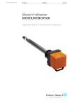 8030513/AE00/V3-0/2016-08 Products Solutions Manuel d’utilisation DUSTHUNTER SP100 Appareil de mesure de concentration en poussières Services DUSTHUNTER SP100 Produit décrit Nom du produit : DUSTHUNTER SP100 Fabricant Endress+Hauser SICK GmbH+Co. KG Bergener Ring 27 01458 Ottendorf-Okrilla Allemagne Informations légales Ce document est protégé par des droits d'auteur.Les droits ainsi obtenus restent acquis à la société Endress+Hauser SICK GmbH+Co. KG.La reproduction complète ou partielle de ce document n'est autorisée que dans les limites des dispositions légales de la loi sur les droits d'auteur. Toute modification, résumé ou traduction de ce document est interdit sans autorisation expresse écrite de la société Endress+Hauser SICK GmbH+Co. KG. Toutes les marques citées dans ce document sont la propriété de leurs propriétaires respectifs. © Endress+Hauser SICK GmbH+Co. KG. Tous droits réservés. Document original Ce document est un document original du fabricant Endress+Hauser SICK GmbH+Co. KG. 2 MANUEL D’UTILISATION 8030513/AE00/V3-0/2016-08 Endress+Hauser CONTENU Contenu Contenu 1 Informations importantes ........................................................................ 7 1.1 1.2 2 1.1.1 Risques dus aux gaz brûlants et/ou agressifs et/ou aux hautes pressions......................................................................................... 7 1.1.2 Risque dû au matériel électrique................................................... 7 1.1.3 Danger dû à un rayonnement laser ............................................... 7 Symboles et conventions dans ce document ................................................ 8 1.2.1 Symboles d'avertissement ............................................................ 8 1.2.2 Degrés d'avertissement/Glossaire de signalisation ..................... 8 1.2.3 Symboles des remarques ............................................................... 8 1.3 Utilisation normale .......................................................................................... 8 1.4 Responsabilité de l'utilisateur ........................................................................ 9 1.4.1 Généralités...................................................................................... 9 1.4.2 Prescriptions de sécurité et mesures de protection ..................... 9 Description du produit.............................................................................11 2.1 2.2 2.3 2.4 Endress+Hauser Risques principaux.......................................................................................... 7 Principe de mesure, grandeurs mesurées ...................................................11 2.1.1 Principe de fonctionnement .........................................................11 2.1.2 Temps d'amortissement ...............................................................12 2.1.3 Contrôle de fonctionnement ........................................................13 Composants de l'appareil .............................................................................15 2.2.1 Emetteur/récepteur......................................................................16 2.2.2 Bride à tube ..................................................................................19 2.2.3 Unité de commande MCU............................................................20 2.2.3.1 Interfaces standard...................................................20 2.2.3.2 Versions .....................................................................21 2.2.3.3 Codage.......................................................................23 2.2.3.4 Modules .....................................................................24 2.2.4 Option soufflerie externe ..............................................................26 2.2.5 Adaptateur pour alimentation en air instrument ........................27 2.2.6 Accessoires d'installation .............................................................27 2.2.7 Clapet anti-retour..........................................................................28 2.2.8 Dispositif de test de linéarité .......................................................28 Configuration de l'appareil............................................................................29 2.3.1 Emetteur/récepteur......................................................................29 2.3.2 Alimentation en tension et en air de ventilation .........................30 SOPAS ET (Programme PC)...........................................................................31 MANUEL D’UTILISATION 8030513/AE00/V3-0/2016-08 3 CONTENU 3 Montage et installation........................................................................... 32 3.1 Planification du projet .................................................................................. 32 3.2 Montage ........................................................................................................ 34 3.3 3.2.1 Monter la bride à tube ................................................................. 34 3.2.2 Montage de l'unité de commande MCU ...................................... 36 3.2.3 Montage de l'option soufflerie externe ....................................... 38 3.2.4 Travaux de montage..................................................................... 39 3.2.5 Montage des capot de protection contre les intempéries ......... 40 Installation électrique................................................................................... 41 3.3.1 Sécurité électrique ....................................................................... 41 3.3.1.1 3.3.2 3.3.3 3.3.4 3.3.5 3.3.6 4 3.3.1.2 Dimension correcte des câbles................................ 41 3.3.1.3 Mise à la terre des appareils ................................... 41 3.3.1.4 Responsabilité de la sécurité du système............... 41 Généralités, conditions ....................................................