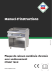 2025-07-25 Manuel d‘instructions Plaque de cuisson combinée chromée avec soubassement FTHRC 780 E www.rmgastro.com PLAQUE DE CUISSON COMBINÉE CHROMÉE AVEC SOUBASSEMENT · FTHRC 780 E · 00008944 OBSAH 1. DÉCLARATION DE CONFORMITÉ 3 2. DONNÉES TECHNIQUES 3 3. TABLEAU DES GAZ AUXQUELS LE PRODUIT EST DESTINÉ 3 4. EMPLACEMENT DE L'ÉLECTRICITÉ 5 5. EMPLACEMENT GAZ 5 6. MESURES DE SÉCURITÉ DU POINT DE VUE DE LA PROTECTION INCENDIE 6 7. INSTALLATION 6 8. CONTRÔLE DES PERFORMANCES THERMIQUES 7 9. RACCORDEMENT DU TUYAU DE RACCORDEMENT AU GAZ 7 10. RACCORDEMENT GAZ LIQUIDE 7 11. RACCORDEMENT D'EAU 7 12. CONNEXION DU CÂBLE ÉLECTRIQUE AU RÉSEAU 7 13. VÉRIFIER LES PARAMÈTRES DE L'APPAREIL POUR LE TYPE DE GAZ 8 14. MODE D‘EMPLOI 8 15. NETTOYAGE ET ENTRETIEN 9 2025-07-25 2 www.rmgastro.com PLAQUE DE CUISSON COMBINÉE CHROMÉE AVEC SOUBASSEMENT · FTHRC 780 E · 00008944 1. DÉCLARATION DE CONFORMITÉ Décret du Ministère de santé. 38/21 Sb. Règlement 197/26/CE - Règlement REACH, 1935/24/CE - Règlement relatif au contact alimentaire. Les produits répondent aux exigences du §26 de la loi n° 258/2 telle qu’en vigeur. Les produits répondent aux exigences de la directive RoHS 215/863/UE, 1/211, 517/214, 215/194, 215/195. Attention, le fabricant décline toute responsabilité en cas de dommages directs ou indirects résultant d’une mauvaise installation, d’interventions ou de modifications inappropriées, d’un entretien insuffisant, d’une utilisation incorrecte, ou encore d’autres causes mentionnées dans les conditions générales de vente. Cet appareil est exclusivement destiné à un usage professionnel et doit être manipulé par des personnes qualifiées. Les parties qui ont été réglées et sécurisées par le fabricant ou un technicien agréé ne doivent pas être modifiées par l’utilisateur. 2. DONNÉES TECHNIQUES L’étiquette de données techniques est située sur le panneau latéral ou arrière de l’appareil. Avant l’installation, étudiez le schéma de câblage et toutes les informations suivantes dans les instructions ci-jointes. Largeur nette [mm] Profondeur nette [mm] Hauteur nette [mm] Poids net [kg] 800 730 900 88.50 Puissance électrique [kW] Alimentation Dimensions de la planche à griller [mm x mm] 9.000 400 V / 3N - 50 Hz 560 x 770 La puissance thermique nominale maximale et réduite, exprimée en kW, est basée sur la valeur Hi du gaz utilisé. Si le produit est connecté au GPL, la bouteille de gaz doit se trouver dans des pièces suffisamment ventilées. 3. TABLEAU DES GAZ AUXQUELS LE PRODUIT EST DESTINÉ Version Catégorie de produits Pressions de raccordement (mbar) Gaz utilisé Pays de destination A1 I2E 20 G20 DE, NL, PL, RO A1 I2ELL 20, 20 G20,G25 DE A1 I2E+ 20/25 G20/G25 BE, FR 2025-07-25 3 www.rmgastro.com PLAQUE DE CUISSON COMBINÉE CHROMÉE AVEC SOUBASSEMENT · FTHRC 780 E · 00008944 A1 I2H 20 G20 AT, BG, CH, CZ, DK, HR, EE, ES, FI, GB, GR, IE, IT, LT, LV, NO, PT, RO, SE, SI, SK, TR, LU, CY , FR A1 I3B/P 30 G30 BG, CY, CZ, DK, GB, HR, EE, FI, FR, GR, HU, IT, LT, LV, MT, NL, NO, RO, SE, SI, SK, TR A1 I3B/P 50 G30 AT, DE, CZ, CH, FR, SK A1 I3P 37 G31 BE, CH, CZ, ES, GB, GR, IE, RO, SI, SK, FR, NL, PT, HR, IT, LT, PL, TR A1 I3+ 28-30/37 G30/G31 BE, CH, CY, CZ, EE, ES, FR, GB, GR, IE, IT, LT, PT, SI, SK, TR A1 II2E3B/P 20, 50 G20, G30 DE, PL, RO A1 II2ELL3B/P 20, 20, 50 G20, G25, G30 DE A1 II2E+3+ 20/25, 28-30/37 G20/G25, G30/G31 BE, FR A1 II2H3B/P 20, 30 G20, G30 2025-07-25 4 www.rmgastro.com PLAQUE DE CUISSON COMBINÉE CHROMÉE AVEC SOUBASSEMENT · FTHRC 780 E · 00008944 BG, CZ, GB, DK, HR, EE, FI, GR, IT, LT, LV, NO, RO, SE, SI, SK, TR, CY, FR A1 II2H3B/P 20, 50 G20, G30 AT, CH, CZ, FR, SK A1 II2H3P 20, 37 G20, G31 CH, CZ, ES, GB, GR, IE, RO, SI, SK A1 II2H3+ 20, 28-30/37 G20, G30/G31 CH, CY, CZ, EE, ES, GB, GR, IE, IT, LT, PT, SK, SI, TR 4. EMPLACEMENT DE L'ÉLECTRICITÉ Pour le bon fonctionnement et le placement de l'appareil, il est nécessaire de respecter toutes les normes prescrites suivantes pour le marché concerné. Déballez l'appareil et vérifiez qu'il n'a pas été endommagé pendant le transport. Placez l'appareil sur une surface horizontale (dénivelé maximum jusqu'à 2°). Les petites irrégularités peuvent être nivelées avec des pieds réglables. Si l'appareil est placé de manière à être en contact avec les parois des meubles, ceux-ci doivent résister à une température allant jusqu'à 60°C. L'installation, le réglage, la mise en service doivent être effectués par une personne qualifiée et autorisée à effectuer de telles opérations, selon les normes en vigueur. L’appareil peut être installé individuellement ou en série avec d’autres appareils de notre fabrication. Une distance minimale de 10 cm doit être respectée par rapport aux matériaux inflammables. Dans ce cas, des aménagements appropriés doivent être prévus pour garantir une isolation thermique adéquate des parties inflammables. L'appareil doit être installé uniquement sur une surface ininflammable ou contre un mur ininflammable. Les composants de l’appareil sécurisés par le fabricant ou son représentant ne doivent pas être modifiés par le personnel effectuant l’installation de l’appareil. 5. EMPLACEMENT GAZ Pour un fonctionnement et un emplacement corrects de l'appareil, il est nécessaire de respecter toutes les directives et normes du pays en question. Déballez l'appareil et vérifiez qu'il n'a pas été endommagé pendant le transport. Placez l'appareil sur une surface horizontale (dénivelé maximum jusqu'à 2°). Les petites irrégularités peuvent être nivelées avec des pieds réglables. Si l'appareil est placé de manière à être en contact avec les parois des meubles, ceux-ci doivent résister à une température allant jusqu'à 60°C. L'installation, le réglage, la mise en service doivent être effectués par une personne qualifiée et autorisée à effectuer de telles opérations, selon l