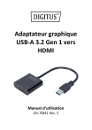 Adaptateur graphique USB-A 3.2 Gen 1 vers HDMI Manuel d'utilisation DA-70841 Rév. 5 Aperçu du contenu 1. Introduction ............................................................................3 2. Spécification ............................................................................3 3. Fonctionnalités ........................................................................4 4. Contenu de l'emballage ..........................................................4 5. Installation ..............................................................................4 6. Schéma de connexion .............................................................5 2 1. Introduction L'adaptateur graphique DIGITUS USB-A 3.2 Gen 1 to HDMI ajoute facilement un écran supplémentaire, un téléviseur ou un projecteur à votre PC ou ordinateur portable. Avec des résolutions allant jusqu'à 1920 x 1080p à 60 Hz, vous pouvez profiter d'un streaming vidéo Full-HD d'une grande netteté. Il supporte le double affichage pour étendre son propre écran afin de permettre différents affichages ou pour refléter l'écran. 2. Spécification Raccords 1x entrée USB-A (3.2 Gen 1) -Connexion hôte 1x HDMI -max. Résolution : 1920 x 1080p Dimensions 4.5 x 4.5 x 1.5 cm Poids 33 g Couleur du produit Noir Couleur du câble Noir Longueur du câble 15 cm Boîtier Plastique Tension de service 5V Consommation électrique 900 mA max. Compatibilité du système d'exploitation Température de fonctionnement À partir de Windows 7, à partir de macOS 10.8 Jeu de puces MS9122 0°C à 40°C 3 3. Fonctionnalités • Connexion USB en amont, prend en charge des vitesses de données de 5 Gbit/s et 480 Mbit/s • sortie vidéo jusqu'à 1920 x 1080p en USB-A 3.2 Gen 1 - compatibilité descendante (sortie vidéo 800 x 600p en application USB 2.0) • Supporte l'USB plug-and-play • Jusqu'à 2 adaptateurs graphiques utilisables simultanément • L'adaptateur graphique est entièrement compatible avec la dernière version des systèmes d'exploitation suivants • Pilote intégré - Installation facile 4. Contenu de l'emballage • 1x adaptateur graphique USB-A 3.2 Gen 1 vers HDMI • 1x QIG 5. Installation 1. Connecter le DA-70841 au port USB d'un ordinateur 2. Un nouveau pilote de flash USB est détecté 3. Ouvrez ensuite le dossier des périphériques USB, installez le pilote et redémarrez l'ordinateur. 4. Connectez le port HDMI au moniteur 4 6. Schéma de connexion Par la présente, Assmann Electronic GmbH déclare que la déclaration de conformité imprimée est jointe au produit. Si la déclaration de conformité devait manquer, elle peut être demandée par courrier à l'adresse du fabricant mentionnée ci-dessous. [email protected] Assmann Electronic GmbH Auf dem Schüffel 3 58513 Lüdenscheid Allemagne 5 ">