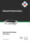 2025-07-25 Manuel d‘instructions Fourneau électrique SPL 7012 E www.rmgastro.com FOURNEAU ÉLECTRIQUE · SPL 7012 E · 00014776 OBSAH 1. DÉCLARATION DE CONFORMITÉ 3 2. DONNÉES TECHNIQUES 3 3. TABLEAU DES GAZ AUXQUELS LE PRODUIT EST DESTINÉ 3 4. EMPLACEMENT DE L'ÉLECTRICITÉ 5 5. EMPLACEMENT GAZ 5 6. MESURES DE SÉCURITÉ DU POINT DE VUE DE LA PROTECTION INCENDIE 5 7. INSTALLATION 6 8. CONTRÔLE DES PERFORMANCES THERMIQUES 6 9. RACCORDEMENT DU TUYAU DE RACCORDEMENT AU GAZ 7 10. RACCORDEMENT GAZ LIQUIDE 7 11. RACCORDEMENT D'EAU 7 12. CONNEXION DU CÂBLE ÉLECTRIQUE AU RÉSEAU 7 13. VÉRIFIER LES PARAMÈTRES DE L'APPAREIL POUR LE TYPE DE GAZ 8 14. MODE D‘EMPLOI 8 15. NETTOYAGE ET ENTRETIEN 9 2025-07-25 2 www.rmgastro.com FOURNEAU ÉLECTRIQUE · SPL 7012 E · 00014776 1. DÉCLARATION DE CONFORMITÉ Décret du Ministère de santé. 38/21 Sb. Règlement 197/26/CE - Règlement REACH, 1935/24/CE - Règlement relatif au contact alimentaire. Les produits répondent aux exigences du §26 de la loi n° 258/2 telle qu’en vigeur. Les produits répondent aux exigences de la directive RoHS 215/863/UE, 1/211, 517/214, 215/194, 215/195. Attention, le fabricant décline toute responsabilité en cas de dommages directs ou indirects résultant d’une mauvaise installation, d’interventions ou de modifications inappropriées, d’un entretien insuffisant, d’une utilisation incorrecte, ou encore d’autres causes mentionnées dans les conditions générales de vente. Cet appareil est exclusivement destiné à un usage professionnel et doit être manipulé par des personnes qualifiées. Les parties qui ont été réglées et sécurisées par le fabricant ou un technicien agréé ne doivent pas être modifiées par l’utilisateur. 2. DONNÉES TECHNIQUES L’étiquette de données techniques est située sur le panneau latéral ou arrière de l’appareil. Avant l’installation, étudiez le schéma de câblage et toutes les informations suivantes dans les instructions ci-jointes. Largeur nette [mm] Profondeur nette [mm] Hauteur nette [mm] Poids net [kg] Puissance électrique [kW] Alimentation 1200 300 300 15.000 400 V / 3N - 50 Hz 114.00 La puissance thermique nominale maximale et réduite, exprimée en kW, est basée sur la valeur Hi du gaz utilisé. Si le produit est connecté au GPL, la bouteille de gaz doit se trouver dans des pièces suffisamment ventilées. 3. TABLEAU DES GAZ AUXQUELS LE PRODUIT EST DESTINÉ Version Catégorie de produits Pressions de raccordement (mbar) Gaz utilisé Pays de destination A1 I2E 20 G20 DE, NL, PL, RO A1 I2ELL 20, 20 G20,G25 DE A1 I2E+ 20/25 G20/G25 BE, FR A1 I2H 20 2025-07-25 3 www.rmgastro.com FOURNEAU ÉLECTRIQUE · SPL 7012 E · 00014776 G20 AT, BG, CH, CZ, DK, HR, EE, ES, FI, GB, GR, IE, IT, LT, LV, NO, PT, RO, SE, SI, SK, TR, LU, CY , FR A1 I3B/P 30 G30 BG, CY, CZ, DK, GB, HR, EE, FI, FR, GR, HU, IT, LT, LV, MT, NL, NO, RO, SE, SI, SK, TR A1 I3B/P 50 G30 AT, DE, CZ, CH, FR, SK A1 I3P 37 G31 BE, CH, CZ, ES, GB, GR, IE, RO, SI, SK, FR, NL, PT, HR, IT, LT, PL, TR A1 I3+ 28-30/37 G30/G31 BE, CH, CY, CZ, EE, ES, FR, GB, GR, IE, IT, LT, PT, SI, SK, TR A1 II2E3B/P 20, 50 G20, G30 DE, PL, RO A1 II2ELL3B/P 20, 20, 50 G20, G25, G30 DE A1 II2E+3+ 20/25, 28-30/37 G20/G25, G30/G31 BE, FR A1 II2H3B/P 20, 30 G20, G30 BG, CZ, GB, DK, HR, EE, FI, GR, IT, LT, LV, NO, RO, SE, SI, SK, TR, CY, FR A1 II2H3B/P 2025-07-25 4 www.rmgastro.com FOURNEAU ÉLECTRIQUE · SPL 7012 E · 00014776 20, 50 G20, G30 AT, CH, CZ, FR, SK A1 II2H3P 20, 37 G20, G31 CH, CZ, ES, GB, GR, IE, RO, SI, SK A1 II2H3+ 20, 28-30/37 G20, G30/G31 CH, CY, CZ, EE, ES, GB, GR, IE, IT, LT, PT, SK, SI, TR 4. EMPLACEMENT DE L'ÉLECTRICITÉ Pour le bon fonctionnement et le placement de l'appareil, il est nécessaire de respecter toutes les normes prescrites suivantes pour le marché concerné. Déballez l'appareil et vérifiez qu'il n'a pas été endommagé pendant le transport. Placez l'appareil sur une surface horizontale (dénivelé maximum jusqu'à 2°). Les petites irrégularités peuvent être nivelées avec des pieds réglables. Si l'appareil est placé de manière à être en contact avec les parois des meubles, ceux-ci doivent résister à une température allant jusqu'à 60°C. L'installation, le réglage, la mise en service doivent être effectués par une personne qualifiée et autorisée à effectuer de telles opérations, selon les normes en vigueur. L’appareil peut être installé individuellement ou en série avec d’autres appareils de notre fabrication. Une distance minimale de 10 cm doit être respectée par rapport aux matériaux inflammables. Dans ce cas, des aménagements appropriés doivent être prévus pour garantir une isolation thermique adéquate des parties inflammables. L'appareil doit être installé uniquement sur une surface ininflammable ou contre un mur ininflammable. Les composants de l’appareil sécurisés par le fabricant ou son représentant ne doivent pas être modifiés par le personnel effectuant l’installation de l’appareil. 5. EMPLACEMENT GAZ Pour un fonctionnement et un emplacement corrects de l'appareil, il est nécessaire de respecter toutes les directives et normes du pays en question. Déballez l'appareil et vérifiez qu'il n'a pas été endommagé pendant le transport. Placez l'appareil sur une surface horizontale (dénivelé maximum jusqu'à 2°). Les petites irrégularités peuvent être nivelées avec des pieds réglables. Si l'appareil est placé de manière à être en contact avec les parois des meubles, ceux-ci doivent résister à une température allant jusqu'à 60°C. L'installation, le réglage, la mise en service doivent être effectués par une personne qualifiée et autorisée à effectuer de telles opérations, selon les normes en vigueur. L'appareil peut être installé séparément ou en série avec des appareils de notre production. Une distance minimale de 10 cm doit être respectée par rapport aux matériaux inflammables. Dans ce cas, d