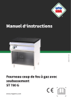 2025-07-25 Manuel d‘instructions Fourneau coup de feu à gaz avec soubassement ST 780 G www.rmgastro.com FOURNEAU COUP DE FEU À GAZ AVEC SOUBASSEMENT · ST 780 G · 00019431 OBSAH 1. DÉCLARATION DE CONFORMITÉ 3 2. DONNÉES TECHNIQUES 3 3. TABLEAU DES GAZ AUXQUELS LE PRODUIT EST DESTINÉ 3 4. EMPLACEMENT DE L'ÉLECTRICITÉ 5 5. EMPLACEMENT GAZ 5 6. MESURES DE SÉCURITÉ DU POINT DE VUE DE LA PROTECTION INCENDIE 5 7. INSTALLATION 6 8. CONTRÔLE DES PERFORMANCES THERMIQUES 6 9. RACCORDEMENT DU TUYAU DE RACCORDEMENT AU GAZ 7 10. RACCORDEMENT GAZ LIQUIDE 7 11. RACCORDEMENT D'EAU 7 12. CONNEXION DU CÂBLE ÉLECTRIQUE AU RÉSEAU 7 13. VÉRIFIER LES PARAMÈTRES DE L'APPAREIL POUR LE TYPE DE GAZ 8 14. DONNÉES TECHNIQUES DES BRÛLEURS 8 15. VÉRIFICATION DU RÉGLAGE DE L‘APPAREIL POUR LE TYPE DE BRÛLEURS À GAZ 11 16. CONTRÔLE DU RÉGLAGE DE L‘APPAREIL POUR LE TYPE DE GAZ UTILISÉ PLAQUE COUP DE FEU 12 17. MODE D‘EMPLOI 13 18. MODE D‘EMPLOI DES PLAQUES COUP DE FEU 13 19. NETTOYAGE ET ENTRETIEN 14 2025-07-25 2 www.rmgastro.com FOURNEAU COUP DE FEU À GAZ AVEC SOUBASSEMENT · ST 780 G · 00019431 1. DÉCLARATION DE CONFORMITÉ Décret du Ministère de santé. 38/21 Sb. Règlement 197/26/CE - Règlement REACH, 1935/24/CE - Règlement relatif au contact alimentaire. Les produits répondent aux exigences du §26 de la loi n° 258/2 telle qu’en vigeur. Les produits répondent aux exigences de la directive RoHS 215/863/UE, 1/211, 517/214, 215/194, 215/195. Attention, le fabricant décline toute responsabilité en cas de dommages directs ou indirects résultant d’une mauvaise installation, d’interventions ou de modifications inappropriées, d’un entretien insuffisant, d’une utilisation incorrecte, ou encore d’autres causes mentionnées dans les conditions générales de vente. Cet appareil est exclusivement destiné à un usage professionnel et doit être manipulé par des personnes qualifiées. Les parties qui ont été réglées et sécurisées par le fabricant ou un technicien agréé ne doivent pas être modifiées par l’utilisateur. 2. DONNÉES TECHNIQUES L’étiquette de données techniques est située sur le panneau latéral ou arrière de l’appareil. Avant l’installation, étudiez le schéma de câblage et toutes les informations suivantes dans les instructions ci-jointes. Largeur nette [mm] Profondeur nette [mm] Hauteur nette [mm] Poids net [kg] Puissance gaz [kW] 800 900 900 99.00 10.800 La puissance thermique nominale maximale et réduite, exprimée en kW, est basée sur la valeur Hi du gaz utilisé. Si le produit est connecté au GPL, la bouteille de gaz doit se trouver dans des pièces suffisamment ventilées. 3. TABLEAU DES GAZ AUXQUELS LE PRODUIT EST DESTINÉ Version Catégorie de produits Pressions de raccordement (mbar) Gaz utilisé Pays de destination A1 I2E 20 G20 DE, NL, PL, RO A1 I2ELL 20, 20 G20,G25 DE A1 I2E+ 20/25 G20/G25 BE, FR A1 I2H 20 2025-07-25 3 www.rmgastro.com FOURNEAU COUP DE FEU À GAZ AVEC SOUBASSEMENT · ST 780 G · 00019431 G20 AT, BG, CH, CZ, DK, HR, EE, ES, FI, GB, GR, IE, IT, LT, LV, NO, PT, RO, SE, SI, SK, TR, LU, CY , FR A1 I3B/P 30 G30 BG, CY, CZ, DK, GB, HR, EE, FI, FR, GR, HU, IT, LT, LV, MT, NL, NO, RO, SE, SI, SK, TR A1 I3B/P 50 G30 AT, DE, CZ, CH, FR, SK A1 I3P 37 G31 BE, CH, CZ, ES, GB, GR, IE, RO, SI, SK, FR, NL, PT, HR, IT, LT, PL, TR A1 I3+ 28-30/37 G30/G31 BE, CH, CY, CZ, EE, ES, FR, GB, GR, IE, IT, LT, PT, SI, SK, TR A1 II2E3B/P 20, 50 G20, G30 DE, PL, RO A1 II2ELL3B/P 20, 20, 50 G20, G25, G30 DE A1 II2E+3+ 20/25, 28-30/37 G20/G25, G30/G31 BE, FR A1 II2H3B/P 20, 30 G20, G30 BG, CZ, GB, DK, HR, EE, FI, GR, IT, LT, LV, NO, RO, SE, SI, SK, TR, CY, FR A1 II2H3B/P 2025-07-25 4 www.rmgastro.com FOURNEAU COUP DE FEU À GAZ AVEC SOUBASSEMENT · ST 780 G · 00019431 20, 50 G20, G30 AT, CH, CZ, FR, SK A1 II2H3P 20, 37 G20, G31 CH, CZ, ES, GB, GR, IE, RO, SI, SK A1 II2H3+ 20, 28-30/37 G20, G30/G31 CH, CY, CZ, EE, ES, GB, GR, IE, IT, LT, PT, SK, SI, TR 4. EMPLACEMENT DE L'ÉLECTRICITÉ Pour le bon fonctionnement et le placement de l'appareil, il est nécessaire de respecter toutes les normes prescrites suivantes pour le marché concerné. Déballez l'appareil et vérifiez qu'il n'a pas été endommagé pendant le transport. Placez l'appareil sur une surface horizontale (dénivelé maximum jusqu'à 2°). Les petites irrégularités peuvent être nivelées avec des pieds réglables. Si l'appareil est placé de manière à être en contact avec les parois des meubles, ceux-ci doivent résister à une température allant jusqu'à 60°C. L'installation, le réglage, la mise en service doivent être effectués par une personne qualifiée et autorisée à effectuer de telles opérations, selon les normes en vigueur. L’appareil peut être installé individuellement ou en série avec d’autres appareils de notre fabrication. Une distance minimale de 10 cm doit être respectée par rapport aux matériaux inflammables. Dans ce cas, des aménagements appropriés doivent être prévus pour garantir une isolation thermique adéquate des parties inflammables. L'appareil doit être installé uniquement sur une surface ininflammable ou contre un mur ininflammable. Les composants de l’appareil sécurisés par le fabricant ou son représentant ne doivent pas être modifiés par le personnel effectuant l’installation de l’appareil. 5. EMPLACEMENT GAZ Pour un fonctionnement et un emplacement corrects de l'appareil, il est nécessaire de respecter toutes les directives et normes du pays en question. Déballez l'appareil et vérifiez qu'il n'a pas été endommagé pendant le transport. Placez l'appareil sur une surface horizontale (dénivelé maximum jusqu'à 2°). Les petites irrégularités peuvent être nivelées avec des pieds réglables. Si l'appareil est placé de manière à être en contact avec les parois des meubles, ceux-ci doivent résister à une température allant jusqu'à 60°C. L'installation, le réglage, la mise en service d