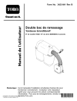 Form No. 3423-841 Rev B Double bac de ramassage Tondeuse GrandStand® N° de modèle 78524—N° de série 400000000 et suivants Remarque: Ce kit nécessite l'installation simultanée d'autres kits pour fonctionner correctement. Contactez votre réparateur agréé pour vous procurer les pièces correspondantes nécessaires. Pour plus de renseignements, rendez-vous Enregistrez votre produit à www.Toro.com. sur www.Toro.com. *3423-841* Traduction du texte d'origine (FR) ATTENTION CALIFORNIE Proposition 65 - Avertissement L'utilisation de ce produit peut entraîner une exposition à des substances chimiques considérées pas l'état de Californie comme capables de provoquer des cancers, des anomalies congénitales ou d'autres troubles de la reproduction. g256117 Figure 1 1. Emplacement des numéros de modèle et de série du ventilateur Introduction N° de modèle Lisez attentivement cette notice pour apprendre comment utiliser et entretenir correctement votre produit, et éviter ainsi de l'endommager ou de vous blesser. Vous êtes responsable de l'utilisation sûre et correcte du produit. N° de série Rendez-vous sur www.Toro.com pour tout document de formation à la sécurité et à l'utilisation des produits, pour tout renseignement concernant un produit ou un accessoire, pour obtenir l'adresse des concessionnaires ou pour enregistrer votre produit. Pour obtenir des prestations de service, des pièces d'origine Toro ou des renseignements complémentaires, munissez-vous des numéros de modèle et de série du produit et contactez un concessionnaire-réparateur agréé ou le service client Toro. La Figure 1 indique l'emplacement des numéros de modèle et de série sur le produit. Inscrivez les numéros dans l'espace réservé à cet effet. g256118 Figure 2 1. Emplacement des numéros de modèle et de série du système de ramassage Important: Avec votre appareil mobile, vous pouvez scanner le QR code sur l'autocollant du numéro de série (le cas échéant) pour accéder aux informations sur la garantie, les pièces détachées et autres renseignements concernant le produit. N° de modèle N° de série Les mises en garde de ce manuel soulignent des dangers potentiels et sont signalées par le symbole de sécurité (Figure 3), qui indique un danger pouvant entraîner des blessures graves ou mortelles si les précautions recommandées ne sont pas respectées. © 2025—The Toro® Company 8111 Lyndale Avenue South Bloomington, MN 55420 2 Contactez-nous sur www.Toro.com. Imprimé aux États-Unis Tous droits réservés Table des matières Sécurité .................................................................... 4 Autocollants de sécurité et d'instruction .............. 5 Mise en service ......................................................... 7 1 Préparation de la machine ............................... 8 2 Montage du kit ventilateur et entraînement E-Z Vac ........................................................... 8 3 Montage du ventilateur, de la courroie et du protège-courroie......................................... 8 4 Installation du kit d'amélioration du ramassage (option) ......................................... 9 5 Montage des supports ..................................... 9 6 Montage du cadre du système de ramassage .................................................... 12 7 Montage des bacs ......................................... 13 8 Montage du tube du système de ramassage .................................................... 13 9 Montage de la masse..................................... 15 Utilisation ................................................................ 16 Consignes de sécurité pendant l'utilisation ..................................................... 16 Positionnement du déflecteur d'éjection............ 16 Utilisation du système de ramassage................ 16 Utilisation de l'indicateur de remplissage........... 17 Conseils d'utilisation ......................................... 18 Vider les bacs à herbe ...................................... 19 Élimination des obstructions dans le système de ramassage ............................................... 20 Retrait du système de ramassage..................... 20 Transport de la machine ................................... 21 Entretien ................................................................. 22 Programme d'entretien recommandé .................. 22 Nettoyage du système de ramassage et des bacs .............................................................. 22 Contrôle de la courroie du système de ramassage .................................................... 22 Remplacement de la courroie du système de ramassage .................................................... 22 Contrôle du système de ramassage.................. 23 Contrôle des lames de coupe............................ 24 Montage des lames du plateau de coupe ............................................................ 24 Remisage ............................................................... 24 Dépistage des défauts ............................................ 25 g000502 Figure 3 1. Symbole de sécurité Ce manuel utilise deux termes pour faire passer des renseignements essentiels. Important pour attirer l'attention sur des informations d'ordre mécanique spécifiques et Remarque pour souligner des informations d'ordre général méritant une attention particulière. 3 Sécurité ATTENTION Des débris (feuilles, herbe ou broussailles) peuvent prendre feu. Un feu dans le compartiment moteur peut causer des brûlures et des dommages matériels. • Débarrassez le moteur et le silencieux des débris qui y sont déposés. • Lors de l'ouverture du couvercle du système de ramassage, veillez à ne pas faire tomber de débris sur le moteur et le silencieux. • Laissez refroidir la machine avant de la remiser. ATTENTION Pour éviter de vous blesser, procédez comme suit : • Familiarisez-vous avec toutes les instructions d