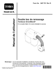 Form No. 3467-761 Rev B Double bac de ramassage Tondeuse GrandStand® N° de modèle 78524—N° de série 416433627 et suivants Remarque: Ce kit nécessite l'installation simultanée d'autres kits pour fonctionner correctement. Contactez votre réparateur agréé pour vous procurer les pièces correspondantes nécessaires. Pour plus de renseignements, visitez www.Toro.com. Enregistrez votre produit à www.Toro.com. Traduction du texte d'origine (FR) *3467-761* ATTENTION CALIFORNIE Proposition 65 - Avertissement L'utilisation de ce produit peut entraîner une exposition à des substances chimiques considérées pas l'état de Californie comme capables de provoquer des cancers, des anomalies congénitales ou d'autres troubles de la reproduction. g256117 Figure 1 1. Emplacement des numéros de modèle et de série du ventilateur Introduction N° de modèle Lisez attentivement cette notice pour apprendre comment utiliser et entretenir correctement votre produit, et éviter ainsi de l'endommager ou de vous blesser. Vous êtes responsable de l'utilisation sûre et correcte du produit. N° de série Rendez-vous sur www.Toro.com pour tout document de formation à la sécurité et à l'utilisation des produits, pour tout renseignement concernant un produit ou un accessoire, pour obtenir l'adresse des concessionnaires ou pour enregistrer votre produit. Pour obtenir des prestations de service, des pièces d'origine Toro ou des renseignements complémentaires, munissez-vous des numéros de modèle et de série du produit et contactez un concessionnaire-réparateur agréé ou le service client Toro. La Figure 1 indique l'emplacement des numéros de modèle et de série sur le produit. Inscrivez les numéros dans l'espace réservé à cet effet. g256118 Figure 2 1. Emplacement des numéros de modèle et de série du système de ramassage Important: Avec votre appareil mobile, vous pouvez scanner le QR code sur l'autocollant du numéro de série (le cas échéant) pour accéder aux informations sur la garantie, les pièces détachées et autres renseignements concernant le produit. N° de modèle N° de série Les mises en garde de ce manuel soulignent des dangers potentiels et sont signalées par le symbole de sécurité (Figure 3), qui indique un danger pouvant entraîner des blessures graves ou mortelles si les précautions recommandées ne sont pas respectées. © 2025—The Toro® Company 8111 Lyndale Avenue South Bloomington, MN 55420 2 Contactez-nous sur www.Toro.com. Imprimé aux États-Unis Tous droits réservés Table des matières Sécurité .................................................................... 4 Autocollants de sécurité et d'instruction .............. 5 Mise en service ......................................................... 7 1 Préparation de la machine ............................... 8 2 Montage du kit ventilateur et entraînement E-Z Vac ........................................................... 8 3 Montage du ventilateur, de la courroie et du protège-courroie......................................... 8 4 Installation du kit d'amélioration du ramassage (option) ......................................... 9 5 Montage des supports ..................................... 9 6 Montage du cadre du système de ramassage .................................................... 12 7 Montage des bacs ......................................... 13 8 Montage du tube du système de ramassage .................................................... 13 9 Montage de la masse..................................... 15 Utilisation ................................................................ 16 Consignes de sécurité pendant l'utilisation ..................................................... 16 Positionnement du déflecteur d'éjection............ 16 Utilisation du système de ramassage................ 16 Utilisation de l'indicateur de remplissage........... 17 Conseils d'utilisation ......................................... 18 Vider les bacs à herbe ...................................... 19 Élimination des obstructions dans le système de ramassage ............................................... 20 Retrait du système de ramassage..................... 20 Transport de la machine ................................... 21 Entretien ................................................................. 22 Programme d'entretien recommandé .................. 22 Nettoyage du système de ramassage et des bacs .............................................................. 22 Contrôle de la courroie du système de ramassage .................................................... 22 Remplacement de la courroie du système de ramassage .................................................... 22 Contrôle du système de ramassage.................. 23 Contrôle des lames de coupe............................ 24 Montage des lames du plateau de coupe ............................................................ 24 Remisage ............................................................... 24 Dépistage des défauts ............................................ 25 g000502 Figure 3 1. Symbole de sécurité Ce manuel utilise deux termes pour faire passer des renseignements essentiels. Important pour attirer l'attention sur des informations d'ordre mécanique spécifiques et Remarque pour souligner des informations d'ordre général méritant une attention particulière. 3 Sécurité ATTENTION Des débris (feuilles, herbe ou broussailles) peuvent prendre feu. Un feu dans le compartiment moteur peut causer des brûlures et des dommages matériels. • Débarrassez le moteur et le silencieux des débris qui y sont déposés. • Lors de l'ouverture du couvercle du système de ramassage, veillez à ne pas faire tomber de débris sur le moteur et le silencieux. • Laissez refroidir la machine avant de la remiser. ATTENTION Pour éviter de vous blesser, procédez comme suit : • Familiarisez-vous avec toutes les instructions d'utilisa