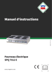 2025-07-25 Manuel d‘instructions Fourneau électrique SPQ 7012 E www.rmgastro.com FOURNEAU ÉLECTRIQUE · SPQ 7012 E · 00014772 OBSAH 1. DÉCLARATION DE CONFORMITÉ 3 2. DONNÉES TECHNIQUES 3 3. TABLEAU DES GAZ AUXQUELS LE PRODUIT EST DESTINÉ 3 4. EMPLACEMENT DE L'ÉLECTRICITÉ 5 5. EMPLACEMENT GAZ 5 6. MESURES DE SÉCURITÉ DU POINT DE VUE DE LA PROTECTION INCENDIE 5 7. INSTALLATION 6 8. CONTRÔLE DES PERFORMANCES THERMIQUES 6 9. RACCORDEMENT DU TUYAU DE RACCORDEMENT AU GAZ 7 10. RACCORDEMENT GAZ LIQUIDE 7 11. RACCORDEMENT D'EAU 7 12. CONNEXION DU CÂBLE ÉLECTRIQUE AU RÉSEAU 7 13. VÉRIFIER LES PARAMÈTRES DE L'APPAREIL POUR LE TYPE DE GAZ 8 14. MODE D‘EMPLOI 8 15. NETTOYAGE ET ENTRETIEN 9 2025-07-25 2 www.rmgastro.com FOURNEAU ÉLECTRIQUE · SPQ 7012 E · 00014772 1. DÉCLARATION DE CONFORMITÉ Décret du Ministère de santé. 38/21 Sb. Règlement 197/26/CE - Règlement REACH, 1935/24/CE - Règlement relatif au contact alimentaire. Les produits répondent aux exigences du §26 de la loi n° 258/2 telle qu’en vigeur. Les produits répondent aux exigences de la directive RoHS 215/863/UE, 1/211, 517/214, 215/194, 215/195. Attention, le fabricant décline toute responsabilité en cas de dommages directs ou indirects résultant d’une mauvaise installation, d’interventions ou de modifications inappropriées, d’un entretien insuffisant, d’une utilisation incorrecte, ou encore d’autres causes mentionnées dans les conditions générales de vente. Cet appareil est exclusivement destiné à un usage professionnel et doit être manipulé par des personnes qualifiées. Les parties qui ont été réglées et sécurisées par le fabricant ou un technicien agréé ne doivent pas être modifiées par l’utilisateur. 2. DONNÉES TECHNIQUES L’étiquette de données techniques est située sur le panneau latéral ou arrière de l’appareil. Avant l’installation, étudiez le schéma de câblage et toutes les informations suivantes dans les instructions ci-jointes. Largeur nette [mm] Profondeur nette [mm] Hauteur nette [mm] Poids net [kg] Puissance électrique [kW] Alimentation 1200 300 300 15.600 400 V / 3N - 50 Hz 65.00 La puissance thermique nominale maximale et réduite, exprimée en kW, est basée sur la valeur Hi du gaz utilisé. Si le produit est connecté au GPL, la bouteille de gaz doit se trouver dans des pièces suffisamment ventilées. 3. TABLEAU DES GAZ AUXQUELS LE PRODUIT EST DESTINÉ Version Catégorie de produits Pressions de raccordement (mbar) Gaz utilisé Pays de destination A1 I2E 20 G20 DE, NL, PL, RO A1 I2ELL 20, 20 G20,G25 DE A1 I2E+ 20/25 G20/G25 BE, FR A1 I2H 20 2025-07-25 3 www.rmgastro.com FOURNEAU ÉLECTRIQUE · SPQ 7012 E · 00014772 G20 AT, BG, CH, CZ, DK, HR, EE, ES, FI, GB, GR, IE, IT, LT, LV, NO, PT, RO, SE, SI, SK, TR, LU, CY , FR A1 I3B/P 30 G30 BG, CY, CZ, DK, GB, HR, EE, FI, FR, GR, HU, IT, LT, LV, MT, NL, NO, RO, SE, SI, SK, TR A1 I3B/P 50 G30 AT, DE, CZ, CH, FR, SK A1 I3P 37 G31 BE, CH, CZ, ES, GB, GR, IE, RO, SI, SK, FR, NL, PT, HR, IT, LT, PL, TR A1 I3+ 28-30/37 G30/G31 BE, CH, CY, CZ, EE, ES, FR, GB, GR, IE, IT, LT, PT, SI, SK, TR A1 II2E3B/P 20, 50 G20, G30 DE, PL, RO A1 II2ELL3B/P 20, 20, 50 G20, G25, G30 DE A1 II2E+3+ 20/25, 28-30/37 G20/G25, G30/G31 BE, FR A1 II2H3B/P 20, 30 G20, G30 BG, CZ, GB, DK, HR, EE, FI, GR, IT, LT, LV, NO, RO, SE, SI, SK, TR, CY, FR A1 II2H3B/P 2025-07-25 4 www.rmgastro.com FOURNEAU ÉLECTRIQUE · SPQ 7012 E · 00014772 20, 50 G20, G30 AT, CH, CZ, FR, SK A1 II2H3P 20, 37 G20, G31 CH, CZ, ES, GB, GR, IE, RO, SI, SK A1 II2H3+ 20, 28-30/37 G20, G30/G31 CH, CY, CZ, EE, ES, GB, GR, IE, IT, LT, PT, SK, SI, TR 4. EMPLACEMENT DE L'ÉLECTRICITÉ Pour le bon fonctionnement et le placement de l'appareil, il est nécessaire de respecter toutes les normes prescrites suivantes pour le marché concerné. Déballez l'appareil et vérifiez qu'il n'a pas été endommagé pendant le transport. Placez l'appareil sur une surface horizontale (dénivelé maximum jusqu'à 2°). Les petites irrégularités peuvent être nivelées avec des pieds réglables. Si l'appareil est placé de manière à être en contact avec les parois des meubles, ceux-ci doivent résister à une température allant jusqu'à 60°C. L'installation, le réglage, la mise en service doivent être effectués par une personne qualifiée et autorisée à effectuer de telles opérations, selon les normes en vigueur. L’appareil peut être installé individuellement ou en série avec d’autres appareils de notre fabrication. Une distance minimale de 10 cm doit être respectée par rapport aux matériaux inflammables. Dans ce cas, des aménagements appropriés doivent être prévus pour garantir une isolation thermique adéquate des parties inflammables. L'appareil doit être installé uniquement sur une surface ininflammable ou contre un mur ininflammable. Les composants de l’appareil sécurisés par le fabricant ou son représentant ne doivent pas être modifiés par le personnel effectuant l’installation de l’appareil. 5. EMPLACEMENT GAZ Pour un fonctionnement et un emplacement corrects de l'appareil, il est nécessaire de respecter toutes les directives et normes du pays en question. Déballez l'appareil et vérifiez qu'il n'a pas été endommagé pendant le transport. Placez l'appareil sur une surface horizontale (dénivelé maximum jusqu'à 2°). Les petites irrégularités peuvent être nivelées avec des pieds réglables. Si l'appareil est placé de manière à être en contact avec les parois des meubles, ceux-ci doivent résister à une température allant jusqu'à 60°C. L'installation, le réglage, la mise en service doivent être effectués par une personne qualifiée et autorisée à effectuer de telles opérations, selon les normes en vigueur. L'appareil peut être installé séparément ou en série avec des appareils de notre production. Une distance minimale de 10 cm doit être respectée par rapport aux matériaux inflammables. Dans ce cas, de