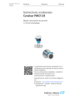 KA01462P/14/FR/06.25-00 71715243 2025-08-01 Products Solutions Services Instructions condensées Cerabar PMC51B Mesure de pression de process 4-20 mA analogique Les présentes instructions condensées ne se substituent pas au manuel de mise en service relatif à l'appareil. Pour les informations détaillées, consulter le manuel de mise en service et la documentation complémentaire. Disponible pour toutes les versions d'appareil via : • Internet : www.endress.com/deviceviewer • Smartphone / tablette : Endress+Hauser Operations App Documentation associée 1 Cerabar PMC51B 4-20 mA analogique Documentation associée 1. Order code: XXXXX-XXXXXX Ser. no.: XXXXXXXXXXXX Ext. ord. cd.: XXX.XXXX.XX Serial number 2. www.endress.com/deviceviewer Endress+Hauser Operations App 3. A0023555 2 Informations relatives au document 2.1 Fonction du document Les présentes instructions fournissent toutes les informations essentielles, de la réception des marchandises à la première mise en service. 2.2 Symboles 2.2.1 Symboles d'avertissement DANGER 2 Endress+Hauser Cerabar PMC51B 4-20 mA analogique Informations relatives au document Ce symbole signale une situation dangereuse. Si cette situation n'est pas évitée, cela entraînera des blessures graves ou mortelles. AVERTISSEMENT Ce symbole signale une situation potentiellement dangereuse. Si cette situation n'est pas évitée, cela peut entraîner des blessures graves ou mortelles. ATTENTION Ce symbole signale une situation potentiellement dangereuse. Si cette situation n'est pas évitée, cela peut entraîner des blessures mineures ou moyennes. AVIS Ce symbole signale une situation potentiellement dangereuse. Si cette situation n'est pas évitée, le produit ou un objet situé à proximité peut être endommagé. 2.2.2 Symboles électriques Prise de terre : Borne pour le raccordement au système de mise à la terre. 2.2.3 Symboles pour certains types d'information Autorisé : Procédures, processus ou actions qui sont autorisés. Interdit : Procédures, processus ou actions qui sont interdits. Informations complémentaires : Renvoi à la documentation : Renvoi à la page : Série d'étapes : 1. , 2. , 3. Résultat d'une étape individuelle : 2.2.4 Symboles utilisés dans les graphiques Numéros de position : 1, 2, 3 ... Série d'étapes : 1. , 2. , 3. Vues : A, B, C, ... 2.2.5 Symboles sur l'appareil Consignes de sécurité : Respecter les consignes de sécurité contenues dans le manuel de mise en service associé. Endress+Hauser 3 Exigences de sécurité de base 2.3 Cerabar PMC51B 4-20 mA analogique Marques déposées KALREZ® Marque déposée par la société DuPont Performance Elastomers L.L.C., Wilmington, USA 3 Exigences de sécurité de base 3.1 Exigences imposées au personnel Le personnel chargé de l'installation, de la mise en service, du diagnostic et de la maintenance doit remplir les conditions suivantes : ‣ Le personnel qualifié et formé doit disposer d'une qualification qui correspond à cette fonction et à cette tâche ‣ Être autorisé par le propriétaire/l'exploitant de l'installation ‣ Connaître les prescriptions nationales ‣ Avant le début du travail, lire et comprendre les instructions figurant dans le manuel de mise en service, la documentation complémentaire et les certificats (selon l'application) ‣ Suivre les instructions et respecter les conditions Le personnel d'exploitation doit remplir les conditions suivantes : ‣ Être formé et autorisé par le propriétaire/l'exploitant de l'installation conformément aux exigences liées à la tâche prévue ‣ Suivre les instructions du présent manuel de service 3.2 Utilisation conforme Le Cerabar est un transmetteur de pression destiné à la mesure de niveau et de pression. 3.2.1 Utilisation incorrecte Le fabricant décline toute responsabilité quant aux dommages résultant d'une utilisation non réglementaire ou non conforme à l'emploi prévu. Vérification des cas limites : ‣ Pour les fluides spéciaux et les fluides de nettoyage, Endress+Hauser fournit volontiers une assistance pour vérifier la résistance à la corrosion des matériaux en contact avec le fluide, mais n'accepte aucune garantie ou responsabilité. 3.3 Sécurité du travail Lors des travaux sur et avec l'appareil : ‣ Porter l'équipement de protection individuelle requis conformément aux réglementations nationales / locales. ‣ Couper la tension d'alimentation avant de raccorder l'appareil. 4 Endress+Hauser Cerabar PMC51B 4-20 mA analogique 3.4 Exigences de sécurité de base Sécurité de fonctionnement Risque de blessure ! ‣ Ne faire fonctionner l'appareil que s'il est en bon état technique, exempt d'erreurs et de défauts. ‣ L'exploitant est responsable du fonctionnement sans défaut de l'appareil. Transformations de l'appareil Les transformations effectuées sur l'appareil sans l'accord du fabricant ne sont pas autorisées et peuvent entraîner des dangers imprévisibles : ‣ Si des transformations sont malgré tout nécessaires, consulter au préalable Endress +Hauser. Réparation Afin de garantir la sécurité et la fiabilité de fonctionnement : ‣ N'effectuer des réparations de l'appareil que dans la mesure où elles sont expressément autorisées. ‣ Respecter les prescriptions nationales relatives à la réparation d'un appareil électrique. ‣ Utiliser exclusivement des pièces de rechange et des accessoires d'origine Endress+Hauser. Zone explosible Afin d'éviter la mise en danger de personnes ou de l'installation en cas d'utilisation de l'appareil dans la zone soumise à agrément (p. ex. protection antidéflagrante, sécurité des appareils sous pression) : ‣ Vérifier à l'aide de la plaque signalétique si l'appareil commandé peut être utilisé pour l'usage prévu dans la zone soumise à agrément. ‣ Respecter les consignes figurant dans la documentation complémentaire séparée, qui fait partie intégrante du présent manuel. 3.5 Sécurité du produ