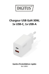 Chargeur USB GaN 30W, 1x USB-C, 1x USB-A Guide d'installa�on rapide DA-10301 Table des matières 1. 2. 3. 4. 5. 6. Introduc�on ..................................................... 3 Caractéris�ques................................................ 4 Contenu de l'emballage .................................... 4 Caractéris�ques techniques .............................. 4 Distribu�on de l'énergie ................................... 6 Aver�ssements/Instruc�ons de sécurité ........... 6 2 1. Introduc�on Le puissant chargeur GaN II de 30 watts associe un design compact à la dernière technologie de charge et met l'accent sur le développement durable. Avec un port USB-C qui délivre jusqu'à 30 watts et un port USB-A qui délivre jusqu'à 18 watts, il charge non seulement les smartphones, mais aussi les appareils gourmands en énergie tels que les tablettes ou les ordinateurs portables légers. Pour une flexibilité maximale, deux appareils peuvent être connectés en même temps - idéal pour charger des smartphones et des écouteurs en parallèle pendant les déplacements (jusqu'à 15 watts au total en cas d'utilisation simultanée). Grâce à la technologie moderne GaN II (nitrure de gallium), le chargeur USB fonctionne de manière particulièrement efficace et sûre tout en occupant un espace minimal. Par rapport aux chargeurs conventionnels, il offre plus de puissance dans un design plus compact - parfait pour une utilisation mobile, que ce soit au bureau, en voyage d'affaires ou en vacances. Un avantage particulier : Le boîtier robuste est fabriqué à partir de 98 % de matériaux PCR recyclés (recyclage post-consommation) et est emballé sans aucun plastique. Le chargeur allie donc hautes performances et durabilité. La puissance supplémentaire de 30 W fait de ce chargeur le compagnon idéal de tous ceux qui souhaitent que leur smartphone, mais aussi d'autres appareils plus volumineux, soient à nouveau prêts à l'emploi rapidement lorsqu'ils sont en déplacement. 3 Même pour les tablettes ou les écouteurs, ce chargeur fournit exactement la puissance dont vous avez besoin. Grâce à son format fin et robuste, le chargeur se glisse facilement dans n'importe quelle poche et est toujours à portée de main. Un chargeur qui allie performance, sécurité et durabilité dans un design intelligent - Pour tous ceux qui attendent plus que la norme. 2. Caractéris�ques Technologie moderne GaN II : Conception compacte, efficace et sûre Durable : 98 % de matériaux recyclés dans le boîtier en plastique et emballage 100 % sans plastique Compatibilité universelle : Tablettes, smartphones ou autres appareils USB 1x connexion USB-C - 30 watts max. 1x connexion USB-A - 18 watts max. Utilisation simultanée : USB-C + USB-A - 15 watts max. 3. Contenu de l'emballage Chargeur USB Mode d'emploi 4. Caractéris�ques techniques Puissance maximale avec une seule connexion USB-C max. 30W, USB-A max. 18W 4 Chargement de plusieurs appareils (2 ports) USB-C + USB-A (5V/3A) - 15W max. Protection contre les surintensités et les surcharges Tension d'entrée/courant nominal/fréquence Technologie GaN II (nitrure de gallium) pour une efficacité élevée, un faible dégagement de chaleur et une conception compacte Boîtier en plastique fabriqué à partir de 98 % de matériaux PCR recyclés, Emballage sans plastique Protec�on contre les surintensités, les courtscircuits et la surchauffe 100-240V / 1,0A / 50/60Hz Rendement actif moyen 81.5 % Consommation d'énergie en veille 0.1W Couleur du produit blanc Dimensions de l'appareil 3,9 x 8,4 x 2,7 cm Poids 61 g Technologie de charge Boîtier et emballage 5 5. Distribu�on d'énergie Sortie à un port Sortie à deux ports 6. Aver�ssements/Instruc�ons de sécurité 1. 2. 3. 4. Ne laissez pas les enfants ou les utilisateurs non autorisés toucher le produit. Le produit est uniquement destiné à une utilisation à l'intérieur. Garder le produit à l'abri de la pluie et de l'humidité. Tenir le produit à l'écart des récipients de liquide. 6 5. Ne démontez pas le produit et n'essayez pas d'ouvrir le boîtier de protection. Le contact avec des fils et des composants sous tension peut provoquer un choc électrique potentiellement mortel. 6. Ne couvrez pas le produit car il devient chaud lorsqu'il est utilisé. Placez le produit dans un espace ouvert avec une circulation d'air pour une ventilation optimale. N'exposez pas le produit à des conditions de chaleur extrême. 7. Veillez à ce que le produit ne soit pas endommagé physiquement pendant son fonctionnement et son stockage. 8. Retirez le chargeur directement du mur. Lorsque vous retirez le chargeur du mur, ne tirez pas sur le câble. Le chargeur doit toujours être facilement accessible. 9. Si le couvercle de protection ou le câble du produit est endommagé, veuillez cesser d'utiliser le produit. 10. Ne réparez pas le produit vous-même, contacteznous si vous avez des problèmes ou des questions. 11. Veuillez vous référer à l'étiquette apposée sur l'appareil pour connaître les valeurs nominales d'entrée et de sortie. Ne surchargez pas l'alimentation électrique. 7 Par la présente, Assmann Electronic GmbH déclare que la déclaration de conformité fait partie du contenu de l'envoi. Si la déclaration de conformité est manquante, vous pouvez la demander par courrier à l'adresse du fabricant mentionnée ci-dessous. [email protected] ASSMANN Electronic GmbH Auf dem Schüffel 3 58513 Lüdenscheid Allemagne 8 ">