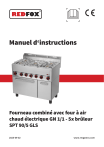 Manuel d‘instructions Fourneau combiné avec four à air chaud électrique GN 1/1 - 5x brûleur SPT 90/5 GLS 2025-09-02 www.rmgastro.com FOURNEAU COMBINÉ AVEC FOUR À AIR CHAUD ÉLECTRIQUE GN 1/1 - 5X BRÛLEUR · SPT 90/5 GLS · 00002056 OBSAH 1. DÉCLARATION DE CONFORMITÉ 3 2. DONNÉES TECHNIQUES 3 3. TABLEAU DES GAZ AUXQUELS LE PRODUIT EST DESTINÉ 3 4. EMPLACEMENT DE L'ÉLECTRICITÉ 5 5. EMPLACEMENT GAZ 5 6. MESURES DE SÉCURITÉ DU POINT DE VUE DE LA PROTECTION INCENDIE 6 7. INSTALLATION 6 8. CONTRÔLE DES PERFORMANCES THERMIQUES 7 9. RACCORDEMENT DU TUYAU DE RACCORDEMENT AU GAZ 7 10. RACCORDEMENT GAZ LIQUIDE 7 11. RACCORDEMENT D'EAU 7 12. CONNEXION DU CÂBLE ÉLECTRIQUE AU RÉSEAU 7 13. VÉRIFIER LES PARAMÈTRES DE L'APPAREIL POUR LE TYPE DE GAZ 8 14. KONTROLA NASTAVENÍ PŘÍSTROJE NA DRUH PLYNU 8 15. NÁVOD K POUŽITÍ 9 16. NETTOYAGE ET ENTRETIEN 10 2025-09-02 2 www.rmgastro.com FOURNEAU COMBINÉ AVEC FOUR À AIR CHAUD ÉLECTRIQUE GN 1/1 - 5X BRÛLEUR · SPT 90/5 GLS · 00002056 1. DÉCLARATION DE CONFORMITÉ Décret du Ministère de santé. 38/21 Sb. Règlement 197/26/CE - Règlement REACH, 1935/24/CE - Règlement relatif au contact alimentaire. Les produits répondent aux exigences du §26 de la loi n° 258/2 telle qu’en vigeur. Les produits répondent aux exigences de la directive RoHS 215/863/UE, 1/211, 517/214, 215/194, 215/195. Attention, le fabricant décline toute responsabilité en cas de dommages directs ou indirects résultant d’une mauvaise installation, d’interventions ou de modifications inappropriées, d’un entretien insuffisant, d’une utilisation incorrecte, ou encore d’autres causes mentionnées dans les conditions générales de vente. Cet appareil est exclusivement destiné à un usage professionnel et doit être manipulé par des personnes qualifiées. Les parties qui ont été réglées et sécurisées par le fabricant ou un technicien agréé ne doivent pas être modifiées par l’utilisateur. 2. DONNÉES TECHNIQUES L’étiquette de données techniques est située sur le panneau latéral ou arrière de l’appareil. Avant l’installation, étudiez le schéma de câblage et toutes les informations suivantes dans les instructions ci-jointes. Largeur nette [mm] Profondeur nette [mm] Hauteur nette [mm] Poids net [kg] 988 900 900 85.00 Puissance électrique [kW] Alimentation Puissance gaz [kW] Type de four 3.130 230 V / 1N - 50 Hz 22.500 Électrique, à chaleur tournant La puissance thermique nominale maximale et réduite, exprimée en kW, est basée sur la valeur Hi du gaz utilisé. Si le produit est connecté au GPL, la bouteille de gaz doit se trouver dans des pièces suffisamment ventilées. 3. TABLEAU DES GAZ AUXQUELS LE PRODUIT EST DESTINÉ Version Catégorie de produits Pressions de raccordement (mbar) Gaz utilisé Pays de destination A1 I2E 20 G20 DE, NL, PL, RO A1 I2ELL 20, 20 G20,G25 DE A1 I2E+ 20/25 G20/G25 BE, FR A1 2025-09-02 3 www.rmgastro.com FOURNEAU COMBINÉ AVEC FOUR À AIR CHAUD ÉLECTRIQUE GN 1/1 - 5X BRÛLEUR · SPT 90/5 GLS · 00002056 I2H 20 G20 AT, BG, CH, CZ, DK, HR, EE, ES, FI, GB, GR, IE, IT, LT, LV, NO, PT, RO, SE, SI, SK, TR, LU, CY , FR A1 I3B/P 30 G30 BG, CY, CZ, DK, GB, HR, EE, FI, FR, GR, HU, IT, LT, LV, MT, NL, NO, RO, SE, SI, SK, TR A1 I3B/P 50 G30 AT, DE, CZ, CH, FR, SK A1 I3P 37 G31 BE, CH, CZ, ES, GB, GR, IE, RO, SI, SK, FR, NL, PT, HR, IT, LT, PL, TR A1 I3+ 28-30/37 G30/G31 BE, CH, CY, CZ, EE, ES, FR, GB, GR, IE, IT, LT, PT, SI, SK, TR A1 II2E3B/P 20, 50 G20, G30 DE, PL, RO A1 II2ELL3B/P 20, 20, 50 G20, G25, G30 DE A1 II2E+3+ 20/25, 28-30/37 G20/G25, G30/G31 BE, FR A1 II2H3B/P 20, 30 G20, G30 BG, CZ, GB, DK, HR, EE, FI, GR, IT, LT, LV, NO, RO, SE, SI, SK, TR, CY, FR 2025-09-02 4 www.rmgastro.com FOURNEAU COMBINÉ AVEC FOUR À AIR CHAUD ÉLECTRIQUE GN 1/1 - 5X BRÛLEUR · SPT 90/5 GLS · 00002056 A1 II2H3B/P 20, 50 G20, G30 AT, CH, CZ, FR, SK A1 II2H3P 20, 37 G20, G31 CH, CZ, ES, GB, GR, IE, RO, SI, SK A1 II2H3+ 20, 28-30/37 G20, G30/G31 CH, CY, CZ, EE, ES, GB, GR, IE, IT, LT, PT, SK, SI, TR 4. EMPLACEMENT DE L'ÉLECTRICITÉ Pour le bon fonctionnement et le placement de l'appareil, il est nécessaire de respecter toutes les normes prescrites suivantes pour le marché concerné. Déballez l'appareil et vérifiez qu'il n'a pas été endommagé pendant le transport. Placez l'appareil sur une surface horizontale (dénivelé maximum jusqu'à 2°). Les petites irrégularités peuvent être nivelées avec des pieds réglables. Si l'appareil est placé de manière à être en contact avec les parois des meubles, ceux-ci doivent résister à une température allant jusqu'à 60°C. L'installation, le réglage, la mise en service doivent être effectués par une personne qualifiée et autorisée à effectuer de telles opérations, selon les normes en vigueur. L’appareil peut être installé individuellement ou en série avec d’autres appareils de notre fabrication. Une distance minimale de 10 cm doit être respectée par rapport aux matériaux inflammables. Dans ce cas, des aménagements appropriés doivent être prévus pour garantir une isolation thermique adéquate des parties inflammables. L'appareil doit être installé uniquement sur une surface ininflammable ou contre un mur ininflammable. Les composants de l’appareil sécurisés par le fabricant ou son représentant ne doivent pas être modifiés par le personnel effectuant l’installation de l’appareil. 5. EMPLACEMENT GAZ Pour un fonctionnement et un emplacement corrects de l'appareil, il est nécessaire de respecter toutes les directives et normes du pays en question. Déballez l'appareil et vérifiez qu'il n'a pas été endommagé pendant le transport. Placez l'appareil sur une surface horizontale (dénivelé maximum jusqu'à 2°). Les petites irrégularités peuvent être nivelées avec des pieds réglables. Si l'appareil est placé de manière à être en contact avec les parois des meubles, ceux-ci doivent résister à une température allant ju