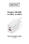 Chargeur USB 20W, 1x USB-C, 1x USB-A Guide d'installa�on rapide DA-10300 Table des matières 1. 2. 3. 4. 5. 6. Introduc�on ..................................................... 3 Caractéris�ques................................................ 4 Contenu de l'emballage .................................... 4 Caractéris�ques techniques .............................. 4 Distribu�on de l'énergie ................................... 6 Aver�ssements/Instruc�ons de sécurité ........... 6 2 1. Introduc�on Le chargeur USB compact de 20 watts associe un design moderne à une technologie pionnière et à une orientation claire vers le développement durable. Équipé d'un puissant port USB-C (jusqu'à 20 watts) et d'un port USB-A (jusqu'à 18 watts), il offre une flexibilité maximale pour une large gamme d'appareils. Même lorsque les deux ports sont utilisés en même temps, le chargeur délivre jusqu'à 15 watts de puissance totale - Idéal pour charger un smartphone et des écouteurs en parallèle, par exemple. Grâce à sa conception sophistiquée et à sa technologie efficace, le chargeur est particulièrement fiable. Par rapport aux modèles conventionnels, il séduit par son design compact et sa bonne utilisation de l'énergie - idéal pour les voyages, le bureau ou l'utilisation quotidienne à la maison. Point fort : le boîtier est fabriqué à partir de 98 % de matériaux recyclés PCR (post-consumer recycling) et l'emballage est 100 % sans plastique, ce qui en fait un choix durable pour les utilisateurs soucieux de l'environnement. La compatibilité universelle fait de ce chargeur un outil polyvalent pour les smartphones, les tablettes, les écouteurs Bluetooth, etc. Il suffit de le brancher et de le charger sans souci - C'est ainsi que l'alimentation en énergie moderne est facile. Grâce à son design robuste et peu encombrant, le chargeur se glisse dans n'importe quel sac et est toujours à portée de main, que ce soit lors d'un voyage d'affaires, en vacances ou dans la vie de tous les jours. 3 Un chargeur qui allie performance, sécurité et durabilité dans un format compact - Pour ceux qui en attendent plus. 2. Caractéris�ques Conception compacte, efficace et sûre Durable : 98 % de matériaux recyclés dans le boîtier en plastique et emballage 100 % sans plastique Compatibilité universelle : tablettes, smartphones ou autres appareils USB 1x connexion USB-C - 20 watts max. 1x connexion USB-A - 18 watts max. Utilisation simultanée : USB-C + USB-A - 15 watts max. 3. Contenu de l'emballage Chargeur USB Mode d'emploi 4. Caractéris�ques techniques Puissance maximale avec une seule connexion Chargement multiappareils (2 ports) USB-C + USB-A USB-C max. 20W, USB-A max. 18W (5V/3A) - 15W max. 4 Boîtier et emballage Boîtier en plastique fabriqué à partir de matériaux PCR recyclés à 98 %, emballage sans plastique. Protection contre les surintensités et les courts-circuits Protec�on contre les surintensités, les courtscircuits et la surchauffe Tension d'entrée/courant nominal/fréquence Rendement actif moyen Consommation d'énergie en veille 100-240V / 0,8A / 50/60Hz 85.5 % 0.1W Couleur du produit blanc Dimensions de l'appareil 3,9 x 8,4 x 2,7 cm Poids 57 g 5 5. Distribu�on de l'alimenta�on Sortie à un port Sortie à deux ports 6. Aver�ssements/Instruc�ons de sécurité 1. 2. 3. 4. Ne laissez pas les enfants ou les utilisateurs non autorisés toucher le produit. Le produit est uniquement destiné à une utilisation à l'intérieur. Garder le produit à l'abri de la pluie et de l'humidité. Tenir le produit à l'écart des récipients de liquide. 6 5. Ne démontez pas le produit et n'essayez pas d'ouvrir le boîtier de protection. Le contact avec des fils et des composants sous tension peut provoquer un choc électrique potentiellement mortel. 6. Ne couvrez pas le produit car il devient chaud lorsqu'il est utilisé. Placez le produit dans un espace ouvert avec une circulation d'air pour une ventilation optimale. N'exposez pas le produit à des conditions de chaleur extrême. 7. Veillez à ce que le produit ne soit pas endommagé physiquement pendant son fonctionnement et son stockage. 8. Retirez le chargeur directement du mur. Lorsque vous retirez le chargeur du mur, ne tirez pas sur le câble. Le chargeur doit toujours être facilement accessible. 9. Si la housse de protection ou le câble du produit est endommagé, veuillez cesser d'utiliser le produit. 10. Ne réparez pas le produit vous-même, contacteznous si vous avez des problèmes ou des questions. 11. Veuillez vous référer à l'étiquette apposée sur l'appareil pour connaître les valeurs nominales d'entrée et de sortie. Ne surchargez pas l'alimentation électrique. 7 Par la présente, Assmann Electronic GmbH déclare que la déclaration de conformité fait partie du contenu de l'envoi. Si la déclaration de conformité est manquante, vous pouvez la demander par courrier à l'adresse du fabricant mentionnée ci-dessous. [email protected] ASSMANN Electronic GmbH Auf dem Schüffel 3 58513 Lüdenscheid Allemagne 8 ">