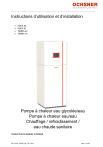 Instructions d’utilisation et d’installation AQUA 54 AQUA 97 TERRA 40 TERRA 76 Pompe à chaleur eau glycolée/eau Pompe à chaleur eau/eau Chauffage / refroidissement / eau chaude sanitaire TRADUCTION DU MANUEL D’ORIGINE BIA_AQUA_TERRA_M6_FR11.docx page 1 sur 68 Table des matières 1 1.1 1.1.1 1.1.2 1.2 1.3 Informations générales...........................4 À propos de la documentation........................ 4 Symboles et risques ....................................... 4 Autres symboles ............................................. 4 Utilisation conforme ........................................ 4 Consignes de sécurité .................................... 4 2 2.1 2.1.1 2.2 2.2.1 Description de l’appareil .........................5 Fonction ......................................................... 5 Circuit frigorifique ........................................... 5 Pompe à chaleur ............................................ 6 Structure......................................................... 6 3 Installation ..............................................6 3.1 Livraison ......................................................... 6 3.2 Transport ........................................................ 6 3.3 Cote de basculement de l’unité intérieure ...... 6 3.4 Choix du lieu d’implantation ........................... 6 3.4.1 Superficie minimale libre au sol dans le local d’implantation ............................................................... 7 3.4.2 Mesures de réduction de l’espace nécessaire à l’implantation................................................................. 8 4 Raccordement électrique ........................9 4.1 Liste de contrôle : ........................................... 9 4.2 Directives ..................................................... 10 4.3 Détails pour l’alimentation électrique ............ 11 4.4 Smart Grid .................................................... 11 4.5 Contact de signalisation SDE ....................... 11 4.6 Tarif sans interruption................................... 11 4.7 Coupure par un contacteur tarifaire .............. 11 4.8 Tarif nocturne ............................................... 12 4.9 Câblage des sondes..................................... 12 4.10 Pompes, entraînements 230 V CA ............... 12 4.11 Limiteur de sécurité du circuit de chauffage . 12 4.12 Chauffage d’appoint pour l’eau chaude sanitaire 12 4.13 Boîtier électrique Terra ................................. 13 5 5.1 5.2 5.3 5.3.1 5.3.2 5.4 5.5 Raccordement hydraulique ...................14 Raccordement du chauffage ........................ 14 Qualité de l’eau ............................................ 14 Système de maintien de la pression............. 14 Version avec rafraîchissement ..................... 14 Version refroidissement passif ..................... 15 Principes de dimensionnement .................... 15 Raccordement de l’installation côté secondaire 16 5.5.1 Débit volumique nominal (WNA) .................. 16 5.5.2 Mesure du débit WNA .................................. 16 5.6 Réglage du débit .......................................... 16 5.6.1 Débit de l’installation côté secondaire .......... 16 5.6.1 Débit de l’installation de source de chaleur .. 18 5.7 Raccordement de la source d’énergie eau ... 19 5.7.1 Qualité de l’eau ............................................ 19 5.7.2 Mesure du débit nappe phréatique ............... 19 5.8 Raccordement de la source d’énergie eau glycolée 21 5.8.1 Collecteurs géothermiques........................... 21 5.8.2 Fluide caloporteur (circuit d’eau glycolée) .... 21 5.9 Mesure du débit eau glycolée ...................... 22 5.9.1 Puisard de collecte ....................................... 22 6 6.1 6.1.1 Première mise en marche .....................23 Avant la toute première mise en marche ...... 23 Contrôle du circuit électrique de commande 23 BIA_AQUA_TERRA_M6_FR11.docx 7 7.1 7.2 7.3 7.3.1 Achèvement et mise en service............ 23 Conditions requises ...................................... 23 Achèvement de l’installation ......................... 25 Mise en service de l’installation .................... 25 Opérations réalisées par OCHSNER ............ 26 8 8.1 8.2 8.3 8.3.1 8.3.2 8.3.3 8.4 8.4.1 8.4.2 8.5 8.6 Commande de l’installation .................. 27 Menus ........................................................... 27 Fonctions de sécurité.................................... 28 Fonctionnement de l’appareil........................ 28 Circuit de chauffage ...................................... 28 Eau chaude sanitaire .................................... 28 Fonction anti-légionellose ............................. 28 Mode de fonctionnement de l’installation ...... 28 Coûts de fonctionnement .............................. 28 Températures départ .................................... 28 Aération ........................................................ 28 Mode séchage de chape .............................. 28 9 9.1 9.2 9.3 Résolution de problèmes ...................... 29 Codes d’erreur OTE...................................... 30 Procédure en cas de panne.......................... 32 Éliminer les menus défauts par vous-même . 32 10 10.1 10.2 10.3 10.4 Maintenance ......................................... 33 Travaux de maintenance .............................. 33 Nettoyage ..................................................... 33 Service après-vente ...................................... 34 Contrat de maintenance ............................... 34 11 11.1 11.2 11.3 Environnement et recyclage ................ 34 Mise au rebut de l’emballage ........................ 34 Mise hors service .......................................... 34 Mise au rebut de l’appareil............................ 34 12 Annexe .................................................. 35 12.1 Caractéristiques techniques AQUA .