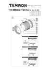 TLM-B061-FR-C/T-2507-04 Model: B061 Owner’s manual 18-300mm F/3.5-6.3 Di III-A VC VXD For Sony E-mount (APS-C) For FUJIFILM X mount (APS-C) For Nikon Z mount (APS-C) For CANON RF mount (APS-C) Sony E-mount FUJIFILM X mount Nikon Z mount CANON RF mount CANON RF mount 5 5 2 3 For FUJIFILM X Mount Lens FreeRTOS Kernel V10.3.1 Copyright (C) 2020 Amazon.com, Inc. or its affiliates. All Rights Reserved. Permission is hereby granted, free of charge, to any person obtaining a copy of this software and associated documentation files (the “Software”), to deal in the Software without restriction, including without limitation the rights to use, copy, modify, merge, publish, distribute, sublicense, and/or sell copies of the Software, and to permit persons to whom the Software is furnished to do so, subject to the following conditions: The above copyright notice and this permission notice shall be included in all copies or substantial portions of the Software. THE SOFTWARE IS PROVIDED “AS IS”, WITHOUT WARRANTY OF ANY KIND, EXPRESS OR IMPLIED, INCLUDING BUT NOT LIMITED TO THE WARRANTIES OF MERCHANTABILITY, FITNESS FOR A PARTICULAR PURPOSE AND NONINFRINGEMENT. IN NO EVENT SHALL THE AUTHORS OR COPYRIGHT HOLDERS BE LIABLE FOR ANY CLAIM, DAMAGES OR OTHER LIABILITY, WHETHER IN AN ACTION OF CONTRACT, TORT OR OTHERWISE, ARISING FROM, OUT OF OR IN CONNECTION WITH THE SOFTWARE OR THE USE OR OTHER DEALINGS IN THE SOFTWARE. http://www.FreeRTOS.org http://aws.amazon.com/freertos * The Marking is a directive conformity mark of the European Community (EC). * Das -Zeichen entspricht der EC Norm. * La marquage est un marquage de conformité à la direcive CEE (CE). * La marca es marca de conformidad segun directiva de la Comunidad Europea (CE). * Il marchio attesta la conformita alla directtiva della Comunità Europea (CEE). * 标志表示符合欧州共同体 (EC) 指标 The EEC Conformity Report applies to the Council Directive 2014/30/EU, 2011/65/EU and is used by Tamron Co., Ltd., manufacturer of this product. Important information about software: https://s3-ap-northeast-1.amazonaws.com/tamron-docs/consumer/support/download/inst/b061_oss.pdf FRANÇAIS Nous vous remercions d’avoir acheté cet objectif Tamron. Avant d’utiliser votre nouvel objectif, veuillez lire attentivement ce mode d’emploi pour vous familiariser avec son utilisation. De plus, il est important de lire le manuel de l’appareil photo auquel vous allez fixer l’objectif. Après avoir lu ce mode d’emploi, rangez-le dans un endroit sûr. Veuillez également lire le document « Précautions pour une utilisation en toute sécurité des objectifs Tamron » pour connaître les précautions de sécurité détaillées à observer lors de l’utilisation des objectifs Tamron. • Ce symbole indique les précautions à prendre pour éviter des problèmes. • Ce symbole indique des informations à connaître en complément des opérations de base. NOMENCLATURE DES PIÈCES (Voir fig. 1) ① Pare-soleil d’objectif ② Repère d’alignement du pare-soleil ③ Repère de verrouillage du pare-soleil ④ Bague de filtre ⑤ Repere de deblocage du pare-soleil ⑥ Bague de zoom ⑦ Échelle de distance focale ⑧ Repère de distance focale ⑨ Bague de mise au point* ⑩ Commutateur de verrouillage de zoom ⑪ Repère de fixation d’objectif ⑫ Contacts d’interface entre l’objectif et l’appareil photo ⑬ Port de connexion (pour Nikon Z mount / CANON RF mount) ⑭ Commutateur AF/MF (pour CANON RF mount) ⑮ Commutateur VC (Compensation des vibrations) (pour CANON RF mount) * Correspond à la bague de contrôle sur Nikon Z mount. SPÉCIFICATIONS PRINCIPALES Modèle Distance focale Ouverture maximale Angle de vue (diagonal) Construction optique Distance focale minimale Rapport de grossissement maximal Taille de filtre Diamètre maximal Longueur Poids Taille de capteur Pare-soleil d’objectif Connecteur type (pour Nikon Z mount / CANON RF mount) B061 18 - 300 mm F/3,5-6,3 77°24' - 5°30' / Sony E-mount / FUJIFILM X mount / Nikon Z mount , 73°49' - 5°10' / CANON RF mount 15/19 *1 0,15 m (objectif grand angle) / 0,99 m (objectif telescopique) 1:2 (Distance focale minimale en utilisant un objectif grand angle) 1:4 (Distance focale minimale en utilisant un objectif télescopique) ø 67 mm ø 75,5 mm 125,6 mm / Sony E-mount, 125,8 mm / FUJIFILM X mount, 127,6 mm / Nikon Z mount, 123,6 mm / CANON RF mount 620 g / Sony E-mount / FUJIFILM X mount , 635 g / Nikon Z mount, 625 g / CANON RF mount APS-C HA036 USB Type-C • Longueur : distance de l’extrémité avant de l’objectif à la surface de la monture. • Les caractéristiques, l’apparence, les fonctions, etc., sont sujettes à modifications sans préavis. *1 Comme la qualité de l’image diminue à la périphérie de l’écran lorsque la distance focale est comprise entre 0,15 m et 0,2 m, faites la mise au point au centre de l’écran. Faites également attention à ce que le ltre ou l’objectif ne touche pas le sujet lors de la prise de vue à distance rapprochée. FIXATION ET RETRAIT DE L’OBJECTIF Retirez le cache arrière de l’objectif. Alignez le repère de fixation d’objectif ⑪ et le repère de montage sur l’appareil photo, puis insérez l’objectif. Tournez l’objectif dans le sens horaire pour Sony E-mount / FUJIFILM X mount / CANON RF mount ou dans le sens antihoraire pour Nikon Z mount jusqu’à ce qu’il se verrouille. Pour retirer l’objectif, tournez l’objectif dans le sens opposé tout en appuyant sur le bouton de déblocage sur l’appareil photo. • Éteignez l’appareil photo avant de fixer ou de retirer l’objectif. • Pour les détails, veuillez lire le manuel d’instructions de votre appareil photo. COMMUTATION AU MODE DE MISE AU POINT (Voir fig. 1, 2) Pour Sony E-mount / FUJIFILM X mount / Nikon Z mount Sélectionnez le mode de mise au point souhaité sur l’appareil photo. Pour effectuer une mise au point manuelle, tournez la bague de m