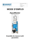 Numéro document: 12746F Version: 5 Valable à partir de: 11.08.2025 MODE D'EMPLOI AquaMaster avec AquaScat 2 P Ensemble de mesure multi paramètre Copyright© chez SIGRIST-PHOTOMETER SA., sous réserve de modifications techniques 08/20258/2025 SIGRIST-PHOTOMETER SA Hofurlistrasse 1 CH-6373 Ennetbürgen Suisse Tel. +41 41 624 54 54 Fax +41 41 624 54 55 [email protected] www.sigrist.com Contenu Mode d'emploi AquaMaster Contenu 12746F/5 1 Informations pour l‘utilisateur ........................................................................................ 7 1.1 Termes techniques utilisés (glossaire) ................................................................ 7 1.2 But du mode d‘emploi ...................................................................................... 7 1.3 Destinataires de la documentation .................................................................... 7 1.4 Documents complémentaires ............................................................................ 7 1.5 Droits d‘auteur ................................................................................................. 7 1.6 Lieu de conservation du document ................................................................... 7 1.7 Demande ultérieure du document .................................................................... 8 1.8 Utilisation conforme à l’emploi prévu ................................................................ 8 1.9 Exigences à l'utilisateur ..................................................................................... 8 1.10 Déclaration de conformité ................................................................................ 8 1.11 Restrictions d‘utilisation .................................................................................... 8 1.12 Risques encourus lors d’une utilisation non conforme à l’emploi prévu ............. 9 1.13 Signification des symboles de sécurité............................................................... 9 1.14 Signification des pictogrammes ...................................................................... 10 2 Description .................................................................................................................. 11 2.1 Vue d‘ensemble AquaMaster avec AquaScat 2 P............................................. 11 2.2 Identification du photomètre .......................................................................... 12 2.3 Identification de la boîte de connexion ........................................................... 13 2.4 Etendue de fourniture et accessoires ............................................................... 14 2.5 Caractéristiques techniques AquaMaster ........................................................ 17 3 Indications générales de sécurité ................................................................................. 22 3.1 Risques encourus lors de l’utilisation conforme à l’emploi prévu ..................... 22 3.2 Empêcher des interventions malvenues par Internet ........................................ 23 3.3 Risque restant ................................................................................................. 24 3.4 Symboles d’avertissement et de danger sur l‘appareil ..................................... 24 4 Montage et installation................................................................................................ 25 4.1 Indications de sécurité pour le raccordement électrique .................................. 25 4.2 Evaluation du lieu d‘installation....................................................................... 25 4.3 Monter le support mural ................................................................................. 26 4.4 Raccorder la boîte de connexion ..................................................................... 27 4.5 Position de la boîte de connexion ................................................................... 29 4.6 Fixer le photomètre sur le support de base...................................................... 30 4.7 Raccordement des liaisons électriques ............................................................. 31 4.8 Installer des sondes (avant mise en route) ....................................................... 34 4.9 Raccorder l’eau ............................................................................................... 37 4.10 Montage du débitmètre en option .................................................................. 38 5 Mise en service ............................................................................................................ 39 6 Maniement .................................................................................................................. 41 6.1 Généralités du maniement .............................................................................. 41 6.2 Eléments de commande en service de mesure ................................................ 42 6.3 Touche Menu ................................................................................................. 42 6.4 Touche Val. (valeur) ........................................................................................ 42 6.5 Touche Info .................................................................................................... 43 6.5.1 Page 2 touche Info .................................................................................... 43 6.5.2 Page 2 touche Info .................................................................................... 44 6.5.3 Page 3 Touche Info .................................................................................... 45 6.6 Touche Graph ................................................................................................. 46 6.7 Fonctions de l'écran Log (touche Log) ............................................................. 47 6.8 Affichages en mode mesure .............