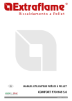 FR MADE IN ITALY MANUEL UTILISATEUR POÊLES À PELLET COMFORT P70 H49 5.0 design & production 004330012 - Rev 000 APPLIQUER ÉTIQUETTE DONNÉES TECHNIQUES 2 FRANCAIS ATTENTION LES SURFACES PEUVENT DEVENIR TRÈS CHAUDES ! UTILISER TOUJOURS DES GANTS DE PROTECTION ! Une énergie thermique est emprisonnée pendant la combustion et rend les surfaces, les portes, les poignées, les commandes, les vitres, le tuyau d’évacuation des fumées et éventuellement la partie antérieure de l’appareil considérablement chaudes. Il ne faut pas toucher les éléments en question sans être muni de vêtements de protection (gants de protection fournis). Il faut faire en sorte de bien expliquer ce danger aux enfants et de ne pas les faire approcher du foyer pendant le fonctionnement FRANÇAIS.............................................................................................................................................................................................................4 MISES EN GARDE..................................................................................................................................................................................................4 SÉCURITÉ..............................................................................................................................................................................................................4 ENTRETIEN ORDINAIRE.......................................................................................................................................................................................6 INSTALLATION......................................................................................................................................................................................................7 DÉTAILS INSERTO COMFORT P70 H49 5.0.......................................................................................................................................................10 INSTALLATION INSERTO COMFORT P70 H49 5.0............................................................................................................................................11 GÉNÉRALITÉS.................................................................................................................................................................................................................................................11 DIMENSIONS MINIMALES.........................................................................................................................................................................................................................11 INSTALLATION...............................................................................................................................................................................................................................................12 CADRE INFÉRIEUR .............................................................................................................................................................................................13 CONDUIT DE RENOUVELLEMENT DE L'AIR......................................................................................................................................................14 INSTALLATION EXISTANTE........................................................................................................................................................................................................................14 NOUVELLE INSTALLATION........................................................................................................................................................................................................................15 VERROU DE SÉCURITÉ.......................................................................................................................................................................................16 EXTRACTION DE L’INSERT ET CHARGEMENT DU PELLET..............................................................................................................................17 PELLET ET CHARGEMENT..................................................................................................................................................................................17 ACCESSOIRES DE CHARGEMENT EN OPTION.................................................................................................................................................18 KIT DE CHARGEMENT FRONTAL DU PELLET.....................................................................................................................................................................................18 KIT DE CHARGEMENT DE PELLET SUPÉRIEUR/LATÉRAL..............................................................................................................................................................18 RÉARMEMENT THERMOSTAT À BULBE............................................................................................................................................................18 FUSIBLE...............................................................................................................................................................................................................18 POSITIONNEMENT DU POÊLE..........................................................................................................................................................................19 NOTES POUR LE FONCTIONNEMENT CORRECT .............................................................................................................................................19 MODULE URGENCE.....................................................................................................................................................................